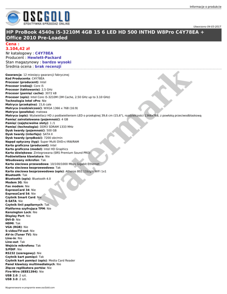 Informacje o produkcie Utworzono 04-03-2017 HP ProBook 4540s i5-3210M 4GB 15 6 LED HD 500 INTHD W8Pro C4Y78EA + Office 2010 Pre-Loaded Cena : 3.104,42 zł Nr katalogowy : C4Y78EA Producent : Hewlett-Packard Stan magazynowy : bardzo wysoki Średnia ocena : brak recenzji w at er m ar k Gwarancja: 12 miesięcy gwarancji fabrycznej Kod Producenta: C4Y78EA Procesor (producent): Intel Procesor (rodzaj): Core i5 Procesor (taktowanie): 2,5 GHz Procesor (pamięć cache): 3072 kB Procesor (opis): Intel Core i5-3210M (3M Cache, 2.50 GHz up to 3.10 GHz) Technologia Intel vPro: Nie Matryca (przekątna): 15,6 cale Matryca (rozdzielczość): WXGA 1366 x 768 (16:9) Matryca (powłoka): matowa Matryca (opis): Wyświetlacz HD z podświetleniem LED o przekątnej 39,6 cm (15,6"), rozdzielczości 1366x768, z powłoką przeciwodblaskową Pamięć zainstalowana (pojemność): 4 GB Pamięć (zajęte/wolne sloty): 1 /1 Pamięć (technologia): DDR3 SDRAM 1333 MHz Dysk twardy (pojemność): 500 GB Dysk twardy (interfejs): SATA II Dysk twardy (prędkość): 7200 obr/min Napęd optyczny (typ): Super Multi DVD+/-RW/RAM Karta graficzna (producent): Intel Karta graficzna (model): Intel HD Graphics Karta dźwiękowa: Zintegrowana (SRS Premium Sound PRO) Podświetlana klawiatura: Nie Wbudowany mikrofon: Tak Karta sieciowa przewodowa: 10/100/1000 Mbps Gigabit Ethernet Karta sieciowa bezprzewodowa: Tak Karta sieciowa bezprzewodowa (opis): Atheros 802.11b/g/n WiFi 1x1 Bluetooth: Tak Bluetooth (opis): Bluetooth 4.0 Modem 3G: Nie Fax modem: Nie ExpressCard 34: Nie ExpressCard 54: Nie Czytnik Smart Card: Nie E-SATA: Nie Czytnik linii papilarnych: Tak Platforma szyfrująca TPM: Nie Kensington Lock: Nie Display Port: Nie DVI-D: Nie HDMI: Tak VGA (RGB): Nie S-video/TV-out: Nie AV-in (Tuner TV): Nie Line-in: Nie Line-out: Tak Wejście mikrofonu: Tak S/PDIF: Nie RS232 (szeregowy): Nie Czytnik kart pamięci: Tak Czytnik kart pamięci (opis): Media Card Reader Panel klawiszy multimedialnych: Nie Złącze replikatora portów: Nie Fire-Wire (IEEE1394): Nie USB 2.0: 2 szt. USB 3.0: 2 szt. Wygenerowano w programie www.oscGold.com w at er m ar k System operacyjny: Windows 8 Professional 64 bit System operacyjny (wer. Językowa): polski Dodatkowe oprogramowanie: HP Recovery Manager; HP Support Assistant; Oprogramowanie z obsługą technologii HP Hotkey Support; HP Power Assistant; HP Connection Manager; HP Wireless Assistant; Pakiet ArcSoft Total Media; WinZip , Pakiet Microsoft Office Starter. Wbudowana kamera: Tak Wbudowana kamera (opis): Kamera internetowa 720p HD Urządzenie wskazujące: Tabliczka dotykowa z wyłącznikiem, sterowaniem gestami, wyłącznikiem z podświetleniem LED, przewijaniem dwukierunkowym i dwoma przyciskami wyboru Akumulator (technologia): 6-ogniwowy akumulator litowy (47 Wh) Akumulator (czas pracy): 7 h Wymiary (wysokość): 28 mm Wymiary (szerokość): 375 mm Wymiary (głębokość): 256 mm Waga: 2,5 kg Gwarancja: 12 mies Gwarancja międzynarodowa: Tak Gwarancja baterii: 12 mies Wyposażenie: Zasilacz sieciowy Opis: Idealne dla małych i średnich firm. Są wyposażone w narzędzia multimedialne, łatwe w obsłudze zabezpieczenia, aluminiową obudowę zapewniającą dodatkową ochronę i ekran HD o przekątnej 39,6 cm (15,6 cala) Adres www producenta: Link na stronę opisu technicznego