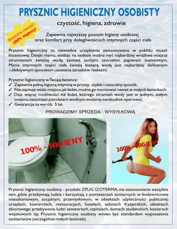 PRYSZNIC HIGIENICZNY OSOBISTY ć! oś ! w no ny na igie t u l h so Ab 00% 1 PROWADZIMY SPRZEDAŻ WYSYŁKOWĄ 100 IENY G I H %- 1 Y IGIEN H 00% Prysznic higieniczny osobisty - produkt ZPUG IZOTERMA, ma zastosowanie wszędzie tam, gdzie przebywają ludzie i korzystają z pomieszczeń sanitarnych: w budownictwie mieszkaniowym, socjalnym, przemysłowym, w obiektach użyteczności publicznej: urzędach, kawiarniach, restauracjach, hotelach, salonach fryzjerskich, obiektach zbiorowego przebywania ludzi: sanatoriach, szpitalach, domach studenckich, koszarach wojskowych itp. Prysznic higieniczny osobisty winien być standardem wyposażenia sanitariatów (szczególnie małych łazienek). Zalety prysznica higienicznego - zastosowania łazienkowe: 1. 100% higieny: skuteczne i szybkie oczyszczanie ciała strumieniem wody po załatwieniu potrzeby fizjologicznej. Zapewnia komfort, a także zmniejsza zużycie papieru toaletowego od 3 do 5 razy oraz zużycie wody o ok. 20%. 2. Higiena intymna kobiet: obcisła bielizna, dezodoranty intymne, czy podpaski podrażniają delikatną wyściółkę okolic cewki moczowej i wejścia do pochwy, powodując infekcje. Codzienne mycie strumieniem świeżej wody przy użyciu prysznica higienicznego jest najbardziej efektywnym sposobem uzyskania najwyższego stopnia higieny intymnej. 3. Higiena przy stosunkach seksualnych: prysznic higieniczny umożliwia szybkie i przyjemne umycie intymnych części ciała przed i po stosunku seksualnym, co zapobiega ewentualnym infekcjom i zapewnia uczucie czystości i świeżości. 4. Higiena ciążowa i poporodowa: podczas ciąży ciało kobiety zmienia się, produkuje więcej upławów pochwowych. Dzięki prysznicowi higienicznemu przyszła mama bez trudu utrzyma swoje ciało w czystości. Poród to bolesny proces, szczególnie gdy dochodzi do nacięcia krocza. Prysznic higieniczny jest prostym rozwiązaniem na to, by młoda mama mogła złagodzić związane z tym dolegliwości w okresie poporodowym. 5. Profilaktyka przy chronicznym zapaleniu dróg moczowych: prysznic higieniczny ma też dodatkowe terapeutyczne działanie na odbyt i drogi moczowe. Zapobiega cyklicznemu zakażaniu cewki moczowej i dróg moczowych, zapewnia czystość nieosiągalną przy użyciu suchego papieru. 6. Zmniejszenie dolegliwości przy hemoroidach: utrzymanie dobrej higieny bez wycierania miejsc wrażliwych szorstkim papierem jest najważniejszą zaletą stosowania prysznica higienicznego przy hemoroidach, pozwalającą uniknąć krwawienia, bólu, które towarzyszą hemoroidom. Wielokrotne, codzienne używanie prysznica higienicznego eliminuje konieczność stosowania wielu kremów i maści, które są nieprzyjemne w stosowaniu i mało skuteczne. 7. Pomaga przy zwalczaniu zaparć: oddolny strumień wody skierowany na odbyt (8 ÷ 10 sek.) powoduje relaksowanie mięśni zwieracza kontrolujących odbyt i w ten sposób ułatwia wypróżnianie. Skierowanie strumienia wody jest zalecane przed rozpoczęciem wypróżniania. Używanie prysznica higienicznego stopniowo uczy jak relaksować mięsnie, by ułatwić wypróżnianie, aż stanie się to naturalną reakcją. 8. Opieka nad starszymi, niedołężnymi osobami: prysznic higieniczny ułatwia higienę osób w podeszłym wieku, które na skutek zmian artretycznych i innych mają ograniczone możliwości ruchów oraz eliminuje konieczność rozbierania się w celu umycia intymnych części ciała w bidecie, wannie. 9. Czyszczenie muszli klozetowej, wanny, kabiny prysznicowej. Zastosowania kuchenne: 1. Mycie naczyń 2. Mycie owoców i warzyw 3. Codzienne czyszczenie zlewozmywaka Inne zastosowania: 1. Mycie zwierząt domowych 2. Czyszczenie narzędzi pracy i butów 3. Zastosowanie na jachtach, łódkach lub w przyczepach kempingowych Wykonania: typ A - do zimnej wody, IZOTERMA PRODUKT typ B i C - do wody ciepłej i zimnej. ZAPRASZAMY NA NASZĄ STRONĘ INTERNETOWĄ PROWADZIMY SPRZEDAŻ WYSYŁKOWĄ Zakład Produkcji Urządzeń Grzejnych IZOTERMA 55-002 KAMIENIEC WROCŁAWSKI, ŁANY, Ul. ODRZAŃSKA 14 PRODUCENT Tel. +48 (071) 318-58-96 Fax +48 (071) 318-58-97 e-mail: [email protected] www.izoterma.wroc.pl