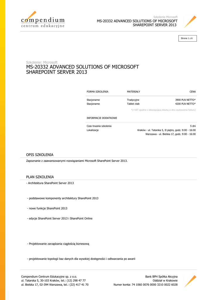 Szkolenie Microsoft MS-20332 ADVANCED SOLUTIONS OF MICROSOFT SHAREPOINT SERVER 2013 Strona 1 z 6 Szkolenie: Microsoft MS-20332 ADVANCED SOLUTIONS OF MICROSOFT SHAREPOINT SERVER 2013 FORMA SZKOLENIA MATERIAŁY CENA Stacjonarne Tradycyjne 3900 PLN NETTO* Stacjonarne Tablet ctab 4200 PLN NETTO* *(+VAT zgodnie z obowiązującą stawką w dniu wystawienia faktury) INFORMACJE DODATKOWE Czas trwania szkolenia 5 dni Lokalizacje Kraków - ul. Tatarska 5, II piętro, godz. 9:00 - 16:00 Warszawa - ul. Bielska 17, godz. 9:00 - 16:00 OPIS SZKOLENIA Zapoznanie z zaawansowanymi rozwiązaniami Microsoft SharePoint Server 2013. PLAN SZKOLENIA - Architektura SharePoint Server 2013 - podstawowe komponenty architektury SharePoint 2013 - nowe funkcje SharePoint 2013 - edycje SharePoint Server 2013 i SharePoint Online - Projektowanie zarządzania ciągłością biznesową - projektowanie topologii baz danych dla wysokiej dostępności i odtwarzania po awarii Compendium Centrum Edukacyjne sp. z o.o. ul. Tatarska 5, 30-103 Kraków, tel.: (12) 298 47 77 ul. Bielska 17, 02-394 Warszawa, tel.: (22) 417 41 70 Bank BPH Spółka Akcyjna Oddział w Krakowie Numer konta: 74 1060 0076 0000 3210 0022 6028 Szkolenie Microsoft MS-20332 ADVANCED SOLUTIONS OF MICROSOFT SHAREPOINT SERVER 2013 Strona 2 z 6 - projektowanie infrastruktury SharePoint do zapewnienia wysokiej dostępności - planowanie odtwarzania po awarii - Testowanie procesu tworzenia kopii zapasowej i odtwarzania - planowanie aplikacji usług - projektowanie i konfiguracja topologii aplikacji usług - konfiguracja federacji aplikacji usług - Konfiguracja i zarządzanie usługami łączności biznesowej - planowanie i konfiguracja usług łączności biznesowej - konfiguracja usługi bezpiecznego magazynu - zarządzanie modelami łączności danych biznesowych - Łączenie użytkowników - zarządzanie profilami użytkowników - dołączanie interakcji społecznej - tworzenie społeczności Compendium Centrum Edukacyjne sp. z o.o. ul. Tatarska 5, 30-103 Kraków, tel.: (12) 298 47 77 ul. Bielska 17, 02-394 Warszawa, tel.: (22) 417 41 70 Bank BPH Spółka Akcyjna Oddział w Krakowie Numer konta: 74 1060 0076 0000 3210 0022 6028 Szkolenie Microsoft MS-20332 ADVANCED SOLUTIONS OF MICROSOFT SHAREPOINT SERVER 2013 Strona 3 z 6 - Produktywność i współpraca - agregacja zadań - planowanie i konfiguracja funkcji współpracy - planowanie i konfiguracja kompozytów - Planowanie i konfiguracja analizy biznesowej - planowanie analizy biznesowej - planowanie, wdrażanie i zarządzanie usługami analizy biznesowej - planowanie i konfiguracja narzędzia analizy zaawansowanej - Planowanie i konfiguracja wyszukiwania w organizacji - konfiguracja wyszukiwania w środowisku organizacji - konfiguracja funkcji wyszukiwania - optymalizacja wyszukiwania - Planowanie i konfiguracja zarządzania zawartością w organizacji - planowanie zarządzania zawartością - planowanie i konfiguracja eDiscovery Compendium Centrum Edukacyjne sp. z o.o. ul. Tatarska 5, 30-103 Kraków, tel.: (12) 298 47 77 ul. Bielska 17, 02-394 Warszawa, tel.: (22) 417 41 70 Bank BPH Spółka Akcyjna Oddział w Krakowie Numer konta: 74 1060 0076 0000 3210 0022 6028 Szkolenie Microsoft MS-20332 ADVANCED SOLUTIONS OF MICROSOFT SHAREPOINT SERVER 2013 Strona 4 z 6 - planowanie zarządzaniem rekordami - Planowanie i konfiguracja zarządzaniem zawartością Web - planowanie i implementacja infrastruktury zarządzania zawartością Web - konfiguracja nawigacji zarządzanej i katalogiem witryn - wsparcie dla wielu języków i lokalizacji - dostosowywanie - wspieranie użytkowników mobilnych - Zarządzanie rozwiązaniami w SharePoint Server 2013 - architektura rozwiązań SharePoint - zarządzanie rozwiązaniami piaskownicy - Zarządzanie aplikacji w SharePoint Server 2013 - architektura aplikacji SharePoint - dostarczanie i zarządzania aplikacjami oraz katalogiem aplikacji - Tworzenie planu ładu korporacyjnego Compendium Centrum Edukacyjne sp. z o.o. ul. Tatarska 5, 30-103 Kraków, tel.: (12) 298 47 77 ul. Bielska 17, 02-394 Warszawa, tel.: (22) 417 41 70 Bank BPH Spółka Akcyjna Oddział w Krakowie Numer konta: 74 1060 0076 0000 3210 0022 6028 Szkolenie Microsoft MS-20332 ADVANCED SOLUTIONS OF MICROSOFT SHAREPOINT SERVER 2013 Strona 5 z 6 - wprowadzenie do planowania ładu korporacyjnego - kluczowe elementy planu ładu korporacyjnego - planowanie ładu korporacyjnego w SharePoint Server 2013 - implementacja ładu korporacyjnego w SharePoint 2013 - Aktualizacja i migracja do SharePoint Server 2013 - przygotowanie środowiska aktualizacji i migracji - przygotowanie procesu aktualizacji - zarządzanie aktualizacją kolekcji witryn WYMAGANIA DLA UCZESTNIKA - ukończone szkolenie MS-20331 "Core Solutions of Microsoft SharePoint Server 2013" lub równoważna wiedza i umiejętności - minimum rok doświadczenia w zakresie analizy wymagań biznesowych na potrzeby projektów logicznych i fizycznych - doświadczenie w zarządzaniu oprogramowaniem w środowisku Windows Server 2008 R2 lub Windows Server 2012 - umiejętność wdrażania zarządzania aplikacjami natywnymi, wirtualnymi i pracującymi w chmurze - umiejętność administrowania Internet Information Services (IIS) - umiejętność konfiguracji Active Directory w zakresie uwierzytelniania, autoryzacji oraz magazynu użytkownika - doświadczenie w zarządzaniu zdalnym aplikacjami za pomocą PowerShell 3.0 - umiejętność nawiązywania połączeń do Microsoft SQL Server - umiejętność implementacji zabezpieczeń opartych na oświadczeniach Compendium Centrum Edukacyjne sp. z o.o. ul. Tatarska 5, 30-103 Kraków, tel.: (12) 298 47 77 ul. Bielska 17, 02-394 Warszawa, tel.: (22) 417 41 70 Bank BPH Spółka Akcyjna Oddział w Krakowie Numer konta: 74 1060 0076 0000 3210 0022 6028 Szkolenie Microsoft MS-20332 ADVANCED SOLUTIONS OF MICROSOFT SHAREPOINT SERVER 2013 Strona 6 z 6 CERTYFIKATY Uczestnicy otrzymują po zakończeniu szkolenia zaświadczenie o ukończeniu autory