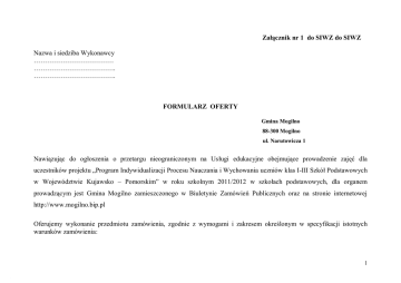 Załącznik nr 1 do SIWZ do SIWZ Nazwa i siedziba Wykonawcy ……………………………… ………………………………. ………………………………. FORMULARZ OFERTY Gmina Mogilno 88-300 Mogilno ul. Narutowicza 1 Nawiązując do ogłoszenia o przetargu nieograniczonym na Usługi edukacyjne obejmujące prowadzenie zajęć dla uczestników projektu „Program Indywidualizacji Procesu Nauczania i Wychowania uczniów klas I-III Szkół Podstawowych w Województwie Kujawsko – Pomorskim” w roku szkolnym 2011/2012 w szkołach podstawowych, dla organem prowadzącym jest Gmina Mogilno zamieszczonego w Biuletynie Zamówień Publicznych oraz na stronie internetowej http://www.mogilno.bip.pl Oferujemy wykonanie przedmiotu zamówienia, zgodnie z wymogami i zakresem określonym w specyfikacji istotnych warunków zamówienia: 1 1. Zobowiązuje się wykonać przedmiot zamówienia w części: Część Stawka brutto za 1 godz. zajęć Liczba godzin w danej części zamówienia Wartość brutto Szkoła Podstawowa nr 2 w Mogilnie Część 1: Szkoła Podstawowa nr 2 w Mogilnie Zajęcia dla dzieci ze specyficznymi trudnościami w czytaniu i pisaniu, w tym także zagrożonych ryzykiem dysleksji Część 2: Szkoła Podstawowa nr 2 w MogilnieZajęcia dla dzieci z trudnościami w zdobywaniu umiejętności matematycznych I GRUPA Część 3: Szkoła Podstawowa nr 2 w MogilnieZajęcia dla dzieci z trudnościami w zdobywaniu umiejętności matematycznych II GRUPA Część 4 Szkoła Podstawowa nr 2 w Mogilnie Zajęcia logopedyczne dla dzieci z zaburzeniami rozwoju mowy Część 5: - Szkoła Podstawowa nr 2 w Mogilnie – Gimnastyka korekcyjna dla dzieci z wadami postawy 30h 30h 30h 30h 30h 2 Część 6: Szkoła Podstawowa nr 2 w MogilnieZajęcia rozwijające zainteresowania uczniów szczególnie uzdolnionych ze szczególnym uwzględnieniem nauk matematycznoprzyrodniczych I GRUPA Część 7: Szkoła Podstawowa nr 2 w MogilnieZajęcia rozwijające zainteresowania uczniów szczególnie uzdolnionych ze szczególnym uwzględnieniem nauk matematycznoprzyrodniczych II GRUPA Część 8: Szkoła Podstawowa nr 2 w MogilnieZajęcia rozwijające zainteresowania uczniów matematycznie uzdolnionych Część 9: Szkoła Podstawowa nr 2 w MogilnieZajęcia rozwijające zainteresowania uczniów szczególnie uzdolnionych w zakresie sztuki teatralnej I GRUPA Część 10: Szkoła Podstawowa nr 2 w MogilnieZajęcia rozwijające zainteresowania uczniów szczególnie uzdolnionych w zakresie sztuki teatralnej II GRUPA - 30h 30h 30h 35h 35h 3 Szkoła Podstawowa nr 3 w Mogilnie Część 11: Szkoła Podstawowa w nr 3 w Mogilnie Zajęcia dla dzieci ze specyficznymi trudnościami w czytaniu i pisaniu w tym także zagrożonych ryzykiem dysleksji I GRUPA Część 12: Szkoła Podstawowa w nr 3 w Mogilnie Zajęcia dla dzieci ze specyficznymi trudnościami w czytaniu i pisaniu w tym także zagrożonych ryzykiem dysleksji II GRUPA Część 13: Szkoła Podstawowa w nr 3 w Mogilnie Zajęcia dla dzieci ze specyficznymi trudnościami w czytaniu i pisaniu w tym także zagrożonych ryzykiem dysleksji III GRUPA Część 14: Szkoła Podstawowa w nr 3 w MogilnieZajęcia dla dzieci z trudnościami w zdobywaniu umiejętności matematycznych I GRUPA Część 15: Szkoła Podstawowa w nr 3 w MogilnieZajęcia dla dzieci z trudnościami w zdobywaniu umiejętności matematycznych II GRUPA Część 16:Szkoła Podstawowa w nr 3 w MogilnieZajęcia logopedyczne dla dzieci z zaburzeniami rozwoju mowy I GRUPA Część 17:Szkoła Podstawowa w nr 3 w MogilnieZajęcia logopedyczne dla dzieci z zaburzeniami rozwoju mowy II GRUPA 30h 30h 30h 30h 30h 30h 30h 4 Część 18:Szkoła Podstawowa w nr 3 w MogilnieZajęcia logopedyczne dla dzieci z zaburzeniami rozwoju mowy III GRUPA Część 19: Szkoła Podstawowa w nr 3 w Mogilnie Gimnastyka korekcyjna dla dzieci z zaburzeniami rozwoju mowy I GRUPA Część 20: Szkoła Podstawowa w nr 3 w Mogilnie Gimnastyka korekcyjna dla dzieci z zaburzeniami rozwoju mowy II GRUPA Część 21: Szkoła Podstawowa w nr 3 w MogilnieZajęcia rozwijające zainteresowania uczniów szczególnie uzdolnionych ze szczególnym uwzględnieniem nauk matematycznoprzyrodniczych I GRUPA Część 22: Szkoła Podstawowa w nr 3 w MogilnieZajęcia rozwijające zainteresowania uczniów szczególnie uzdolnionych ze szczególnym uwzględnieniem nauk matematycznoprzyrodniczych II GRUPA Część 23: Szkoła Podstawowa w nr 3 w MogilnieZajęcia socjoterapeutyczne i psychoedukacyjne 30h 30h 30h 30h 30h 30h 5 Szkoła Podstawowa Padniewo Część 24: Szkoła Podstawowa Padniewo- Zajęcia dla dzieci ze specyficznymi trudnościami w czytaniu i pisaniu w tym także zagrożonych ryzykiem dysleksji I GRUPA Część 25: Szkoła Podstawowa Padniewo- Zajęcia dla dzieci ze specyficznymi trudnościami w czytaniu i pisaniu w tym także zagrożonych ryzykiem dysleksji II GRUPA Część 26: Szkoła Podstawowa Padniewo - Zajęcia logopedyczne dla dzieci z zaburzeniami rozwoju mowy Część 27: Szkoła Podstawowa Padniewo – Gimnastyka korekcyjna dla dzieci z wadami postawy 30h 30h 30h 30h 6 Szkoła Podstawowa Wylatowo Część 28: Szkoła Podstawowa Wylatowo - Zajęcia dla dzieci ze specyficznymi trudnościami w zdobywaniu umiejętności matematycznych Część 29: Szkoła Podstawowa Wylatowo- Zajęcia logopedyczne dla dzieci z zaburzeniami rozwoju mowy Część 30: Szkoła Podstawowa Wylatowo – Gimnastyka korekcyjna dla dzieci z wadami postawy Część 31: Szkoła Podstawowa Wylatowo- Zajęcia rozwijające zainteresowania uczniów szczególnie uzdolnionych ze szczególnym uwzględnieniem nauk matematyczno- przyrodniczych 30h 30h 30h 30h 7 Szkoła Podstawowa Gębice Część 32: Szkoła Podstawowa Gębice Zajęcia dla dzieci ze specyficznymi trudnościami w czytaniu i pisaniu , w tum także zagrożonych ryzykiem dysleksji Część 33: Szkoła Podstawowa Gębice - Zajęcia dla dzieci z trudnościami w zdobywaniu umiejętności matematycznych Część 34: Szkoła P