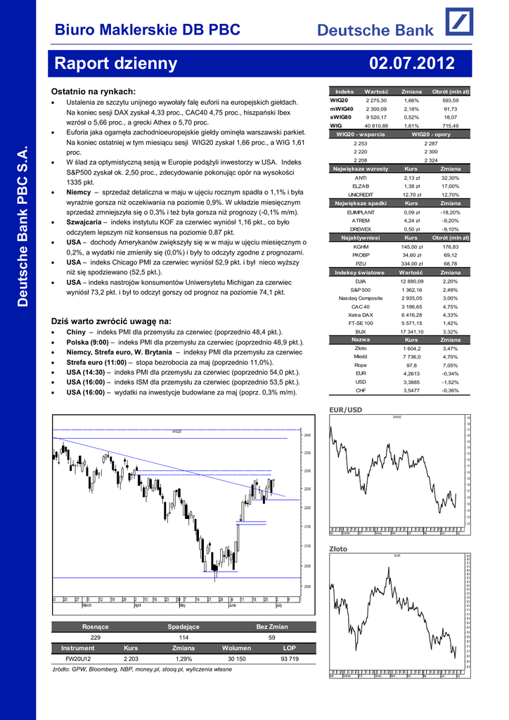 Biuro Maklerskie DB PBC Raport dzienny 02.07.2012 Ostatnio na rynkach: Deutsche Bank PBC S.A. Wartość Zmiana Obrót (mln zł) WIG20 2 275,30 1,66% 593,59 mWIG40 2 300,09 2,18% 91,73 sWIG80 9 520,17 0,52% 18,07 WIG 40 810,88 1,61% 715,49 Indeks Ustalenia ze szczytu unijnego wywołały falę euforii na europejskich giełdach. Na koniec sesji DAX zyskał 4,33 proc., CAC40 4,75 proc., hiszpański Ibex wzrósł o 5,66 proc., a grecki Athex o 5,70 proc. Euforia jaka ogarnęła zachodnioeuropejskie giełdy ominęła warszawski parkiet. Na koniec ostatniej w tym miesiącu sesji WIG20 zyskał 1,66 proc., a WIG 1,61 proc. W ślad za optymistyczną sesją w Europie podążyli inwestorzy w USA. Indeks S&P500 zyskał ok. 2,50 proc., zdecydowanie pokonując opór na wysokości 1335 pkt. Niemcy – sprzedaż detaliczna w maju w ujęciu rocznym spadła o 1,1% i była wyraźnie gorsza niż oczekiwania na poziomie 0,9%. W układzie miesięcznym sprzedaż zmniejszyła się o 0,3% i też była gorsza niż prognozy (-0,1% m/m). Szwajcaria – indeks instytutu KOF za czerwiec wyniósł 1,16 pkt., co było odczytem lepszym niż konsensus na poziomie 0,87 pkt. USA – dochody Amerykanów zwiększyły się w w maju w ujęciu miesięcznym o 0,2%, a wydatki nie zmieniły się (0,0%) i były to odczyty zgodne z prognozami. USA – indeks Chicago PMI za czerwiec wyniósł 52,9 pkt. i był nieco wyższy niż się spodziewano (52,5 pkt.). USA – indeks nastrojów konsumentów Uniwersytetu Michigan za czerwiec wyniósł 73,2 pkt. i był to odczyt gorszy od prognoz na poziomie 74,1 pkt. WIG20 - wsparcia WIG20 - opory 2 253 2 287 2 220 2 300 2 208 Kurs Zmiana ANTI 2,13 zł 32,30% ELZAB 1,38 zł 17,00% UNICREDIT 12,70 zł 12,70% Największe spadki Kurs Zmiana EUIMPLANT 0,09 zł -18,20% ATREM 4,24 zł -9,20% DREWEX 0,50 zł -9,10% Najaktywniesi Kurs Obrót (mln zł) KGHM 145,00 zł 176,83 PKOBP 34,60 zł 69,12 PZU 334,00 zł 68,78 Indeksy światowe Wartość Zmiana DJIA 12 880,09 2,20% S&P 500 1 362,16 2,49% Nasdaq Composite 2 935,05 3,00% CAC 40 3 196,65 4,75% Xetra DAX 6 416,28 4,33% FT-SE 100 5 571,15 1,42% BUX 17 341,10 3,32% Nazwa Kurs Zmiana Dziś warto zwrócić uwagę na: 2 324 Największe wzrosty Chiny – indeks PMI dla przemysłu za czerwiec (poprzednio 48,4 pkt.). Polska (9:00) – indeks PMI dla przemysłu za czerwiec (poprzednio 48,9 pkt.). Niemcy, Strefa euro, W. Brytania – indeksy PMI dla przemysłu za czerwiec Strefa euro (11:00) – stopa bezrobocia za maj (poprzednio 11,0%). USA (14:30) – indeks PMI dla przemysłu za czerwiec (poprzednio 54,0 pkt.). USA (16:00) – indeks ISM dla przemysłu za czerwiec (poprzednio 53,5 pkt.). USA (16:00) – wydatki na inwestycje budowlane za maj (poprz. 0,3% m/m). Złoto 1 604,2 3,47% Miedź 7 736,0 4,70% Ropa 97,8 7,05% EUR 4,2613 -0,34% USD 3,3885 -1,52% CHF 3,5477 -0,36% 1.3054 EUR/USD EUR/USD 1.39 1.38 1.37 WIG20 2400 1.36 1.35 1.34 2350 1.33 1.32 1.31 2300 1.30 1.29 1.28 2250 1.27 1.26 1.25 2200 1.24 1.23 2150 2100 1.22 7 14 21 28 5 12 19 26 2 9 16 23 30 6 13 20 27 5 12 19 26 2 9 16 23 30 7 14 21 28 4 11 18 25 2 9 16 November December 2012 February March April May June July Złoto SILVER 2050 2000 13 20 27 5 March 12 19 26 2 10 April 16 23 30 7 May 14 Rosnące Spadające 229 114 21 28 4 11 June 18 25 2 July 9 16 Bez Zmian 59 Instrument Kurs Zmiana Wolumen LOP FW20U12 2 203 1,29% 30 150 93 719 źródło: GPW, Bloomberg, NBP, money.pl, stooq.pl, wyliczenia własne 38.5 38.0 37.5 37.0 36.5 36.0 35.5 35.0 34.5 34.0 33.5 33.0 32.5 32.0 31.5 31.0 30.5 30.0 29.5 29.0 28.5 28.0 27.5 27.0 26.5 26.0 25.5 7 14 21 28 5 12 19 27 3 9 16 23 30 6 13 20 27 5 12 19 26 2 9 16 23 30 7 14 21 28 4 11 18 25 2 9 16 November December 2012 February March April May June July Euforia po zakończeniu unijnego szczytu S&P500 Deutsche Bank PBC S.A. S&P500 W belgijskiej stolicy zakończył się szczyt z udziałem przywódców 27 państw. Największy sukces na tym trwającym do późnych godzin nocnych spotkaniu osiągnęli politycy z Hiszpanii i Włoch. Madryt wywalczył, że banki, które mają problemy finansowe, będą dokapitalizowane bezpośrednio z europejskiego funduszu ratunkowego. Jest to szczególnie ważne, gdyż taka forma udzielenia pomocy nie zwiększy krajowego zadłużenia. Rzym natomiast przeforsował postulat, by europejski fundusz skupował obligacje zagrożonych bankructwem krajów. Pomoc ta nie będzie się wiązała z wdrażaniem drastycznego programu oszczędnościowego, pod warunkiem, że kraje będą postępować zgodnie z rekomendacjami Komisji Europejskiej. Warto jednak zauważyć, że ustalenia dotyczące rynku długu zostały poniekąd wymuszone przez szantaż Włoch i Hiszpanii, których przywódcy nie chcieli podpisać się pod "Paktem na rzecz Wzrostu i Zatrudnienia" dopóki nie zostanie im udzielona tymczasowa pomoc w redukcji kosztu zadłużenia. Ustalenia ze szczytu wywołały falę euforii na europejskich giełdach. Skalę optymizmu potęgował fakt iż rynki nie spodziewały się, że politykom uda się osiągnąć jakiś kompromis, a nastroje dodatkowo studziły komentarze płynące z Niemiec. Na koniec sesji DAX zyskał 4,33 proc., CAC40 4,75 proc. hiszpański Ibex wzrósł o 5,66 proc., a grecki Athex o 5,70 proc. Spadek awersji do ryzyka widać było także na rynku długu oraz walutowym. Rentowności 10-letnich obligacji Hiszpanii spadły o 61 pb. do 6,33 proc. (wcześniej utrzymywały się powyżej 7 proc.), a Włoch o 38 pb. do poziomu 5,82 proc. Kurs euro umocnił się w stosunku do dolara o ok. 2 proc. W piątek, już po zakończeniu sesji, niemiecki parlament zgodził się na ratyfikację paktu fiskalnego Unii Europejskiej oraz Europejskiego Mechanizmu Stabilizacyjnego. Teraz ratyfikacja oczekuje na podpis prezydenta prezydent Niemiec, Joachim Gauck. Na prośbę niemieckiego Federalnego Trybunału Konstytucyjnego wstrzymał się on z podpisem do czasu rozpatrzenia przez Trybunał wszystkich skarg. Uruchomienie Europejskiego Mechanizmu Stabiliz