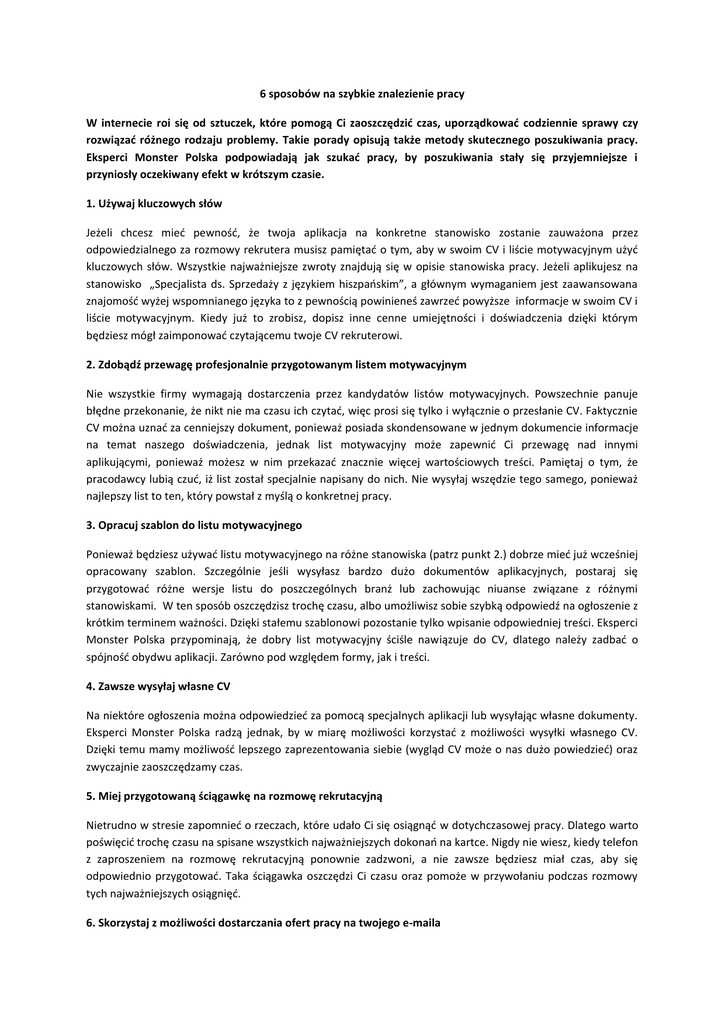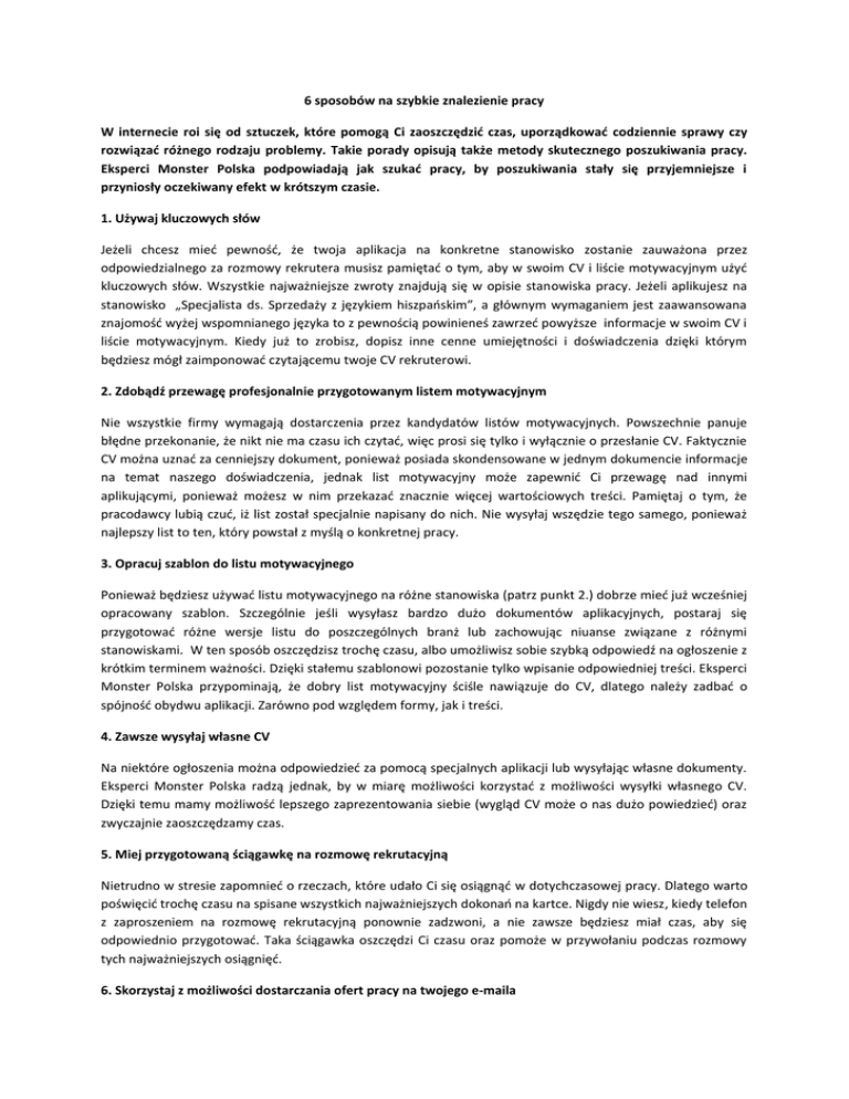 6 sposobów na szybkie znalezienie pracy W internecie roi się od sztuczek, które pomogą Ci zaoszczędzić czas, uporządkować codziennie sprawy czy rozwiązać różnego rodzaju problemy. Takie porady opisują także metody skutecznego poszukiwania pracy. Eksperci Monster Polska podpowiadają jak szukać pracy, by poszukiwania stały się przyjemniejsze i przyniosły oczekiwany efekt w krótszym czasie. 1. Używaj kluczowych słów Jeżeli chcesz mieć pewność, że twoja aplikacja na konkretne stanowisko zostanie zauważona przez odpowiedzialnego za rozmowy rekrutera musisz pamiętać o tym, aby w swoim CV i liście motywacyjnym użyć kluczowych słów. Wszystkie najważniejsze zwroty znajdują się w opisie stanowiska pracy. Jeżeli aplikujesz na stanowisko „Specjalista ds. Sprzedaży z językiem hiszpańskim”, a głównym wymaganiem jest zaawansowana znajomość wyżej wspomnianego języka to z pewnością powinieneś zawrzeć powyższe informacje w swoim CV i liście motywacyjnym. Kiedy już to zrobisz, dopisz inne cenne umiejętności i doświadczenia dzięki którym będziesz mógł zaimponować czytającemu twoje CV rekruterowi. 2. Zdobądź przewagę profesjonalnie przygotowanym listem motywacyjnym Nie wszystkie firmy wymagają dostarczenia przez kandydatów listów motywacyjnych. Powszechnie panuje błędne przekonanie, że nikt nie ma czasu ich czytać, więc prosi się tylko i wyłącznie o przesłanie CV. Faktycznie CV można uznać za cenniejszy dokument, ponieważ posiada skondensowane w jednym dokumencie informacje na temat naszego doświadczenia, jednak list motywacyjny może zapewnić Ci przewagę nad innymi aplikującymi, ponieważ możesz w nim przekazać znacznie więcej wartościowych treści. Pamiętaj o tym, że pracodawcy lubią czuć, iż list został specjalnie napisany do nich. Nie wysyłaj wszędzie tego samego, ponieważ najlepszy list to ten, który powstał z myślą o konkretnej pracy. 3. Opracuj szablon do listu motywacyjnego Ponieważ będziesz używać listu motywacyjnego na różne stanowiska (patrz punkt 2.) dobrze mieć już wcześniej opracowany szablon. Szczególnie jeśli wysyłasz bardzo dużo dokumentów aplikacyjnych, postaraj się przygotować różne wersje listu do poszczególnych branż lub zachowując niuanse związane z różnymi stanowiskami. W ten sposób oszczędzisz trochę czasu, albo umożliwisz sobie szybką odpowiedź na ogłoszenie z krótkim terminem ważności. Dzięki stałemu szablonowi pozostanie tylko wpisanie odpowiedniej treści. Eksperci Monster Polska przypominają, że dobry list motywacyjny ściśle nawiązuje do CV, dlatego należy zadbać o spójność obydwu aplikacji. Zarówno pod względem formy, jak i treści. 4. Zawsze wysyłaj własne CV Na niektóre ogłoszenia można odpowiedzieć za pomocą specjalnych aplikacji lub wysyłając własne dokumenty. Eksperci Monster Polska radzą jednak, by w miarę możliwości korzystać z możliwości wysyłki własnego CV. Dzięki temu mamy możliwość lepszego zaprezentowania siebie (wygląd CV może o nas dużo powiedzieć) oraz zwyczajnie zaoszczędzamy czas. 5. Miej przygotowaną ściągawkę na rozmowę rekrutacyjną Nietrudno w stresie zapomnieć o rzeczach, które udało Ci się osiągnąć w dotychczasowej pracy. Dlatego warto poświęcić trochę czasu na spisane wszystkich najważniejszych dokonań na kartce. Nigdy nie wiesz, kiedy telefon z zaproszeniem na rozmowę rekrutacyjną ponownie zadzwoni, a nie zawsze będziesz miał czas, aby się odpowiednio przygotować. Taka ściągawka oszczędzi Ci czasu oraz pomoże w przywołaniu podczas rozmowy tych najważniejszych osiągnięć. 6. Skorzystaj z możliwości dostarczania ofert pracy na twojego e-maila Jeżeli jesteś zarejestrowany na stronie monsterpolska.pl, możesz skorzystać z usługi wysyłania wszystkich interesujących Cię ofert pracy na twojego e-maila. Wystarczy, że podczas wyszukiwania konkretnego stanowiska klikniesz na opcję „otrzymuj e-mailem oferty pracy podobne do … „. Dodatkowo możesz zapisywać wszystkie swoje wyszukiwania oraz ciekawe oferty. Dzięki tym możliwościom nie przegapisz żadnej mogącej Cię zainteresować pracy.