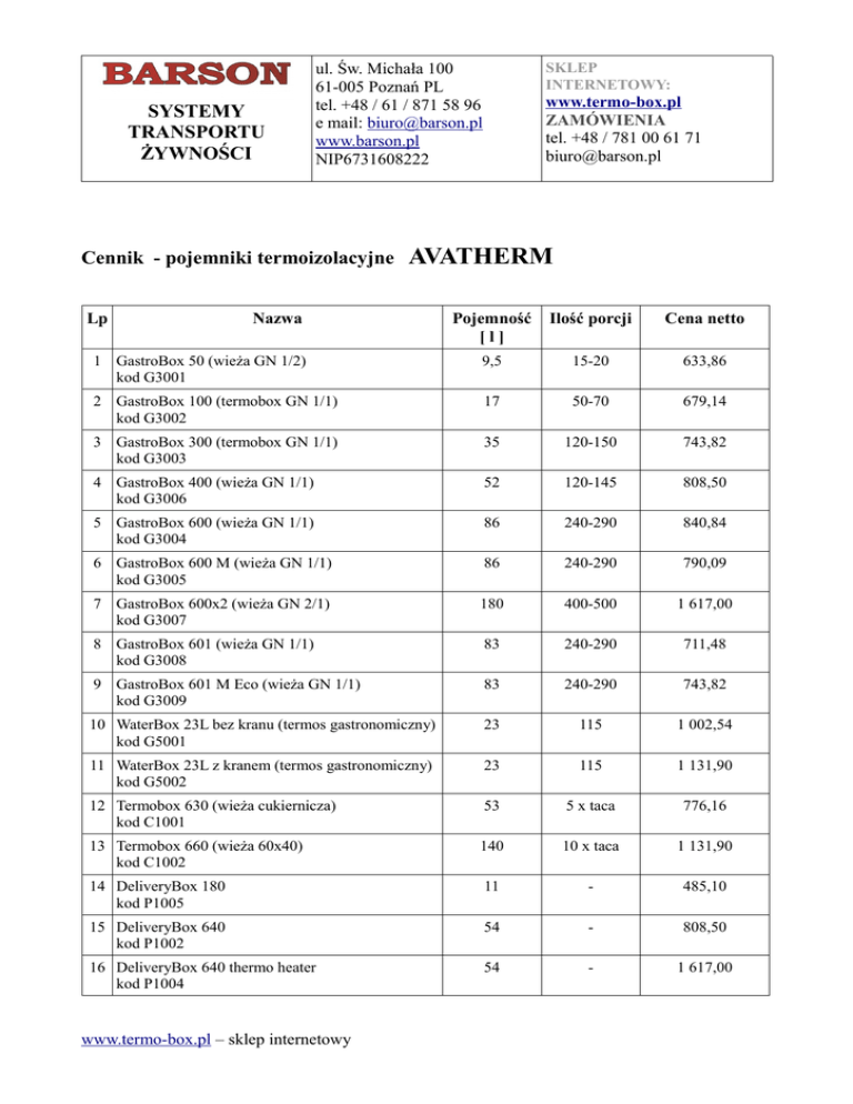 SYSTEMY TRANSPORTU ŻYWNOŚCI Cennik - pojemniki termoizolacyjne Lp SKLEP INTERNETOWY: ul. Św. Michała 100 61-005 Poznań PL tel. +48 / 61 / 871 58 96 e mail: [email protected] www.barson.pl NIP6731608222 www.termo-box.pl ZAMÓWIENIA tel. +48 / 781 00 61 71 [email protected] AVATHERM Nazwa Pojemność [l] Ilość porcji Cena netto 1 GastroBox 50 (wieża GN 1/2) kod G3001 9,5 15-20 633,86 2 GastroBox 100 (termobox GN 1/1) kod G3002 17 50-70 679,14 3 GastroBox 300 (termobox GN 1/1) kod G3003 35 120-150 743,82 4 GastroBox 400 (wieża GN 1/1) kod G3006 52 120-145 808,50 5 GastroBox 600 (wieża GN 1/1) kod G3004 86 240-290 840,84 6 GastroBox 600 M (wieża GN 1/1) kod G3005 86 240-290 790,09 7 GastroBox 600x2 (wieża GN 2/1) kod G3007 180 400-500 1 617,00 8 GastroBox 601 (wieża GN 1/1) kod G3008 83 240-290 711,48 9 GastroBox 601 M Eco (wieża GN 1/1) kod G3009 83 240-290 743,82 10 WaterBox 23L bez kranu (termos gastronomiczny) kod G5001 23 115 1 002,54 11 WaterBox 23L z kranem (termos gastronomiczny) kod G5002 23 115 1 131,90 12 Termobox 630 (wieża cukiernicza) kod C1001 53 5 x taca 776,16 13 Termobox 660 (wieża 60x40) kod C1002 140 10 x taca 1 131,90 14 DeliveryBox 180 kod P1005 11 - 485,10 15 DeliveryBox 640 kod P1002 54 - 808,50 16 DeliveryBox 640 thermo heater kod P1004 54 - 1 617,00 www.termo-box.pl – sklep internetowy 17 DeliveryBox Ergoline kod P1001 110 - 905,10 18 Delivery Box Pizza kod P1003 70 - 873,18 Do cen netto należy doliczyć 23% VAT Przy zamówieniu hurtowym - wycena indywidualna. Koszt transportu nie jest wliczony w cenę towaru. Wszystkie produkty posiadają atesty spełniające wymogi UE oraz wymogi HACCP. Pełna oferta wraz ze specyfikacją produktów dostępna na stronie sklepu online: Cennik ważny do 31.12.2015 www.termo-box.pl – sklep internetowy