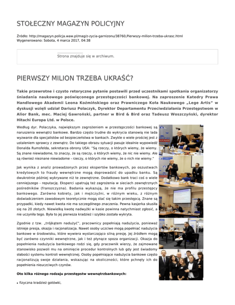 STOŁECZNY MAGAZYN POLICYJNY Źródło: http://magazyn.policja.waw.pl/mag/z-zycia-garnizonu/38760,Pierwszy-milion-trzeba-ukrasc.html Wygenerowano: Sobota, 4 marca 2017, 04:38 Strona znajduje się w archiwum. PIERWSZY MILION TRZEBA UKRAŚĆ? Takie przewrotne i czysto retoryczne pytanie postawili przed uczestnikami spotkania organizatorzy śniadania naukowego poświęconego przestępczości bankowej. Na zaproszenie Katedry Prawa Handlowego Akademii Leona Koźmińskiego oraz Prawniczego Koła Naukowego „Lege Artis” w dyskusji wzięli udział Dariusz Polaczyk, Dyrektor Departamentu Przeciwdziałania Przestępstwom w Alior Bank, mec. Maciej Gawroński, partner w Bird & Bird oraz Tadeusz Woszczyński, dyrektor Hitachi Europa Ltd. w Polsce. Według dyr. Polaczyka, największym zagrożeniem w przestępczości bankowej są naruszenia wewnątrz bankowe. Bardzo często trudne do wykrycia stanowią nie lada wyzwanie dla specjalistów od bezpieczeństwa w bankach. Zwykle o wiele prościej jest z ustaleniem sprawcy z zewnątrz. Do takiego obrazu sytuacji pasuje idealnie wypowiedź Donalda Rumsfelda, sekretarza obrony USA: ”Są rzeczy, o których wiemy, że wiemy. Są znane niewiadome, to znaczy, że są rzeczy, o których wiemy, że nic nie wiemy. Ale są również nieznane niewiadome - rzeczy, o których nie wiemy, że o nich nie wiemy.” Jak wynika z analiz prowadzonych przez ekspertów bankowych, po oszustwach kredytowych to fraudy wewnętrzne mogą doprowadzić do upadku banku. Są dwukrotnie później wykrywane niż te zewnętrzne. Dodatkowo bank traci coś o wiele cenniejszego - reputację. Eksperci upatrują też zagrożenia w sieciach zewnętrznych pośredników (franszczyzna). Badania wykazują, że nie ma profilu przestępcy bankowego. Zarówno kobiety, jak i mężczyźni, w różnym wieku, z różnym doświadczeniem zawodowym teoretycznie mogą stać się takim przestępcą. Znane są przypadki, kiedy nawet kwota nie ma szczególnego znaczenia. Pewna kasjerka skusiła się na 20 złotych. Niewielką kwotę nadwyżki w kasie powinna natychmiast zgłosić, a nie uczyniła tego. Była to jej pierwsza kradzież i szybko została wykryta. Zgodnie z tzw. „trójkątem nadużyć”, pracownicy popełniają nadużycia, ponieważ istnieje presja, okazja i racjonalizacja. Nawet osoby uczciwe mogą popełniać nadużycia bankowe w środowisku, które wywiera wystarczająco silną presję. Jej źródłem mogą być zarówno czynniki wewnętrzne, jak i też płynące spoza organizacji. Okazja do popełnienia nadużycia bankowego rodzi się, gdy pracownik wierzy, że zajmowane stanowisko pozwoli mu na ominięcie procedur kontrolnych lub gdy jest świadomy słabości systemu kontroli wewnętrznej. Osoby popełniające nadużycia bankowe często racjonalizują swoje działania, wskazując na okoliczności, które pchnęły ich do popełnienia nieuczciwych czynów. Oto kilka różnego rodzaju przestępstw wewnątrzbankowych: ● fizyczna kradzież gotówki, ● kradzież haseł, loginów, ● generowanie umów bankowych, ● poświadczenie nieprawdy, ● naruszenie tajemnicy bankowej, ● manipulowanie wartością oceny kredytowej, ● zabór zwrotów dla klienta. W trosce o bezpieczeństwo pracowników i klientów niektóre banki na świecie decydują się na wdrożenie systemów biometrycznych w bankowości. Mimo niezaprzeczalnych zalet, biometria nie znalazła jeszcze powszechnego zastosowania w bankowości. Od kilku lat przewiduje się, że nastąpi intensywny rozwój rynku, ale przełomu wciąż nie ma. Niemniej, w kilku rejonach świata, biometria ma już silną pozycję. Banki wdrażają różne rozwiązania biometryczne. Tak jest na przykład w Japonii, Ameryce Północnej czy w Europie. Wciąż rośnie liczba krajów, gdzie wdraża się rozwiązania pilotażowe i stosuje biometrię w praktyce. Pytani w sondażach prezesi polskich banków o chęć wdrożenia biometrii w bankowości, odpowiadają w zdecydowanej większości, że chętnie skorzystaliby z nowych technologii. Pozostali twierdzą, że potrzebna byłaby większa edukacja w tym zakresie. Obecnie tylko niektóre polskie banki wdrażają tę technologię (BPH, GetinNoble Bank, Podkarpacki Bank Spółdzielczy). Biometria (nauka o automatycznym rozpoznawaniu osób) nie służy identyfikacji klienta, lecz weryfikacji jego tożsamości i uwierzytelnieniu transakcji bankowych. Systemy informatyczne wykorzystując cechy fizyczne wprowadzone wcześniej do pamięci, potwierdzają, że odpowiadają one osobie wykonującej operację. Najczęściej weryfikacji podlegają: linie papilarne, tęczówka oka, geometria twarzy i dłoni, naczyń krwionośnych palca czy nadgarstka. Jak ta innowacyjna technologia może być wykorzystana dla bezpieczeństwa banku? Zastosowań jest wiele: ● kiosk samoobsługowy (VTM), ● bankomat, ● oddział bankowy, ● bankowość internetowa, ● IVR call center, ● skrzynki depozytowe. Potrzeba mocnego uwierzytelnienia klienta w banku, zwiększająca się liczba kodów PIN i kart, zwiększający się skimming w bankomatach, problemy z weryfikacją tożsamości w oddziałach – to tylko niektóre powody, dla których wykorzystuje się biometrię w bankowości. Jak zapewnia dyr. Woszczyński, jest to najmocniejsza metoda weryfikacji tożsamości klienta, zwiększa bezpieczeństwo operacji, zwiększa wygodę klienta i szybkość jego obsługi. Kluczem staje się tylko wybranie odpowiedniego kryterium doboru technologii (m.in.: zastosowanie, bezpieczeństwo, wygoda użycia, akceptowalność klientów, szybkość działania). Obecnie w światowej bankowości stosowane są następujące technologie: ● biometria naczyń krwionośnych palca (kioski informacyjne, podpis elektroniczny - Polska), ● biometria naczyń krwionośnych dłoni (Japonia, Brazylia, Turcja – bankomaty), ● biometria głosowa (call center – USA, Izrael, Brazylia, Turcja), ● biometria podpisu odręcznego (uwierzytelnienie – Izrael). Dyr.
