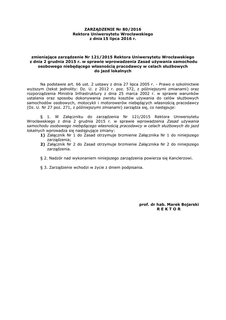 ZARZĄDZENIE Nr 80/2016 Rektora Uniwersytetu Wrocławskiego z