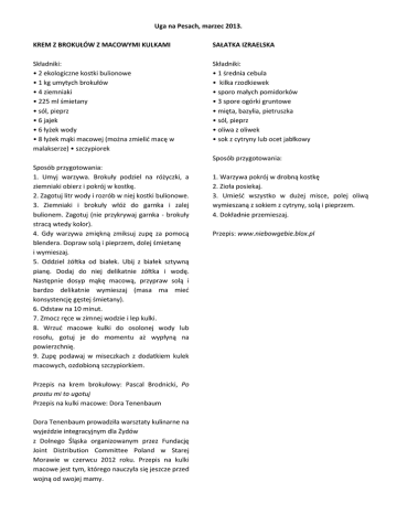 Uga na Pesach, marzec 2013. KREM Z BROKUŁÓW Z MACOWYMI KULKAMI SAŁATKA IZRAELSKA Składniki: • 2 ekologiczne kostki bulionowe • 1 kg umytych brokułów • 4 ziemniaki • 225 ml śmietany • sól, pieprz • 6 jajek • 6 łyżek wody • 8 łyżek mąki macowej (można zmielić macę w malakserze) • szczypiorek Składniki: • 1 średnia cebula • kilka rzodkiewek • sporo małych pomidorków • 3 spore ogórki gruntowe • mięta, bazylia, pietruszka • sól, pieprz • oliwa z oliwek • sok z cytryny lub ocet jabłkowy Sposób przygotowania: Sposób przygotowania: 1. Umyj warzywa. Brokuły podziel na różyczki, a ziemniaki obierz i pokrój w kostkę. 2. Zagotuj litr wody i rozrób w niej kostki bulionowe. 3. Ziemniaki i brokuły włóż do garnka i zalej bulionem. Zagotuj (nie przykrywaj garnka - brokuły stracą wtedy kolor). 4. Gdy warzywa zmiękną zmiksuj zupę za pomocą blendera. Dopraw solą i pieprzem, dolej śmietanę i wymieszaj. 5. Oddziel żółtka od białek. Ubij z białek sztywną pianę. Dodaj do niej delikatnie żółtka i wodę. Następnie dosyp mąkę macową, przypraw solą i bardzo delikatnie wymieszaj (masa ma mieć konsystencję gęstej śmietany). 6. Odstaw na 10 minut. 7. Zmocz ręce w zimnej wodzie i lep kulki. 8. Wrzuć macowe kulki do osolonej wody lub rosołu, gotuj je do momentu aż wypłyną na powierzchnię. 9. Zupę podawaj w miseczkach z dodatkiem kulek macowych, ozdobioną szczypiorkiem. Przepis na krem brokułowy: Pascal Brodnicki, Po prostu mi to ugotuj Przepis na kulki macowe: Dora Tenenbaum Dora Tenenbaum prowadziła warsztaty kulinarne na wyjeździe integracyjnym dla Żydów z Dolnego Śląska organizowanym przez Fundację Joint Distribution Committee Poland w Starej Morawie w czerwcu 2012 roku. Przepis na kulki macowe jest tym, którego nauczyła się jeszcze przed wojną od swojej mamy. 1. Warzywa pokrój w drobną kostkę 2. Zioła posiekaj. 3. Umieść wszystko w dużej misce, polej oliwą wymieszaną z sokiem z cytryny, solą i pieprzem. 4. Dokładnie przemieszaj. Przepis: www.niebowgebie.blox.pl