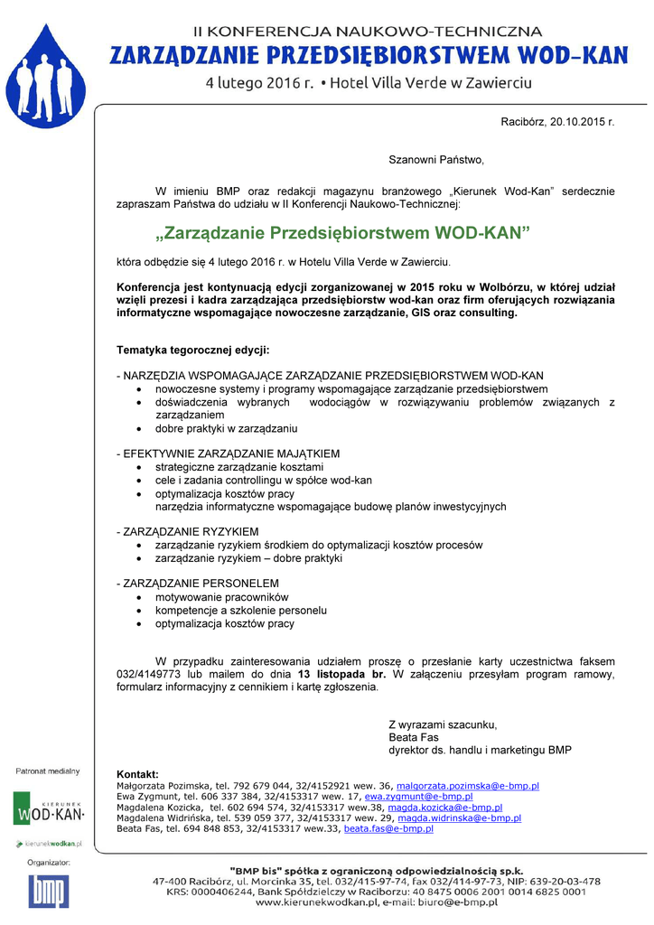 Racibórz, 20.10.2015 r. Szanowni Państwo, W imieniu BMP oraz redakcji magazynu branżowego „Kierunek Wod-Kan” serdecznie zapraszam Państwa do udziału w II Konferencji Naukowo-Technicznej: „Zarządzanie Przedsiębiorstwem WOD-KAN” która odbędzie się 4 lutego 2016 r. w Hotelu Villa Verde w Zawierciu. Konferencja jest kontynuacją edycji zorganizowanej w 2015 roku w Wolbórzu, w której udział wzięli prezesi i kadra zarządzająca przedsiębiorstw wod-kan oraz firm oferujących rozwiązania informatyczne wspomagające nowoczesne zarządzanie, GIS oraz consulting. Tematyka tegorocznej edycji: - NARZĘDZIA WSPOMAGAJĄCE ZARZĄDZANIE PRZEDSIĘBIORSTWEM WOD-KAN • nowoczesne systemy i programy wspomagające zarządzanie przedsiębiorstwem • doświadczenia wybranych wodociągów w rozwiązywaniu problemów związanych z zarządzaniem • dobre praktyki w zarządzaniu - EFEKTYWNIE ZARZĄDZANIE MAJĄTKIEM • strategiczne zarządzanie kosztami • cele i zadania controllingu w spółce wod-kan • optymalizacja kosztów pracy narzędzia informatyczne wspomagające budowę planów inwestycyjnych - ZARZĄDZANIE RYZYKIEM • zarządzanie ryzykiem środkiem do optymalizacji kosztów procesów • zarządzanie ryzykiem – dobre praktyki - ZARZĄDZANIE PERSONELEM • motywowanie pracowników • kompetencje a szkolenie personelu • optymalizacja kosztów pracy W przypadku zainteresowania udziałem proszę o przesłanie karty uczestnictwa faksem 032/4149773 lub mailem do dnia 13 listopada br. W załączeniu przesyłam program ramowy, formularz informacyjny z cennikiem i kartę zgłoszenia. Z wyrazami szacunku, Beata Fas dyrektor ds. handlu i marketingu BMP Kontakt: Małgorzata Pozimska, tel. 792 679 044, 32/4152921 wew. 36, [email protected] Ewa Zygmunt, tel. 606 337 384, 32/4153317 wew. 17, [email protected] Magdalena Kozicka, tel. 602 694 574, 32/4153317 wew.38, [email protected] Magdalena Widrińska, tel. 539 059 377, 32/4153317 wew. 29, [email protected] Beata Fas, tel. 694 848 853, 32/4153317 wew.33, [email protected] FORMULARZ INFORMACYJNY 1. Partner główny 1. 2. 3. 4. 5. 6. 7. 8. 9. Przyznanie tytułu partnera głównego II Konferencji Naukowo-Technicznej „Zarządzanie Przedsiębiorstwem Wod-Kan” Prezentację firmy 15min. Pokrycie kosztów udziału dla 2 osób (wyżywienie, materiały konferencyjne, zakwaterowanie w pokojach jednoosobowych w trakcie trwania konferencji, udział w imprezach towarzyszących). Wyeksponowanie na zaproszeniach, plakatach, transparentach i pismach oraz w obiektach, w których będzie przebiegać impreza, nazwy waszej firmy jako partnera głównego. Możliwość ustawienia rollup-u w sali wykładowej. Stoisko do 6 m2 (zabudowa własna) Reklama formatu A4 w magazynie „Kierunek Wod-Kan”. Dystrybucja materiałów promocyjnych przygotowanych przez partnera, poprzez umieszczenie ich w każdym z pakietów rejestracyjnych uczestników (1 sztuka dla 1 osoby) Logo oraz baner na stronie portalu www.kierunekwodkan.pl przez 30 dni. Koszt promocji: 16 000 zł netto 2. Partner 1. 2. 3. 4. 5. 6. 7. 8. 9. Przyznanie tytułu partnera II Konferencji Naukowo-Technicznej „Zarządzanie Przedsiębiorstwem Wod-Kan” Prezentację firmy do 15 min. Pokrycie kosztów udziału dla 2 osób (wyżywienie, materiały konferencyjne, zakwaterowanie w pokojach jednoosobowych w trakcie trwania konferencji, udział w imprezach towarzyszących). Wyeksponowanie na zaproszeniach, plakatach, transparentach i pismach oraz w obiektach, w których będzie przebiegać impreza, nazwy waszej firmy jako partnera głównego. Możliwość ustawienia rollup-u w sali wykładowej. Stoisko do 4 m2 (zabudowa własna) Reklama formatu A4 w magazynie „Kierunek Wod-Kan”. Dystrybucja materiałów promocyjnych przygotowanych przez partnera, poprzez umieszczenie ich w każdym z pakietów rejestracyjnych uczestników (1 sztuka dla 1 osoby) Logo oraz baner na stronie portalu www.kierunekwodkan.pl przez 30 dni. Koszt promocji: 13 000 zł netto 3. Inne formy promocji: a) PAKIET I (stoisko 2 m2 + prezentacja + reklama): 1. 2. 3. b) PAKIET II (prezentacja + reklama): 1. 2. c) Powierzchnia wystawiennicza 2 m2 (zabudowa własna). Reklama formatu A4 w magazynie „Kierunek Wod-Kan”. Koszt: 3 700 zł PAKIET V (stoisko 2 m2): 1. f) Prezentacja firmy do 15 min. Koszt: 3 500 zł PAKIET IV (stoisko 2 m2 + reklama): 1. 2. e) Prezentacja firmy do 15 min. Reklama formatu A4 w magazynie „Kierunek Wod-Kan”. Koszt: 5 500 zł PAKIET III (prezentacja): 1. d) Powierzchnia wystawiennicza 2 m2 (zabudowa własna). Prezentacja firmy do 15 min . Reklama formatu A4 w magazynie „Kierunek Wod-Kan”. Koszt: 6 500 zł Powierzchnia wystawiennicza 2 m2 (zabudowa własna). Koszt: 1 700 zł PAKIET VI (baner): 1. Powierzchnia na wystawienie rollupu w części wystawienniczej (zapewniamy powierzchnię wystawienniczą – szer do 1,5 m). Koszt: 900 zł 4. Promocja w materiałach konferencyjnych: a) dystrybucja materiałów reklamowych firmy (1 str. A4) poprzez umieszczenie ich w materiałach konferencyjnych: 600 zł b) reklama A4 w magazynie „Kierunek Wod-Kan”: 2600 zł 5. Koszty uczestnictwa: - dla 1 osoby przy wykupieniu ww. pakietów (wyżywienie, materiały konferencyjne, udział w imprezach towarzyszących): 800 zł - dla 1 osoby bez pakietu (wyżywienie, materiały konferencyjne, udział w imprezach towarzyszących): 1 200 zł 6. Zakwaterowanie: Hotel Villa Verde Congress & Spa, 42-400 Zawiercie, ul. Mrzygłodzka 273 (decyduje kolejność zgłoszeń, doba hotelowa zgodnie z regulaminem hotelu, parking we własnym zakresie) pokój 1 osobowy 215 zł/dobę pokój 2 osobowy 265 zł/dobę Do ww. cen doliczamy podatek VAT w wysokości 23% UWAGA: Materiały o firmie do katalogu konferencyjnego (word, max 1800 znaków ze spacjami, dane teleadresowe, logo firmy) oraz reklamy (wykonane wg specyfikacji technicznej dostępnej na www.kierunekwodkan.pl) należy dosłać w terminie do 30 listopada br. W przypadku przekroczenia t
