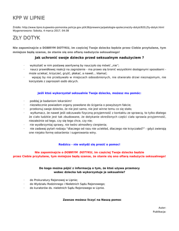 KPP W LIPNIE Źródło: http://www.lipno.kujawsko-pomorska.policja.gov.pl/k36/prewencja/patologie-spoleczne/zly-dotyk/920,Zly-dotyk.html Wygenerowano: Sobota, 4 marca 2017, 04:38 ZŁY DOTYK Nie zapominajcie o DOBRYM DOTYKU, im częściej Twoje dziecko będzie przez Ciebie przytulane, tym mniejsze będą szanse, że stanie się ono ofiarą nadużycia seksualnego! Jak uchronić swoje dziecko przed seksualnym nadużyciem ? · · · wykształć w nim postawę asertywną by nauczyło się mówić „nie”; naucz prawidłowej reakcji na zagrożenie - ma prawo się bronić wszystkimi dostępnymi sposobami może uciekać, krzyczeć, gryźć, płakać, a nawet... kłamać; wpajaj by nie przebywało w miejscach odosobnionych, nie otwierało drzwi nieznajomym, nie korzystało z zaproszeń osób obcych. Jeśli ktoś wykorzystał seksualnie Twoje dziecko, możesz mu pomóc: · · · · · · poddaj je badaniom lekarskim! niezwłocznie powiadom organy powołane do ścigania o powyższym fakcie; przekonuj swoje dziecko, że nie jest samo, nie jest winne temu co się stało; wytłumacz, że nawet jeśli odczuwało fizyczną przyjemność z kontaktu ze sprawcą, to tylko dlatego że ciało ludzkie jest tak zbudowane, że dotykanie określonych części ciała sprawia przyjemność, niezależnie od tego, czy się tego chce, czy nie; nie wyolbrzymiaj sprawy, nie twórz atmosfery cierpienia; nie zadawaj pytań rodzaju "dlaczego od razu nie uciekłaś, dlaczego nie krzyczałaś?" - gdyż zwierają one niejako formę oskarżenia i sugerowania winy. Rodzicu - nie wstydź się prosić o pomoc! Nie zapominajcie o DOBRYM DOTYKU, im częściej Twoje dziecko będzie przez Ciebie przytulane, tym mniejsze będą szanse, że stanie się ono ofiarą nadużycia seksualnego! Do kogo można pójść z informacją o tym, że ktoś używa przemocy wobec dziecka lub wykorzystuje je seksualnie? · · · do Prokuratury Rejonowej w Lipnie; do Wydziału Rodzinnego i Nieletnich Sądu Rejonowego; do kuratorów ds. nieletnich Sądu Rejonowego w Lipnie. Zawsze możesz liczyć na Naszą pomoc Autor: Publikacja: Ocena: 0/5 (0) Tweetnij