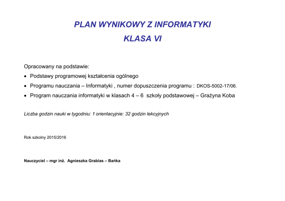PLAN WYNIKOWY Z INFORMATYKI KLASA VI Opracowany na podstawie: • Podstawy programowej kształcenia ogólnego • Programu nauczania – Informatyki , numer dopuszczenia programu : DKOS-5002-17/06. • Program nauczania informatyki w klasach 4 – 6 szkoły podstawowej – Grażyna Koba Liczba godzin nauki w tygodniu: 1 orientacyjnie: 32 godzin lekcyjnych Rok szkolny 2015/2016 Nauczyciel – mgr inż. Agnieszka Grabias – Bańka Rozdział Numer lekcji Osiągnięcia uczniów – podstawowe – uczeń: Temat lekcji Osiągnięcia uczniów – ponadpodstawowe uczeń: 1 2 1. Regulamin Pracowni. 2. Zapoznanie się z wymaganiami oraz z przedmiotowymi zasadami oceniania z informatyki. Wie, czego będzie się uczył w Określa, jakie elementy bieżącym roku szkolnym . składają się na legalną Zna zakres wymagań dokumentację przedmiotowych. oprogramowania (licencja, Zna i respektuje obowiązki i numer licencji, ewentualnie prawa użytkownika szkolnej karta rejestracyjna). pracowni komputerowej. Wskazuje na zagrożenia Wyjaśnia pojęcia: piractwo wynikające z użytkowania komputerowe, prawa pirackiego oprogramowania. autorskie. Zna korzyści wynikające z Podaje przykłady przejawów legalnego użytkowania piractwa komputerowego. oprogramowania. I. Obliczenia komputerowe 3 1. Obliczenia na komputerowym kalkulatorze. Wykonuje obliczenia na komputerowym kalkulatorze. Wykonuje obliczenia wielodziałaniowe I. Obliczenia komputerowe 4 2. Budowa i zastosowanie arkusza kalkulacyjnego. Określa przeznaczenie arkusza kalkulacyjnego. Poprawnie rozpoczyna i kończy pracę z arkuszem. Wyróżnia podstawowe elementy arkusza, zna pojęcie: wiersz, kolumna, komórka. Wprowadza dane do komórek. Swobodnie porusza się po arkuszach skoroszytu. Poprawnie nazywa poszczególne elementy arkusza. Wprowadza dane do arkusza różnicując ich format i wskazany adres. Potrafi wskazać 2 Odczytuje adres komórki. Zaznacza obszar komórek. Rozróżnia skoroszyt i arkusz oraz wyjaśnia sposób operowania nimi. zastosowanie arkusza w życiu codziennym i w praktyce szkolnej. I. Obliczenia komputerowe 5 6 3. Tworzymy tabelę w arkuszu kalkulacyjnym – wykaz osiągnięć Wykonuje tabelę w arkuszu według wzoru ( nadaje nazwy wierszom i kolumnom ). Nadaje danym określony format. Formatuje tabelę według podanego wzoru ( wygląd, szerokość i wysokość kolumn i wierszy, rodzaj czcionki ). Wypełnia komórki serią danych metodą przeciągania. Wymienia typy danych wprowadzonych do arkusza. I. Obliczenia komputerowe 7 4. Obliczenia w arkuszu kalkulacyjnym. Zapisuje proste wyrażenia Zapisuje bardziej złożone wyrażenia arytmetyczne w arytmetyczne w postaci postaci formuł. formuł. Samodzielnie posługuje się Do zapisu wyrażeń stosuje arkuszem do wykonywania samodzielnie, poprawnie prostych obliczeń (dodawanie, wybrane operatory odejmowanie, mnożenie, arytmetyczne. dzielenie, średnia). Stosuje optymalne metody wprowadzania danych do komórek arkusza kalkulacyjnego. I. Obliczenia 8 5. Tworzymy wykres w arkuszu Potrafi dobrać do tworzonego 3 Projektuje tabelę w arkuszu kalkulacyjnym. Dobiera właściwy format danych. Ustala parametry formatowania tabeli w celu odpowiedniego eksponowania jej zawartości. Przenosi i kopiuje zawartość komórek metodą przeciągania ( wypełniania ) oraz za pośrednictwem Schowka. Potrafi swobodnie komputerowe kalkulacyjnym. arkusza odpowiedni model wykresu. Modyfikuje wykres według podanych wskazówek. Potrafi odczytać dane z wykresu słupkowego i kołowego. skorzystać z Kreatora wykresu. Samodzielnie modyfikuje wykres. Potrafi wkleić wykres do edytora tekstu. I. Obliczenia komputerowe 9 6. Sprawdzian nr 1. II. Animacje w programie Logomocja 10 1. Program Logomocja. Tworzymy rysunek w Edytorze postaci i zapisujemy plik. Tworzy rysunki w Edytorze postaci, korzystając z umiejętności rysowania zdobytych podczas korzystania z programu Paint. Korzysta z podstawowych narzędzi programu Edytor postaci. Zapisuje rysunek w pliku. Potrafi samodzielnie odszukać potrzebne narzędzia programu Edytor postaci. Znajduje podobieństwa i różnice między programami Paint i Edytor postaci. II. Animacje w programie Logomocja 11 2. W Edytorze postaci tworzymy animację. Projektuje i tworzy proste animacje. Stosuje metodę kopiowania przez Schowek do tworzenia klatek animacji. Stosuje przekształcenia obrazu do tworzenia ciekawych animacji. Zapisuje i odtwarza animacje. Samodzielnie korzysta z programu edukacyjnego przeznaczonego do tworzenia animacji, tworząc animacje według własnego pomysłu. II. Animacje w 12 3. Sztuczki ułatwiające przygotowanie animacji. Zna kilka sztuczek ułatwiających tworzenie Potrafi zastosować poznane sztuczki w różnych 4 programie Logomocja III. Programujemy w Logomocji animacji, m.in. korzysta z opcji Podgląd klatek, Rysowanie tekstem. 13 1. Piszemy prosty program. 14 2. Rysowanie okręgów i kół – język Logo 15 3. Rysowanie gwiazd na niebie – język Logo III. Programujemy w Logomocji III. Programujemy w Logomocji III. Programujemy w Logomocji 16 4. Zmieniamy postać żółwia. 5 zadaniach. Pisze proste programy w Wyjaśnia na czym polega Logo., używając tworzenie programu, na podstawowych poleceń przykładzie pisania (korzysta z opisu poleceń programu w języku zamieszczonego w edukacyjnym Logo. podręczniku). Stosuje wielokrotne Zna zastosowanie polecenia powtarzanie tych samych Powtórz ( rysuje figurę, w czynności do tworzenia której powtarzają się pewne programów według elementy). własnego pomysłu. Pisze bezparametrowe Pisze samodzielnie procedury rysowania figur bezparametrowe procedury złożonych z kół lub okręgów; rysowania figur złożonych z Korzysta z funkcji jld podczas kół lub okręgów; wybierania koloru malowania. Korzysta z funkcji jld podczas wybierania koloru malowania. Pisze procedury z parametrem z pomocą nauczyciela; Korzysta z suwaka do zmiany wartości parametru z pomocą nauczyciela; Pisze procedury z