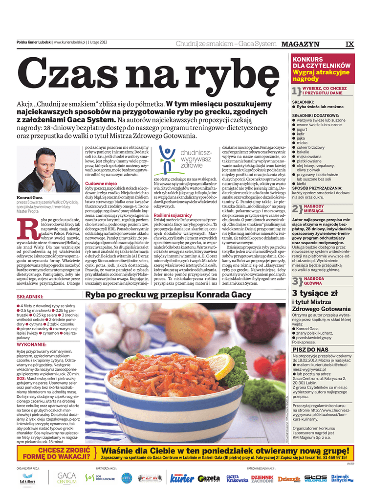 Polska Kurier Lubelski | www.kurierlubelski.pl | 1 lutego 2013 Chudnij ze smakiem – Gaca System MAGAZYN KONKURS DLA CZYTELNIKÓW Czas na rybę Wygraj atrakcyjne nagrody CO CHCESZ 1} WYBIERZ, I PRZYGOTUJ DANIE SKŁADNIKI: a Ryba świeża lub mrożona Akcja „Chudnij ze smakiem” zbliża się do półmetka. W tym miesiącu poszukujemy najciekawszych sposobów na przygotowanie ryby po grecku, zgodnych z założeniami Gaca System. Na autorów najciekawszych propozycji czekają nagrody: 28-dniowy bezpłatny dostęp do naszego programu treningowo-dietetycznego oraz przepustka do walki o tytuł Mistrza Zdrowego Gotowania. pod żadnym pozorem nie obtaczajmy ryby w panierce i nie smażmy. Dodatek soli i cukru, jeśli chodzi o walory smakowe, jest zbędny (mamy wiele przypraw, których spokojnie możemy używać),acogorsza,możebardzonegatywnieodbićsięnanaszymzdrowiu. sze oferty, czekające na nas w sklepach. Niezawszesątyminajlepszymidlazdrowia. Z tych względów warto unikać tanich ryb takich jak panga i tilapia, które zewzględunaskandalicznysposóbhodowli,pozbawionesąwieluwłaściwości odżywczych. yba po grecku to danie, którerodowiciGrecytak naprawdę mają okazję jadać w Polsce. Potrawa, wbrew swojej nazwie, wywodzi się nie ze słonecznej Hellady, ale znad Wisły. Dla nas ważniejsze od pochodzenia są jej właściwości odżywcze i skuteczność przy wspomaganiu utrzymania formy. Właściwie przygotowanarybapogreckumożebyć bardzo cennym elementem programu dietetycznego. Pamiętajmy, żeby nie zepsuć tego, co jest wartościowe przez niewłaściwe przyrządzenie. Dlatego SKŁADNIKI: Ryba po grecku wg przepisu Konrada Gacy Konrad Gaca prezes Stowarzyszenia Walki z Otyłością, specjalista żywieniowy, trener klasy Master Propta R Roślinni sojusznicy Dzisiaj możecie Państwo poznać przepisKonradaGacynarybępogrecku.Ta propozycja dania jest skarbnicą cennych dodatków warzywnych. Marchewka,czylistałyelementwszystkich sposobów na rybę po grecku, to wspaniałeźródłobetakarotenu.Wartozwrócić także uwagę na seler, który zawiera między innymi witaminy A, E, C oraz minerały:fosfor,cynkiwapń.Matakże szereg właściwości istotnych dla osób, które akurat są w trakcie odchudzania. Seler może pomóc przyspieszyć ten proces. Ta niskokaloryczna roślina przyspiesza przemianę materii i ma SKŁADNIKI DODATKOWE: a warzywa świeże lub suszone a owoce świeże lub suszone a jogurt a kefir a jajka a mleko a cukier brzozowy a bakalie a mąka owsiana a płatki owsiane a olej lniany, rzepakowy, oliwa z oliwek a przyprawy i zioła świeże lub suszone bez soli a kiełki SPOSÓB PRZYRZĄDZANIA: każdy oprócz: smażenia i dodawania soli oraz cukru. działaniemoczopędne.Pomagaoczyszczaćorganizmztoksynorazkorzystnie wpływa na nasze samopoczucie, co także ma niebanalny wpływ na panowanienadotyłością;dziękitemułatwiej jestnamnieulegaćpokusiepodjadania między posiłkami oraz jedzenia zbyt dużych porcji. Czosnek to sprawdzony naturalny antybiotyk, o którym warto pamiętać nie tylko jesienią i zimą. Dodatek pietruszki nada daniu świeżego smakuorazwzbogacijeodużeilościwitaminy C. Pamiętajmy także, że pietruszka działa „mobilizująco” na pracę układu pokarmowego i moczowego, dzięki czemu przydaje się w czasie odchudzania. O pomidorach w czasie akcji „Chudnij ze smakiem” pisaliśmy już wielokrotnie. Dzisiaj przypomnimy, że nietylkomająmnóstwominerałówiwitamin,aletakżelikopenodziałaniuantynowotworowym. Dzisiejszapropozycjarybypogrecku to tylko jeden z wielu możliwych sposobów przygotowania tego dania. CzekamynaPaństwapropozycjeipomysły, mogą one różnić się od „klasycznej” ryby po grecku. Najważniejsze, żeby powstały z wykorzystaniem podanych niżej składników i były zgodne z założeniami Gaca System. Cudowne mięso Rybygoszcząnapolskichstołachzdecydowanie zbyt rzadko. Niejadanie ich to dużybłąd.Sąoneznakomitymźródłem łatwo strawnego białka oraz kwasów tłuszczowychzrodzinyomega-3.Toone pomagająuregulowaćpracęukładukrążenia: zmniejszają ryzyko wystąpienia zawału serca i arytmii, regulują poziom cholesterolu, podnosząc poziom tzw. dobrego czyli HDL. Ponadto korzystnie oddziałują na funkcjonowanie układu nerwowego. Pamiętajmy także, że poprawiająodpornośćorazmajądziałanie przeciwzapalne. Na długiej liście zalet ryb musi znaleźć się także informacja o dużych ilościach witamin (A i D oraz zgrupyB)orazminerałów(fosfor,selen, cynk, potas, jod), jakich dostarczają. Prawda, że warto pamiętać o rybach przyukładaniucodziennejdiety?Nakoniec jeszcze jedna uwaga. Kupując je, uważajmy na pozornie najkorzystniej- 2} NAGRODY MIESIĄCA Autor najlepszego przepisu miesiąca otrzyma w nagrodę bezpłatny, 28-dniowy, indywidualnie opracowany żywieniowo-treningowy program odchudzający oraz wsparcie motywacyjne. Usługa będzie dostępna przez nowoczesny system wideokonferencji na platformie www.sos-odchudzanie.pl. Wyróżnienie miesiąca będzie przepustką do walki o nagrodę główną. 3} NAGRODA GŁÓWNA 3 tysiące zł i tytuł Mistrza Zdrowego Gotowania a 4 filety z dowolnej ryby ze skórą a 0,5 kg marchewki a 0,25 kg pietruszki a 0,25 kg selera a 3 średniej wielkości cebule a 2 średnie pomidory a cytryna a 2 ząbki czosnku a pieprz naturalny a rozmaryn, najlepiej świeży a cynamon a olej rzepakowy Otrzyma go autor przepisu wybranego przez kapitułę, w skład której wejdą: a Konrad Gaca, a znany polski kucharz, a przedstawiciel grupy Polskapresse. WYKONANIE: PISZ DO NAS FOT.AGNIESZKAKOZŁOWSKA/GACACENTRUM Rybę przyprawiamy rozmarynem, pieprzem, zgniecionym ząbkiem czosnku i skrapiamy cytryną. Odstawiamy na pół godziny. Następnie wkładamy do naczynia żaroodpornego i pieczemy w piekarniku ok. 20 min. SOS: Marchewkę, seler i pietruszkę gotujemy na parze. Uparowany seler oraz pomidory bez skórki rozdrabniamy blenderem na jednolitą masę. Do tej masy dodajemy ząbek rozgn