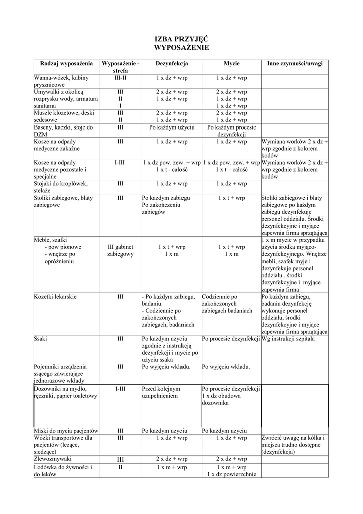 IZBA PRZYJĘĆ WYPOSAŻENIE Rodzaj wyposażenia Wanna-wózek, kabiny prysznicowe Umywalki z okolicą rozprysku wody, armatura sanitarna Muszle klozetowe, deski sedesowe Baseny, kaczki, słoje do DZM Kosze na odpady medyczne zakaźne Kosze na odpady medyczne pozostałe i specjalne Stojaki do kroplówek, stelaże Stoliki zabiegowe, blaty zabiegowe Meble, szafki - pow pionowe - wnętrze po opróżnieniu Wyposażenie strefa III-II Dezynfekcja Mycie 1 x dz + wrp 1 x dz + wrp III II I III II III 2 x dz + wrp 1 x dz + wrp III I-III III III III gabinet zabiegowy 2 x dz + wrp 1 x dz + wrp 1 x dz + wrp 2 x dz + wrp 2 x dz + wrp 1 x dz + wrp 1 x dz + wrp Po każdym użyciu Po każdym procesie dezynfekcji 1 x dz + wrp 1 x dz + wrp Wymiana worków 2 x dz + wrp zgodnie z kolorem kodów 1 x dz pow. zew. + wrp 1 x dz pow. zew. + wrp Wymiana worków 2 x dz + 1 x t - całość 1 x t – całość wrp zgodnie z kolorem kodów 1 x dz + wrp 1 x dz + wrp Po każdym zabiegu Po zakończeniu zabiegów 1 x t + wrp 1xm 1 x t + wrp Stoliki zabiegowe i blaty zabiegowe po każdym zabiegu dezynfekuje personel oddziału. Środki dezynfekcyjne i myjące zapewnia firma sprzątająca 1 x m mycie w przypadku 1 x t + wrp użycia środka myjąco1xm dezynfekcyjnego. Wnętrze mebli, szafek myje i dezynfekuje personel oddziału , środki dezynfekcyjne i myjące zapewnia firma Codziennie po Po każdym zabiegu, zakończonych badaniu dezynfekcję zabiegach badaniach wykonuje personel oddziału, środki dezynfekcyjne i myjące zapewnia firma sprzątająca Po procesie dezynfekcji Wg instrukcji szpitala Kozetki lekarskie III - Po każdym zabiegu, badaniu. - Codziennie po zakończonych zabiegach, badaniach Ssaki III Pojemniki urządzenia ssącego zawierające jednorazowe wkłady Dozowniki na mydło, ręczniki, papier toaletowy III Po każdym użyciu zgodnie z instrukcją dezynfekcji i mycie po użyciu ssaka Po wyjęciu wkładu. Po wyjęciu wkładu. Miski do mycia pacjentów Wózki transportowe dla pacjentów (leżące, siedzące) Zlewozmywaki Lodówka do żywności i do leków I-III Przed kolejnym uzupełnieniem Po procesie dezynfekcji 1 x dz obudowa dozownika III III Po każdym użyciu 1 x dz + wrp Po każdym użyciu 1 x dz + wrp III 2 x dz + wrp 1 x m + wrp II Inne czynności/uwagi 2 x dz + wrp 1 x m + wrp 1 x dz powierzchnie Zwrócić uwagę na kółka i miejsca trudno dostępne (dezynfekcja) Drzwi klamki i okolice dotykowe drzwi Parapety Kaloryfery Listwy odbojowe Szafki, regały, stoliki, biurka, taborety, krzesła, fotele Aparaty telefoniczne Lampy i urządzenia biurowe Tablice informacyjne Lampy bakteriobójcze Lampy oświetleniowe sufitowe Lustra i osłony żarówek nad lustrami Okna i żaluzje Włączniki, wyłączniki, kontakty, gniazda, listwy, przedłużacze zewnętrzne 1 x t + wrp 1 x t + wrp 1 x t + wrp III II I 1 x t + wrp wrp II-III I III II-I 1 x dz + wrp III I-II 1xt 1xt 1xt III-II III I-III wrp 1 x t + wrp 1xt II I II I-II Ścienne, sufitowe-III 1 x dz + wrp 1 x dz + wrp 1 x dz 1 x dz + wrp 1 x dz 1 x dz pow poziome 1 x t pow pionowe i pow poziome trudno dostępne 1 x t meble tapicerowane 1 x dz + wrp 1 x m + wrp 1xm 1 x m + wrp 1 x k + wrp I-II 1 x dz III (gabinet zabiegowy, pokoje badań) I I-III 1xm II-III Wyciągi wentylacyjne Pajęczyny I-III I-III Dezynfekcja miejscowa doraźna. W przypadku użycia środka myjącodezynfekcyjnego 1 x t mycie Odkurzanie całej powierzchni, zwrócenie uwagi na miejsca trudno dostępne 1 x dz + wrp 1 x dz + wrp 1 x dz I-III Kratki ściekowe syfony W przypadku użycia środka myjącodezynfekcyjnego 1 x m mycie Uwzględnić obudowę oraz świetlówkę 1 x k + wrp 1xt 1 x m + wrp Należy wlać środek dezynfekcyjny 1 x k + wrp Wrp omiatanie