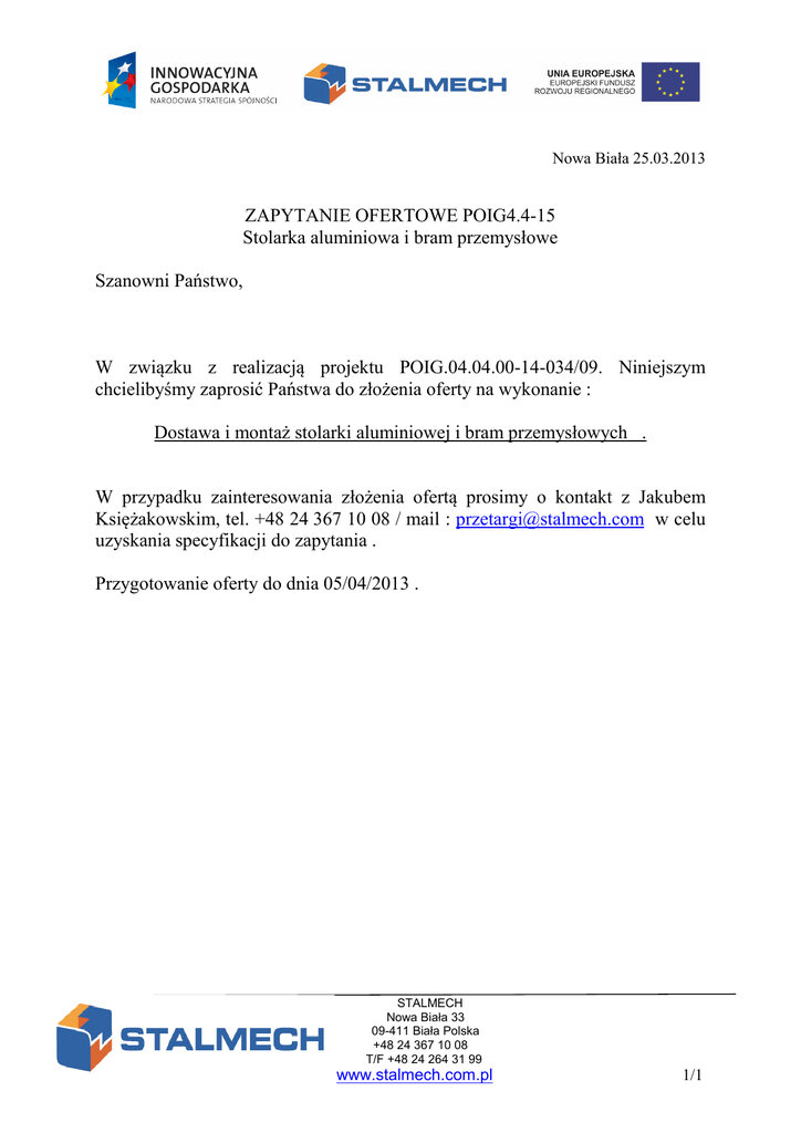 Nowa Biała 25.03.2013 ZAPYTANIE OFERTOWE POIG4.4-15 Stolarka aluminiowa i bram przemysłowe Szanowni Państwo, W związku z realizacją projektu POIG.04.04.00-14-034/09. Niniejszym chcielibyśmy zaprosić Państwa do złożenia oferty na wykonanie : Dostawa i montaż stolarki aluminiowej i bram przemysłowych . W przypadku zainteresowania złożenia ofertą prosimy o kontakt z Jakubem Księżakowskim, tel. +48 24 367 10 08 / mail : [email protected] w celu uzyskania specyfikacji do zapytania . Przygotowanie oferty do dnia 05/04/2013 . STALMECH Nowa Biała 33 09-411 Biała Polska +48 24 367 10 08 T/F +48 24 264 31 99 www.stalmech.com.pl 1/1