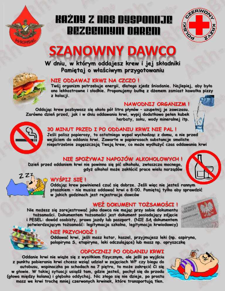 W dniu, w którym oddajesz krew i jej składniki Pamiętaj o właściwym przygotowaniu NIE ODDAWAJ KRWI NA CZCZO ! Twój organizm potrzebuje energii, dlatego zjedz śniadanie. Najlepiej, aby było ono lekkostrawne i słodkie. Proponujemy bułkę z dżemem zamiast kawałka pizzy z kolacji. NAWODNIJ ORGANIZM ! Oddając krew pozbywasz się około pół litra płynów – uzupełnij je zawczasu. Zarówno dzień przed, jak i w dniu oddawania krwi, wypij dodatkowo pełen kubek herbaty, soku, wody mineralnej itp. 30 MINUT PRZED I PO ODDANIU KRWI NIE PAL ! Jeśli palisz papierosy, to ostatniego wypal wychodząc z domu, a nie przed wejściem do oddania krwi. Zawarte w papierosach substancje smoliste niepotrzebnie zagęszczają Twoją krew, co może wydłużyć czas oddawania krwi NIE SPOŻYWAJ NAPOJÓW ALKOHOLOWYCH ! Dzień przed oddaniem krwi nie powinno się pić alkoholu, zwłaszcza mocnego, gdyż alkohol może zakłócić prace wielu narządów WYŚPIJ SIĘ ! Oddając krew powinieneś czuć się dobrze. Jeśli więc nie jesteś rannym ptaszkiem – nie musisz oddawać krwi o 8:00. Pamiętaj tylko aby sprawdzić w jakich godzinach jest rejestracja dawców WEŹ DOKUMENT TOŻSAMOŚCI ! Nie możesz się zarejestrować jako dawca nie mając przy sobie dokumentu tożsamości. Dokumentem tożsamości jest dokument posiadający zdjęcie i PESEL: dowód osobisty, prawo jazdy lub paszport. (NIE SĄ dokumentem potwierdzającym tożsamość: legitymacja szkolna, legitymacja krwiodawcy) NIE PRZYCHODŹ ! Oddawać krwi, jeśli masz katar, kaszel, przyjmujesz leki (np. aspiryna, polopiryna S, etopiryna, leki odczulające) lub masz np. opryszczkę ODPOCZNIJ PO ODDANIU KRWI Oddanie krwi nie wiąże się z wysiłkiem fizycznym, ale jeśli po wyjściu z punktu pobierania krwi chcesz wziąć udział w zajęciach WF czy biegu do autobusu, wspinaczka po schodach na 7 piętro, to może zakręcić Ci się w głowie. W takiej sytuacji usiądź tam, gdzie jesteś, pochyl się do przodu (głowa między kolana) i głęboko oddychaj. Nic złego się nie dzieje, po prostu masz we krwi trochę mniej czerwonych krwinek, które transportują tlen.