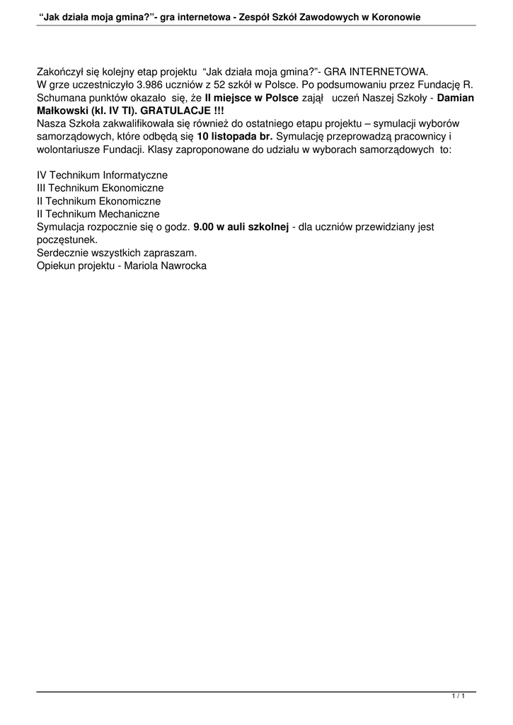 “Jak działa moja gmina?”- gra internetowa - Zespół Szkół Zawodowych w Koronowie Zakończył się kolejny etap projektu “Jak działa moja gmina?”- GRA INTERNETOWA. W grze uczestniczyło 3.986 uczniów z 52 szkół w Polsce. Po podsumowaniu przez Fundację R. Schumana punktów okazało się, że II miejsce w Polsce zajął uczeń Naszej Szkoły - Damian Małkowski (kl. IV TI). GRATULACJE !!! Nasza Szkoła zakwalifikowała się również do ostatniego etapu projektu – symulacji wyborów samorządowych, które odbędą się 10 listopada br. Symulację przeprowadzą pracownicy i wolontariusze Fundacji. Klasy zaproponowane do udziału w wyborach samorządowych to: IV Technikum Informatyczne III Technikum Ekonomiczne II Technikum Ekonomiczne II Technikum Mechaniczne Symulacja rozpocznie się o godz. 9.00 w auli szkolnej - dla uczniów przewidziany jest poczęstunek. Serdecznie wszystkich zapraszam. Opiekun projektu - Mariola Nawrocka 1/1