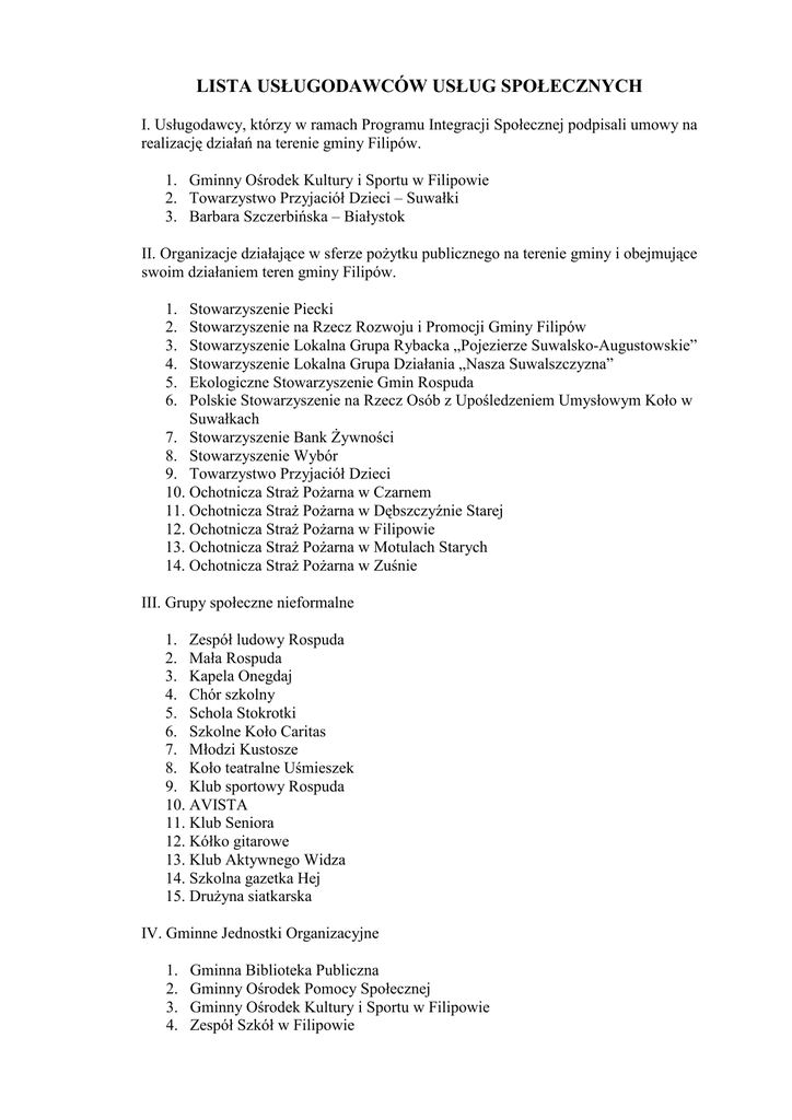 LISTA USŁUGODAWCÓW USŁUG SPOŁECZNYCH I. Usługodawcy, którzy w ramach Programu Integracji Społecznej podpisali umowy na realizację działań na terenie gminy Filipów. 1. Gminny Ośrodek Kultury i Sportu w Filipowie 2. Towarzystwo Przyjaciół Dzieci – Suwałki 3. Barbara Szczerbińska – Białystok II. Organizacje działające w sferze poŜytku publicznego na terenie gminy i obejmujące swoim działaniem teren gminy Filipów. 1. 2. 3. 4. 5. 6. Stowarzyszenie Piecki Stowarzyszenie na Rzecz Rozwoju i Promocji Gminy Filipów Stowarzyszenie Lokalna Grupa Rybacka „Pojezierze Suwalsko-Augustowskie” Stowarzyszenie Lokalna Grupa Działania „Nasza Suwalszczyzna” Ekologiczne Stowarzyszenie Gmin Rospuda Polskie Stowarzyszenie na Rzecz Osób z Upośledzeniem Umysłowym Koło w Suwałkach 7. Stowarzyszenie Bank śywności 8. Stowarzyszenie Wybór 9. Towarzystwo Przyjaciół Dzieci 10. Ochotnicza StraŜ PoŜarna w Czarnem 11. Ochotnicza StraŜ PoŜarna w Dębszczyźnie Starej 12. Ochotnicza StraŜ PoŜarna w Filipowie 13. Ochotnicza StraŜ PoŜarna w Motulach Starych 14. Ochotnicza StraŜ PoŜarna w Zuśnie III. Grupy społeczne nieformalne 1. Zespół ludowy Rospuda 2. Mała Rospuda 3. Kapela Onegdaj 4. Chór szkolny 5. Schola Stokrotki 6. Szkolne Koło Caritas 7. Młodzi Kustosze 8. Koło teatralne Uśmieszek 9. Klub sportowy Rospuda 10. AVISTA 11. Klub Seniora 12. Kółko gitarowe 13. Klub Aktywnego Widza 14. Szkolna gazetka Hej 15. DruŜyna siatkarska IV. Gminne Jednostki Organizacyjne 1. 2. 3. 4. Gminna Biblioteka Publiczna Gminny Ośrodek Pomocy Społecznej Gminny Ośrodek Kultury i Sportu w Filipowie Zespół Szkół w Filipowie