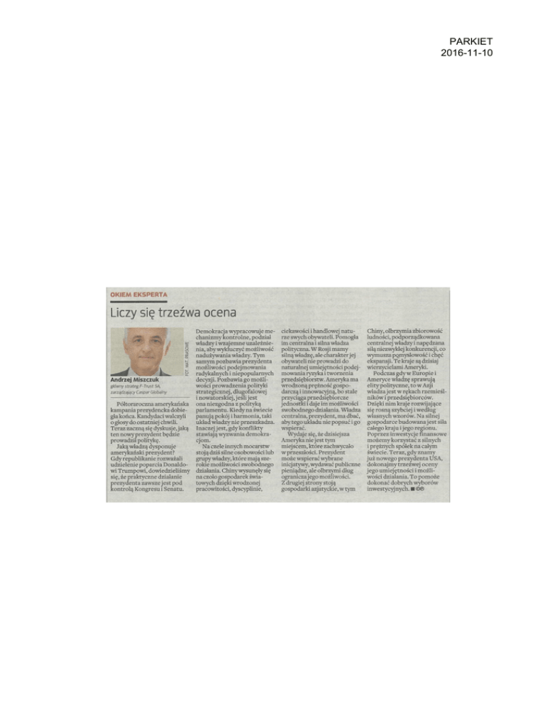 PARKIET 2016-11-10 OKIEM EKSPERTA Liczy się trzeźwa ocena Demokracja wypracowuje me chanizmy kontrolne, podział władzy i wzajemne uzależnie nia, aby wykluczyć możliwość nadużywania władzy.Tym samym pozbawia prezydenta możliwości podejmowania radykalnych i niepopularnych decyzji. Pozbawia go możli Andrzej Miszczak wości prowadzenia polityki główny strateg F-Trust SA, strategicznej, długofalowej zarządzający Caspar Globalny i nowatorskiej, jeśli jest Półtoraroczna amerykańska ona niezgodna z polityką kampania prezydencka dobie parlamentu. Kiedy na świecie gła końca. Kandydaci walczyli panują pokój i harmonia, taki układ władzy nie przeszkadza. o głosy do ostatniej chwili. Teraz zacznąsię dyskusje,jaką Inaczej jest, gdy konflikty stawiają wyzwania demokra ten nowy prezydent będzie cjom. prowadził politykę. Na czele innych mocarstw Jaką władzą dysponuje stoją dziś silne osobowościlub amerykański prezydent? grapy władzy, które mają sze Gdy republikanie rozważali udzielenie poparcia Donaldo rokie możliwości swobodnego wi Trampowi, dowiedzieliśmy działania. Chiny wysunęły się na czołogospodarek świa się, że praktyczne działanie towych dzięki wrodzonej prezydenta zawsze jest pod kontrolą Kongresu i Senatu. pracowitości, dyscyplinie, ciekawości i handlowej natu rze swychobywateli. Pomogła im centralnai silna władza polityczna. W Rosji mamy silną władzę,ale charakter jej obywateli nie prowadzi do naturalnej umiejętności podej mowania ryzyka i tworzenia przedsiębiorstw. Ameryka ma wrodzoną prężnośćgospo darczą i innowacyjną, bo stale przyciąga przedsiębiorcze jednostki i daje im możliwości swobodnego działania. Władza centralna, prezydent, ma dbać, aby tego układu nie popsuć i go wspierać. Wydaje się,że dzisiejsza Ameryka nie jest tym miejscem, które zachwycało w przeszłości.Prezydent może wspierać wybrane inicjatywy, wydawać publiczne pieniądze, ale olbrzymi dług ogranicza jego możliwości. Z drugiejstrony stoją gospodarki azjatyckie, w tym Chiny, olbrzymia zbiorowość ludności, podporządkowana centralnej władzy i napędzana siłą niezwykłej konkurencji, co wymusza ppmysłowość i chęć ekspansji. Te kraje są dzisiaj wierzycielami Ameryki. Podczas gdy w Europie i Ameryce władzę sprawują elity polityczne, to w Azji władza jest w rękach rzemieśl ników i przedsiębiorców. Dzięki nim kraje rozwijające się rosną szybciej i według własnych wzorów. Na silnej gospodarce budowana jest siła całego kraju i jego regionu. Poprzez inwestycje finansowe możemy korzystać z silnych i prężnych spółek na całym świecie. Teraz, gdy znamy już nowego prezydenta USA, dokonajmy trzeźwejoceny jego umiejętności i możli wości działania. To pomoże dokonać dobrych wyborów inwestycyjnych. • ©O