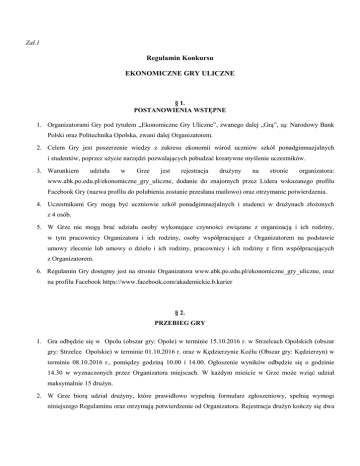 Zał.1 Regulamin Konkursu EKONOMICZNE GRY ULICZNE § 1. POSTANOWIENIA WSTĘPNE 1. Organizatorami Gry pod tytułem „Ekonomiczne Gry Uliczne”, zwanego dalej „Grą”, są: Narodowy Bank Polski oraz Politechnika Opolska, zwani dalej Organizatorem. 2. Celem Gry jest poszerzenie wiedzy z zakresu ekonomii wśród uczniów szkół ponadgimnazjalnych i studentów, poprzez użycie narzędzi pozwalających pobudzać kreatywne myślenie uczestników. 3. Warunkiem udziału w Grze jest rejestracja drużyny na stronie organizatora: www.abk.po.edu.pl/ekonomiczne_gry_uliczne, dodanie do znajomych przez Lidera wskazanego profilu Facebook Gry (nazwa profilu do polubienia zostanie przesłana mailowo) oraz otrzymanie potwierdzenia. 4. Uczestnikami Gry mogą być uczniowie szkół ponadgimnazjalnych i studenci w drużynach złożonych z 4 osób. 5. W Grze nie mogą brać udziału osoby wykonujące czynności związane z organizacją i ich rodziny, w tym pracownicy Organizatora i ich rodziny, osoby współpracujące z Organizatorem na podstawie umowy zlecenie lub umowy o dzieło i ich rodziny, pracownicy i ich rodziny z firm współpracujących z Organizatorem. 6. Regulamin Gry dostępny jest na stronie Organizatora www.abk.po.edu.pl/ekonomiczne_gry_uliczne, oraz na profilu Facebook https://www.facebook.com/akademickie.b.karier § 2. PRZEBIEG GRY 1. Gra odbędzie się w Opolu (obszar gry: Opole) w terminie 15.10.2016 r. w Strzelcach Opolskich (obszar gry: Strzelce Opolskie) w terminie 01.10.2016 r. oraz w Kędzierzynie Koźlu (Obszar gry: Kędzierzyn) w terminie 08.10.2016 r., pomiędzy godziną 10.00 i 14.00. Ogłoszenie wyników odbędzie się o godzinie 14.30 w wyznaczonych przez Organizatora miejscach. W każdym mieście w Grze może wziąć udział maksymalnie 15 drużyn. 2. W Grze biorą udział drużyny, które prawidłowo wypełnią formularz zgłoszeniowy, spełnią wymogi niniejszego Regulaminu oraz otrzymają potwierdzenie od Organizatora. Rejestracja drużyn kończy się dwa dni przed startem Gry. W przypadku większej ilości zgłoszeń niż liczba miejsc, o zakwalifikowaniu do Gry decyduje kolejność zgłoszeń. 3. Start poszczególnych drużyn nastąpi pomiędzy godziną 10.00 a 10.30. 4. Początkiem Gry, a jednocześnie godziną startu dla kolejnych drużyn, będzie odebranie przez uczestników na wskazany wcześniej profil Facebook, zdjęć oraz pytań konkursowych. 5. Każda drużyna wybiera podczas rejestracji "Lidera", który jest osobą upoważnioną do kontaktu z Organizatorem. 6. Zadanie drużyny polega na tym, aby dotrzeć do kolejnych 10 miejsc – punktów kontrolnych (widocznych na przesłanych zdjęciach) w dowolnej kolejności, a następnie odesłać na profil Facebook Organizatora, własnoręcznie wykonaną czytelną fotografię całej drużyny na tle punktu kontrolnego. 7. Po przesłaniu fotografii na profil Facebook Organizatora, Lider drużyny otrzyma pytanie konkursowe na swój profil Facebook. 8. Po odesłaniu odpowiedzi na pytanie konkursowe drużyna może kontynuować Grę. 9. Liczba punktów kontrolnych przypisanych do każdej drużyny jest taka sama i wynosi 10. 10. Wygrywa drużyna, która w najkrótszym czasie zaliczy 10 punktów kontrolnych i prawidłowo odpowie na pytania. 11. Za odpowiedź nieprawidłową drużyna otrzyma 15 minut karnych, które zostaną doliczone do czasu drużyny. 12. Czas początkowy, to godzina otrzymania zdjęć na profilu Facebook Lidera zgłoszonej drużyny. Czas końcowy, to godzina otrzymania przez Organizatora ostatniego zdjęcia i odpowiedzi na zadane pytania na profilu Facebook. 13. Drużyny pokonują trasę, zgodnie z zasadami ruchu drogowego. 14. Drużyna, która złamie zasady ruchu drogowego, zostanie wykluczona z Gry. Łamanie zasad ruchu drogowego, zgłoszone przez innych uczestników, zostanie uwzględnione na podstawie dokumentacji przedstawiającej wykroczenie (np. zdjęcie wykonane telefonem). 15. Uczestnicy Gry mogą korzystać ze wszystkich dostępnych źródeł wiedzy. 16. Uczestnicy podczas Gry mogą poruszać się wyłącznie pieszo. 17. Sposób przygotowania do Gry zależy tylko i wyłącznie od drużyny. 18. Dla zwycięzców, za zajęcie I, II i III miejsca, przewidziane są nagrody, którymi będą karty podarunkowe do sklepu oferującego książki, multimedia, materiały dydaktyczne, itp. Informacja o ich wartości znajdzie się na profilu Facebook Oganizatora. 19. Niepełnoletni uczestnicy zobowiązani są do dostarczenia Organizatorom zgody na uczestnictwo w Grze, podpisane przez opiekunów prawnych. 20. Każdy z uczestników Gry powinien być w dobrym stanie zdrowia umożliwiającym udział w Grze. 21. W przypadku naruszenia przez członka drużyny lub całą drużynę niniejszego Regulaminu, złamania zasad fair play, utrudniania gry innym drużynom, Organizatorzy mają prawo wykluczyć drużynę z Gry (wymagane jest udokumentowanie wykroczeń w formie filmu lub zdjęcia). 22. Poprzez dokonanie rejestracji/zgłoszenia udziału w Grze, uczestnicy wyrażają zgodę na: wzięcie udziału w Grze na warunkach określonych w niniejszym Regulaminie, potwierdzają zapoznanie się z Regulaminem, oraz zgodę na przetwarzanie przez Politechnikę Opolską danych osobowych w zakresie niezbędnym dla przeprowadzenia Konkursu (zgodnie z ustawą o ochronie danych osobowych z dn. 29.08.1997 r. (Dz. U. z 2016 r. poz. 922). Administratorem danych osobowych uczestników Gry jest Politechnika Każdy Opolska. uczestnik Konkursu posiada prawo dostępu do swoich danych osobowych oraz ich poprawiania. § 3. POSTANOWIENIA KOŃCOWE 1. Kontakt z Organizatorem w przypadku zmian składu drużyny lub innych spraw związanych z Grą: tel. 77 449 81 70 lub 603 66 38 50. 2. Organizator zastrzega sobie prawo do zmiany Regulaminu, w tym terminu przebiegu Gry. Nowy Regulamin obowiązuje od momentu jego zamieszczenia na stronie Organizatora www.abk.po.edu.pl/ekonomiczne_gry_uliczne. Dalsze uczestnictwo w Grze, po zmianie Regulaminu, uznaje się