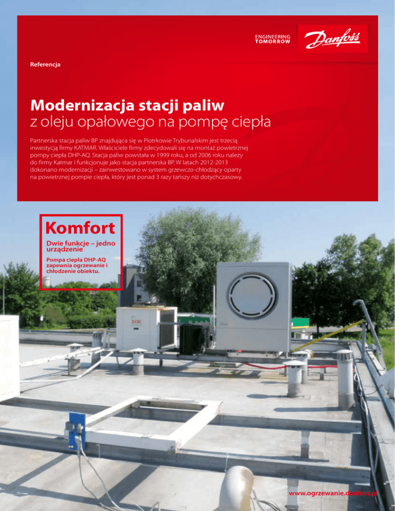 Referencja Modernizacja stacji paliw z oleju opałowego na pompę ciepła Partnerska stacja paliw BP znajdująca się w Piotrkowie Trybunalskim jest trzecią inwestycją firmy KATMAR. Właściciele firmy zdecydowali się na montaż powietrznej pompy ciepła DHP-AQ. Stacja paliw powstała w 1999 roku, a od 2006 roku należy do firmy Katmar i funkcjonuje jako stacja partnerska BP. W latach 2012-2013 dokonano modernizacji – zainwestowano w system grzewczo-chłodzący oparty na powietrznej pompie ciepła, który jest ponad 3 razy tańszy niż dotychczasowy. Komfort Dwie funkcje – jedno urządzenie Pompa ciepła DHP-AQ zapewnia ogrzewanie i chłodzenie obiektu. www.ogrzewanie.danfoss.pl Stacja paliw w Piotrkowie Trybunalskim to 216 m2 powierzchni użytkowej. Na stacji znajduje się bar bistro, sklep, a obok myjnia automatyczna o powierzchni 88 m2. W pomieszczeniach stacji paliw temperatura wynosi 18-20°C, myjnia zaś potrzebuje temperatury do 10°C. Dotychczasowy system grzewczy składał się z kotłowni olejowej. Woda użytkowa ogrzewana była przez elektryczne podgrzewacze. Całość zlokalizowana jest na zapleczu. Latem chłodzenie stacji oparte było o klimatyzatory. „Problemem dla nas był drogi system DANE INWESTYCJI • Lokalizacja: Piotrków Trybunalski, woj. łódzkie • Inwestor: Katmar Sp. z o.o. • Powierzchnia: 304 m2. • Odnawialne źródła energii: Powietrzna pompa ciepła DHP-AQ • Odbiorniki ciepła: Ogrzewanie Grzejnikowe, Klimakonwektory • Typ budynku: Stacja paliw, modernizacja, 2013 r. ogrzewania oraz przestarzały, energochłonny system chłodzenia, który zawierał aktualnie niestosowany czynnik chłodniczy” – komentuje wiceprezes Piotr Łeń. W 2013 roku została zainstalowana powietrzna pompa ciepła DHP-AQ, która zapewnia ogrzewanie i chłodzenie przez klimakonwektory. Instalacja wykonana j es t na w y mie nnik u p ośre dnim, co zabezpiecza ją w przypadku braku dop ł y wu energii. Z uwagi na to, że na stacji jest niewielkie zużycie ciepłej wody to w dalszym ciągu jest ona przygotowywana przez podgrzewacze elektryczne. Porównanie kosztów ogrzewania i chłodzenia w PLN Koszt ogrzewania i chłodzenia przed modernizacją: • Olej opałowy i energia elektryczna: 31 000 zł/rok Koszt ogrzewanie i chłodzenia po modernizacji: • Pompa ciepła: DHP-AQ 18 kW – 9 500 zł/rok Tani w eksploatacji system grzewczy z DHP-AQ w Sierpowie zmotywował nas do zmodernizowania systemu grzewczego i chłodzenia na stacji paliw w Piotrkowie. Oszczęności będziemy mogli przeznaczyć na rozwój firmy. Podsumowuje Piotr Łeń. Porównanie kosztów ogrzewania i chłodzenia w PLN 35 000 30 000 25 000 20 000 15 000 Roczny koszt oleju opałowego i energii elektrycznej na ogrzewanie i chłodzenie 31 000 zł/rok Podsumowanie: 10 000 Koszty ogrzewania i chłodzenia obiektu zostały zredukowane ponad 5 000 60% w stosunku do dotychczasowych kosztów. Inwestor płaci trzy razy mniej, a inwestycja zwróci się 0 w ciągu 4 lat. Zredukowane koszty o ok. 69% Koszt energii elektrycznej zużytej przez pompę ciepła DHP-AQ 18 kW na rok – 9 500 zł Danfoss Poland Sp. z o. o • ul. Chrzanowska 5 • 05-825 Grodzisk Mazowiecki Tel.: + 48 22 755 09 00 • Fax: +48 22 755 07 01 • E-mail: [email protected] • www.pompyciepla.danfoss.pl Danfoss nie ponosi odpowiedzialności za możliwe błędy w katalogach, broszurach i innych materiałach drukowanych. Danfoss zastrzega sobie prawo do wprowadzenia zmian w produktach bez uprzedzenia. Dotyczy to również produktów już zamówionych. Zamienniki mogą być dostarczone bez dokonywania jakichkolwiek zmian w specyfi kacjach już uzgodnionych. Wszystkie znaki towarowe w tym materiale są własnością odpowiednich spółek Danfoss, logotyp Danfoss są znakami towarowymi Danfoss A/S. Wszystkie prawa zastrzeżone. Informacje zawarte w broszurze mogą ulec zmianie jako efekt stałych ulepszeń i modernizacji naszych urządzeń. VZ.IF.E2.49_Sep2014