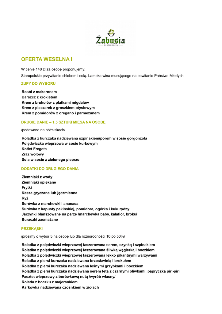 OFERTA WESELNA I W cenie 140 zł za osobę proponujemy: Staropolskie przywitanie chlebem i solą. Lampka wina musującego na powitanie Państwa Młodych. ZUPY DO WYBORU Rosół z makaronem Barszcz z krokietem Krem z brokułów z płatkami migdałów Krem z pieczarek z groszkiem ptysiowym Krem z pomidorów z oregano i parmezanem DRUGIE DANIE – 1,5 SZTUKI MIĘSA NA OSOBĘ /podawane na półmiskach/ Roladka z kurczaka nadziewana szpinakiem/porem w sosie gorgonzola Polędwiczka wieprzowa w sosie kurkowym Kotlet Fregata Zraz wołowy Sola w sosie z zielonego pieprzu DODATKI DO DRUGIEGO DANIA Ziemniaki z wody Ziemniaki opiekane Frytki Kasza gryczana lub jęczmienna Ryż Surówka z marchewki i ananasa Surówka z kapusty pekińskiej, pomidora, ogórka i kukurydzy Jarzynki blanszowane na parze /marchewka baby, kalafior, brokuł Buraczki zasmażane PRZEKĄSKI /prosimy o wybór 5 na osobę lub dla różnorodności 10 po 50%/ Roladka z polędwiczki wieprzowej faszerowana serem, szynką i szpinakiem Roladka z polędwiczki wieprzowej faszerowana śliwką węgierką i boczkiem Roladka z polędwiczki wieprzowej faszerowana lekko pikantnymi warzywami Roladka z piersi kurczaka nadziewana brzoskwinią i brokułem Roladka z piersi kurczaka nadziewana leśnymi grzybkami i boczkiem Roladka z piersi kurczaka nadziewana serem feta z czarnymi oliwkami, papryczka piri-piri Pasztet wieprzowy z borówkową nutą /wyrób własny/ Rolada z boczku z majerankiem Karkówka nadziewana czosnkiem w ziołach Indyk w maladze Indyk z gruszką i żurawiną Schab nadziewany śliwką lub ogórkiem w galarecie Befsztyk tatarski z klasycznymi dodatkami Tatar z łososia Śledź w oleju Śledź w śmietanie Śledź po kaszubska Rolmopsy Tatar śledziowy na obłoku z jabłka lub na pumperniklu Pstrąg w galarecie Sola pod pierzynką z jarzyn Dorsz po grecku Terrina z soli ze szpinakiem i kurkami Tymbaliki drobiowe Tymbaliki wieprzowe Różyczki z łososia i cukinii w miodowym sosie Ruloniki z szynki garnirowane zielonym groszkiem i szparagiem Szynka westfalska z melonem Jajko w sosie tatarskim Jajko z kawiorem czarnym i czerwonym DODATKI Pieczywo jasne i ciemne Sosy Marynaty /ogórki, papryczki, pieczarki/ SAŁATKI /dwie do wyboru/ Sałatka grecka z fetą Sałatka jarzynowa polska Sałatka z kurczakiem Sałatka z tuńczykiem i kukurydza Sałatka Caprese z mozarellą, zielonym Pesto i bazylią PO PÓŁNOCY NA GORĄCO /jedno danie do wyboru/ Pikantna zupa gulaszowa Bogracz z lanymi kluseczkami Bulion i pałka z kurczaka w sosie miodowo-musztardowym