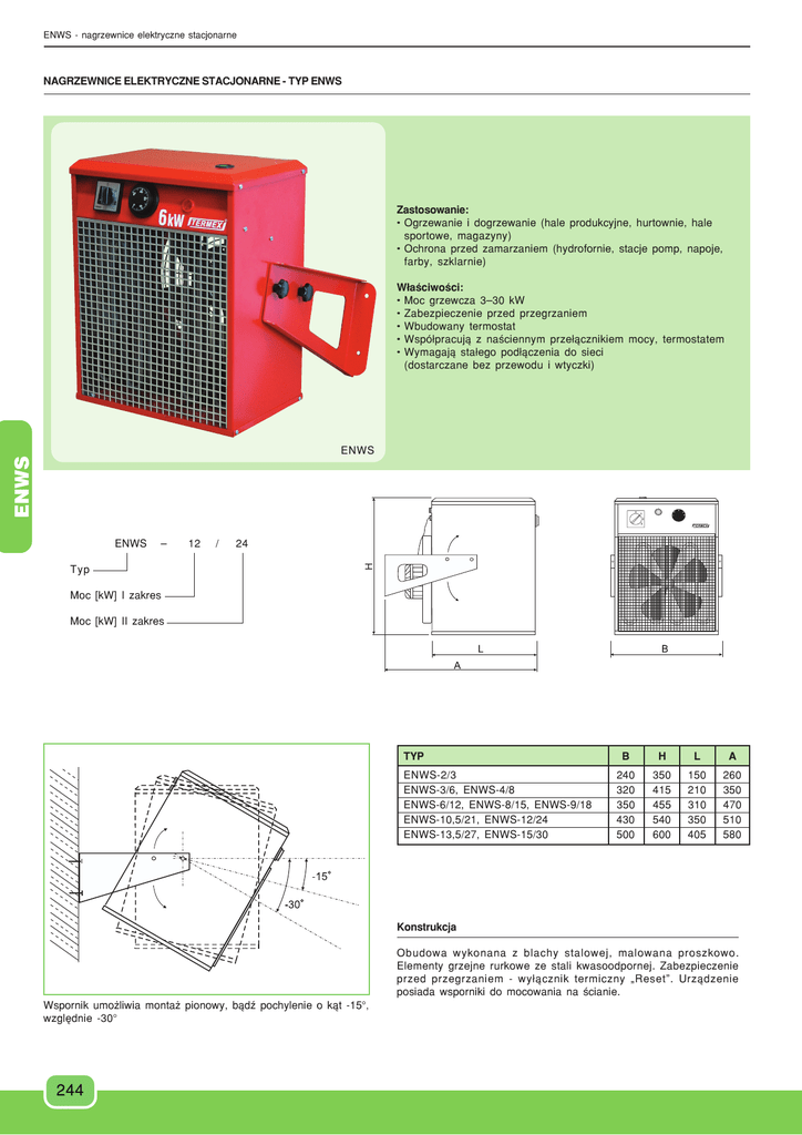 ENWS - nagrzewnice elektryczne stacjonarne NAGRZEWNICE ELEKTRYCZNE STACJONARNE - TYP ENWS Zastosowanie: • Ogrzewanie i dogrzewanie (hale produkcyjne, hurtownie, hale sportowe, magazyny) • Ochrona przed zamarzaniem (hydrofornie, stacje pomp, napoje, farby, szklarnie) W³aœciwoœci: • Moc grzewcza 3–30 kW • Zabezpieczenie przed przegrzaniem • Wbudowany termostat • Wspó³pracuj¹ z naœciennym prze³¹cznikiem mocy, termostatem • Wymagaj¹ sta³ego pod³¹czenia do sieci (dostarczane bez przewodu i wtyczki) ENWS ENWS – 12 / 24 Typ Moc [kW] I zakres Moc [kW] II zakres TYP ENWS-2/3 ENWS-3/6, ENWS-4/8 ENWS-6/12, ENWS-8/15, ENWS-9/18 ENWS-10,5/21, ENWS-12/24 ENWS-13,5/27, ENWS-15/30 B H L A 240 320 350 430 500 350 415 455 540 600 150 210 310 350 405 260 350 470 510 580 Konstrukcja Obudowa wykonana z blachy stalowej, malowana proszkowo. Elementy grzejne rurkowe ze stali kwasoodpornej. Zabezpieczenie przed przegrzaniem - wy³¹cznik termiczny „Reset”. Urz¹dzenie posiada wsporniki do mocowania na œcianie. Wspornik umo¿liwia monta¿ pionowy, b¹dŸ pochylenie o k¹t -15°, wzglêdnie -30° 244 ENWS - nagrzewnice elektryczne stacjonarne ENWS2/3 TYP ENWS3/6 ENWS4/8 ENWS6/12 ENWS8/15 ENWS9/18 ENWS10,5/21 ENWS12/24 ENWS13,5/27 24 27 ENWS15/30 Moc grzewcza [kW] 3 6 8 12 15 18 21 Stopnie mocy [kW] 0-2-3 0-3-6 0-4-8 0-6-12 0-8-15 0-9-18 0-10,5-21 230 V~ 400 V 3N~ 400 V 3N~ 400 V 3N~ 400 V 3N~ 400 V 3N~ 400 V 3N~ 400 V 3N~ 400 V 3N~ 400 V 3N~ Pr¹d znamionowy/fazê [A] 13,2 9,0 13,4 17,9 22,3 26,6 30,8 35,2 39,7 44 Bezpiecznik (Zabezpieczenie w sieci) 16 A 10 A 16 A 20 A 25 A 32 A 32 A 40 A 40 A 50 A 30 70 70 120 120 120 95 95 130 130 Nominalna wydajnoœæ wentylatora [m3/s] 0,12 0,25 0,25 0,40 0,40 0,40 0,44 0,44 0,75 0,75 Masa [kg] 6,2 10,7 11,2 15,8 18,1 19,3 24,3 25,4 31,5 31,5 Poziom mocy akustycznej LWA dB (A) 45 49 49 53 53 53 58 58 63 63 355 240 210 400 320 290 400 320 290 440 350 410 440 350 410 440 350 410 510 430 400 510 430 400 545 510 450 545 510 450 Zasilanie Moc silnika wentylatora [W] Wymiary - wysokoœæ [mm] - szerokoœæ [mm] - g³êbokoœæ [mm] Zasiêg strumienia powietrza 30 0-12-24 0-13,5-27 0-15-30 Dobór nagrzewnic Obliczenie mocy nagrzewnicy Wymagana moc nagrzewnicy zale¿y od nastêpuj¹cych czynników: – kubatury pomieszczenia w m3 – rodzaju i jakoœci izolacji termicznej budynku – wymaganego przyrostu temperatury w pomieszczeniu, w stosunku do temperatury na zewn¹trz budynku t – sposobu wykorzystania nagrzewnicy (Ÿród³o ogrzewania podstawowego lub dodatkowego). Przyrost temperatury t jest ró¿nic¹ pomiêdzy wymagan¹ temperatur¹ wewn¹trz ogrzewanego pomieszczenia, a temperatur¹ na zewn¹trz budynku. t = tw – tz tw - wymagana temperatura wewn¹trz budynku °C tz - temperatura na zewn¹trz °C TABELA DOBORU Wymagany przyrost temperatury Moc nagrzewnicy [kW] 3 kW 6 kW 12 kW 15 kW 18 kW 21 kW 24 kW 27 kW 30 kW 3 Kubatura pomieszczenia [m ] [ t] 40°C 35°C 30°C 25°C 20°C 15°C 10°C 8 kW 57*-100 90*-120 100*-150 120*-180 150*-210 200*-280 300*-420 150*-210 180*-240 210*-300 240*-360 300*-420 410*-560 600*-840 200*-280 300*-410 375*-500 450*-610 520*-700 600*-800 670*-900 240*-320 360*-480 450*-600 540*-710 630*-840 720*-960 800*-1080 290*-400 410*-600 500*-750 610*-900 780*-1050 900*-1200 1030*-1380 320*-480 480*-720 600*-900 720*-1080 940*-1260 1080*-1440 1200*-1620 400*-560 600*-840 750*-1050 900*-1260 1080*-1470 1260*-1680 1400*-1880 550*-760 810*-1120 1000*-1400 1210*-1680 1470*-1960 1650*-2200 1850*-2500 800*-1120 1200*-1680 1500*-2100 1800*-2510 2100*-2900 2400*-3300 2700*-3700 740*-1000 880*-1150 1100*-1500 1300*-1750 1500*-2050 2050*-2700 2900*-4000 Uwaga! - (*)Wartoœci dotycz¹ obiektów o s³abej izolacji termicznej. - Jeœli nagrzewnica pracuje okresowo, szybkie nagrzanie pomieszczenia wymaga wiêkszej mocy, ni¿ wynika to z tabeli. W tym przypadku nale¿y wybraæ nagrzewnicê o mocy oko³o dwukrotnie wiêkszej. - Wartoœci z tabeli nie obowi¹zuj¹ przy dzia³aj¹cej wentylacji. 245 TERMEX • tel./fax: 12 285 1651, 12 285 2463 • www.termex.krakow.pl • [email protected] ENWS - nagrzewnice elektryczne stacjonarne Przyk³ad 1. Ogrzewanie podstawowe. Kubatura pomieszczenia 2900 m3. Wymagana temperatura w pomieszczeniu: +15°C. Izolacja termiczna budynku dobra. Najni¿sza temperatura na zewn¹trz -15°C, ¿¹dany przyrost temperatury 30°C. Bior¹c pod uwagê kubaturê oraz izolacjê termiczn¹, wybieramy dwie nagrzewnice ENWS-15/30 lub cztery nagrzewnice ENWS-8/15. Przyk³ad 2. Ogrzewanie dodatkowe. Istniej¹ce ogrzewanie nie wystarcza w zimie podczas mrozów. Brakuj¹ca energia ma byæ dostarczona przez nagrzewnicê. Kubatura pomieszczenia 1200 m3. Dodatkowy przyrost temperatury +10°C. Izolacja termiczna budynku s³aba (w tabeli z gwiazdk¹ *). Moc grzewcza, wynikaj¹ca z tabeli wynosi 12 kW. Wybieramy nagrzewnicê ENWS-6/12 lub dwie nagrzewnice ENWS-3/6. AKCESORIA TYP PODSTAWOWE PARAMETRY OPIS Termostat TA-3 Zakres 5-30°C Pr¹d max. 16 A/230 V Naœcienny termostat mechaniczny IP 20 Pr¹d max. 16 A/230 V Prze³¹cznik czteropo³o¿eniowy 0, 1, 2, 3. Monta¿ naœcienny Prze³¹cznik mocy £K 16R (£UK 16) 246 ENWS - nagrzewnice elektryczne stacjonarne 247 TERMEX • tel./fax: 12 285 1651, 12 285 2463 • www.termex.krakow.pl • [email protected]