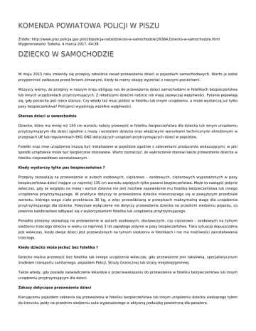 KOMENDA POWIATOWA POLICJI W PISZU Źródło: http://www.pisz.policja.gov.pl/o16/policja-radzi/dziecko-w-samochodzie/29384,Dziecko-w-samochodzie.html Wygenerowano: Sobota, 4 marca 2017, 04:38 DZIECKO W SAMOCHODZIE W maju 2015 roku zmieniły się przepisy odnośnie zasad przewożenia dzieci w pojazdach samochodowych. Warto je sobie przypomnieć zwłaszcza przed feriami zimowymi, kiedy to mamy okazję wyjechać z naszymi pociechami. Wszyscy wiemy, że przepisy w naszym kraju obligują nas do przewożenia dzieci samochodami w fotelikach bezpieczeństwa lub innych urządzeniach przytrzymujących. Z młodszymi dziećmi rodzice nie mają zazwyczaj wątpliwości. Pytania pojawiają się, gdy pociecha jest nieco starsza. Czy wtedy też musi jeździć w foteliku lub innym urządzeniu, a może wystarczą już tylko pasy bezpieczeństwa? Policjanci wyjaśniają wszelkie wątpliwości. Starsze dzieci w samochodzie Dziecko, które ma mniej niż 150 cm wzrostu należy przewozić w foteliku bezpieczeństwa dla dziecka lub innym urządzeniu przytrzymującym dla dzieci zgodnie z masą i wzrostem dziecka oraz właściwymi warunkami technicznymi określonymi w przepisach UE lub regulaminach EKG ONZ dotyczących urządzeń przytrzymujących dzieci w pojeździe. Foteliki oraz inne urządzenia muszą być instalowane w pojeździe zgodnie z zaleceniami producenta wskazującymi, w jaki sposób urządzenie może być bezpiecznie stosowane. Warto zaznaczyć, że wykroczenie stanowi także przewożenie dziecka w foteliku nieprawidłowo zainstalowanym. Kiedy wystarczy tylko pas bezpieczeństwa ? Przepisy zezwalają na przewożenie w autach osobowych, ciężarowo – osobowych, ciężarowych wyposażonych w pasy bezpieczeństwa dzieci mające co najmniej 135 cm wzrostu zapiętych tylko pasami bezpieczeństwa. Może to nastąpić jedynie wówczas, gdy ze względu na masę i wzrost dziecka nie jest możliwe zapewnienie mu fotelika bezpieczeństwa lub innego urządzenia przytrzymującego. W praktyce dotyczy to przewożenia dziecka mieszczącego się w powyższym przedziale wzrostu, którego waga ciała przekracza 36 kg, a więc przewidzianą w przepisach maksymalną wagę dla urządzenia przytrzymującego dla dziecka. Powyższe wyłączenie nie dotyczy przewożenia dziecka na przednim siedzeniu pojazdu, co powinno każdorazowo odbywać się z wykorzystaniem fotelika lub urządzenia przytrzymującego. Ponadto przepisy zezwalają na przewożenie w autach osobowych, dostawczych, czy ciężarowo – osobowych na tylnym siedzeniu trzeciego dziecka w wieku co najmniej 3 lat zapiętego jedynie w pasy bezpieczeństwa. Taka sytuacja dopuszczalna jest wówczas, kiedy dwoje dzieci jest przewożonych na tylnym siedzeniu w fotelikach i nie ma możliwości zainstalowania trzeciego. Kiedy dziecko może jechać bez fotelika ? Dziecko można przewozić bez fotelika lub innego urządzenia wówczas, gdy przewożone jest taksówką, specjalistycznym środkiem transportu sanitarnego, pojazdem Policji, Straży Granicznej lub straży miejskiej/gminnej. Także wtedy, gdy posiada zaświadczenie lekarskie o przeciwwskazaniu do przewożenia w foteliku bezpieczeństwa lub innym urządzeniu przytrzymującym dla dzieci. Zakazy dotyczące przewożenia dzieci Kierującemu pojazdem zabrania się przewożenia w foteliku bezpieczeństwa lub innym urządzeniu dziecka siedzącego tyłem do kierunku jazdy na przednim siedzeniu auta wyposażonego w aktywną poduszkę powietrzną dla pasażera. Zabrania się także przewożenia dziecka w wieku do lat 3 w samochodach niewyposażonych w pasy bezpieczeństwa i fotelik bezpieczeństwa lub w pasy bezpieczeństwa lub inne urządzenie przytrzymujące dla dzieci. Zabronione jest także przewożenie na przednim siedzeniu auta dziecka poza fotelikiem lub innym urządzeniem przytrzymującym mającego mniej niż 150 cm wzrostu. Ocena: 0/5 (0) Tweetnij