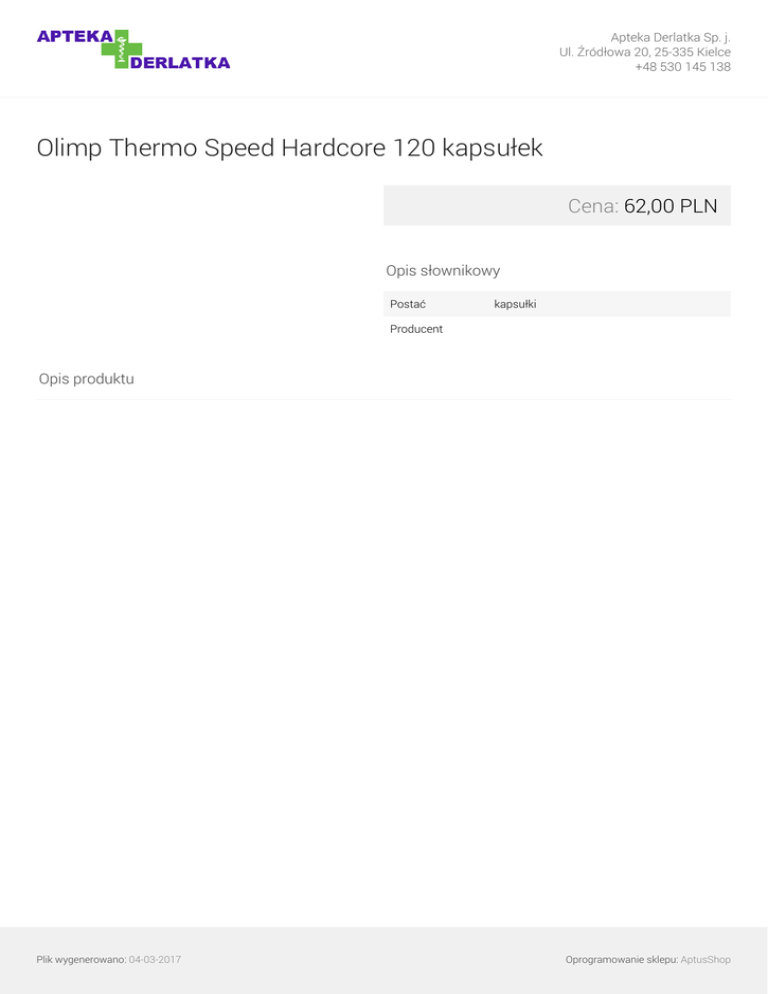 Apteka Derlatka Sp. j. Ul. Źródłowa 20, 25-335 Kielce +48 530 145 138 Olimp Thermo Speed Hardcore 120 kapsułek Cena: 62,00 PLN Opis słownikowy Postać kapsułki Producent Opis produktu Plik wygenerowano: 04-03-2017 Powered by TCPDF (www.tcpdf.org) Oprogramowanie sklepu: AptusShop