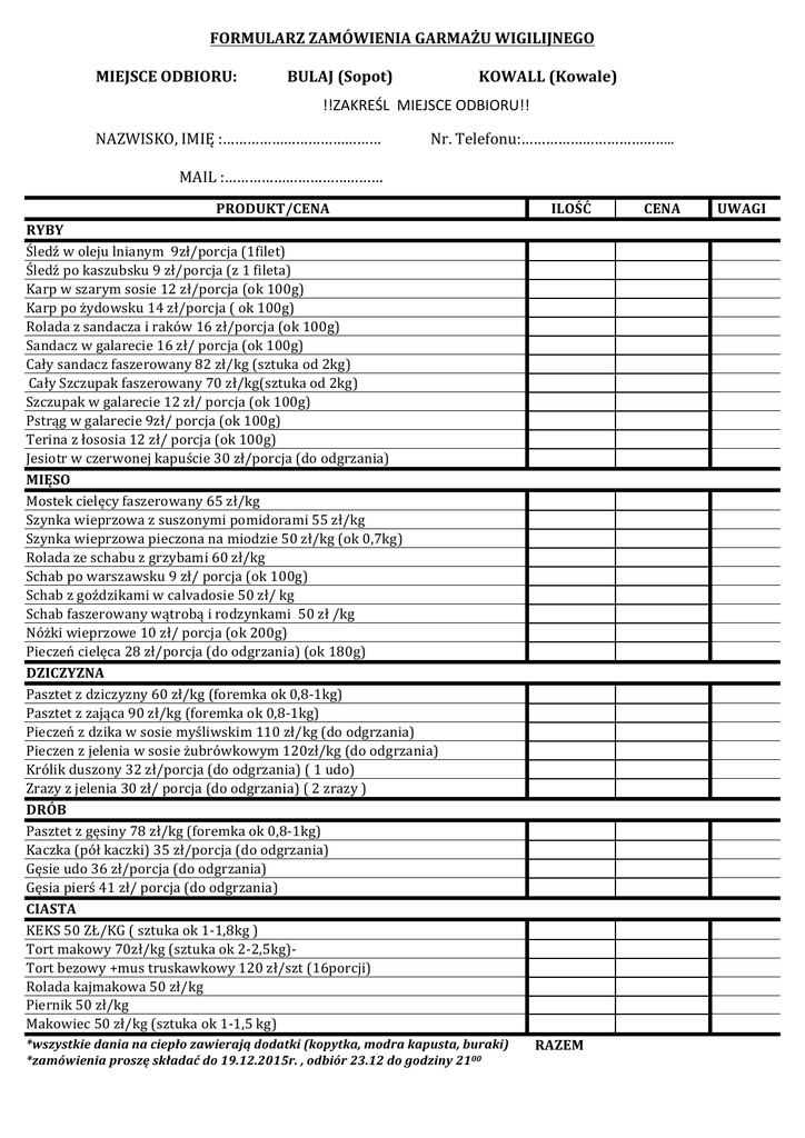 FORMULARZ ZAMÓWIENIA GARMAŻU WIGILIJNEGO MIEJSCE ODBIORU: BULAJ (Sopot) KOWALL (Kowale) !!ZAKREŚL MIEJSCE ODBIORU!! NAZWISKO, IMIĘ :………………………………… MAIL :………………………………… Nr. Telefonu:……………………………….. PRODUKT/CENA RYBY Śledź w oleju lnianym 9zł/porcja (1filet) Śledź po kaszubsku 9 zł/porcja (z 1 fileta) Karp w szarym sosie 12 zł/porcja (ok 100g) Karp po żydowsku 14 zł/porcja ( ok 100g) Rolada z sandacza i raków 16 zł/porcja (ok 100g) Sandacz w galarecie 16 zł/ porcja (ok 100g) Cały sandacz faszerowany 82 zł/kg (sztuka od 2kg) Cały Szczupak faszerowany 70 zł/kg(sztuka od 2kg) Szczupak w galarecie 12 zł/ porcja (ok 100g) Pstrąg w galarecie 9zł/ porcja (ok 100g) Terina z łososia 12 zł/ porcja (ok 100g) Jesiotr w czerwonej kapuście 30 zł/porcja (do odgrzania) MIĘSO Mostek cielęcy faszerowany 65 zł/kg Szynka wieprzowa z suszonymi pomidorami 55 zł/kg Szynka wieprzowa pieczona na miodzie 50 zł/kg (ok 0,7kg) Rolada ze schabu z grzybami 60 zł/kg Schab po warszawsku 9 zł/ porcja (ok 100g) Schab z goździkami w calvadosie 50 zł/ kg Schab faszerowany wątrobą i rodzynkami 50 zł /kg Nóżki wieprzowe 10 zł/ porcja (ok 200g) Pieczeń cielęca 28 zł/porcja (do odgrzania) (ok 180g) DZICZYZNA Pasztet z dziczyzny 60 zł/kg (foremka ok 0,8-‐1kg) Pasztet z zająca 90 zł/kg (foremka ok 0,8-‐1kg) Pieczeń z dzika w sosie myśliwskim 110 zł/kg (do odgrzania) Pieczen z jelenia w sosie żubrówkowym 120zł/kg (do odgrzania) Królik duszony 32 zł/porcja (do odgrzania) ( 1 udo) Zrazy z jelenia 30 zł/ porcja (do odgrzania) ( 2 zrazy ) DRÓB Pasztet z gęsiny 78 zł/kg (foremka ok 0,8-‐1kg) Kaczka (pół kaczki) 35 zł/porcja (do odgrzania) Gęsie udo 36 zł/porcja (do odgrzania) Gęsia pierś 41 zł/ porcja (do odgrzania) CIASTA KEKS 50 ZŁ/KG ( sztuka ok 1-‐1,8kg ) Tort makowy 70zł/kg (sztuka ok 2-‐2,5kg)-‐ Tort bezowy +mus truskawkowy 120 zł/szt (16porcji) Rolada kajmakowa 50 zł/kg Piernik 50 zł/kg Makowiec 50 zł/kg (sztuka ok 1-‐1,5 kg) ILOŚĆ UWAGI RAZEM *wszystkie dania na ciepło zawierają dodatki (kopytka, modra kapusta, buraki) *zamówienia proszę składać do 19.12.2015r. , odbiór 23.12 do godziny 2100 CENA