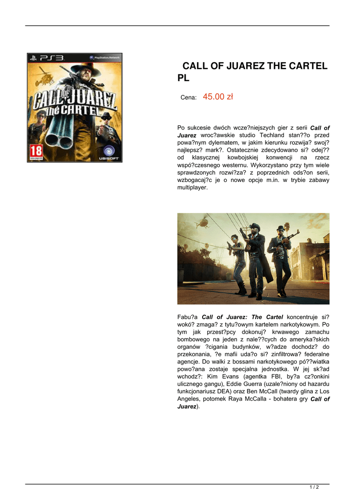 CALL OF JUAREZ THE CARTEL PL Cena: 45.00 zł Po sukcesie dwóch wcze?niejszych gier z serii Call of Juarez wroc?awskie studio Techland stan??o przed powa?nym dylematem, w jakim kierunku rozwija? swoj? najlepsz? mark?. Ostatecznie zdecydowano si? odej?? od klasycznej kowbojskiej konwencji na rzecz wspó?czesnego westernu. Wykorzystano przy tym wiele sprawdzonych rozwi?za? z poprzednich ods?on serii, wzbogacaj?c je o nowe opcje m.in. w trybie zabawy multiplayer. Fabu?a Call of Juarez: The Cartel koncentruje si? wokó? zmaga? z tytu?owym kartelem narkotykowym. Po tym jak przest?pcy dokonuj? krwawego zamachu bombowego na jeden z nale??cych do ameryka?skich organów ?cigania budynków, w?adze dochodz? do przekonania, ?e mafii uda?o si? zinfiltrowa? federalne agencje. Do walki z bossami narkotykowego pó??wiatka powo?ana zostaje specjalna jednostka. W jej sk?ad wchodz?: Kim Evans (agentka FBI, by?a cz?onkini ulicznego gangu), Eddie Guerra (uzale?niony od hazardu funkcjonariusz DEA) oraz Ben McCall (twardy glina z Los Angeles, potomek Raya McCalla - bohatera gry Call of Juarez). 1/2 Zadaniem tria stró?ów prawa jest schwytanie przywódcy niebezpiecznego kartelu. Pod??aj?c jego tropem bohaterowie gry przemierzaj? Kaliforni?, Arizon? i Nowy Meksyk, by dotrze? do tytu?owego Juarez w Meksyku. Ka?dy z nich ma przy tym w?asne motywy dzia?ania i problemy, z którymi musi si? zmierzy?. Dzi?ki temu wcielaj?c si? w ró?nych bohaterów gracze maj? okazj? zobaczy? histori? w nieco innym ?wietle. Ró?ne s? te? zako?czenia gry. Zobacz wideo: 2/2 Powered by TCPDF (www.tcpdf.org)