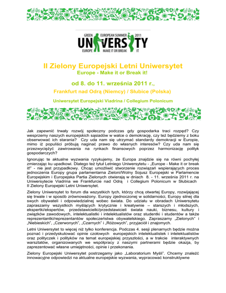 II Zielony Europejski Letni Uniwersytet Europe - Make it or Break it! od 8. do 11. września 2011 r., Frankfurt nad Odrą (Niemcy) / Słubice (Polska) Uniwersytet Europejski Viadrina / Collegium Polonicum Jak zapewnić trwały rozwój społeczny podczas gdy gospodarka traci rozpęd? Czy wesprzemy naszych europejskich sąsiadów w walce o demokrację, czy też będziemy z boku obserwować ich starania? Czy uda nam się utrzymać standardy demokracji w Europie, mimo iż populiści próbują naginać prawo do własnych interesów? Czy uda nam się przezwyciężyć zawirowania na rynkach finansowych poprzez harmonizację polityk gospodarczych? Ignorując te aktualne wyzwania ryzykujemy, że Europa znajdzie się na równi pochyłej zmierzając ku upadkowi. Dlatego też tytuł Letniego Uniwersytetu - „Europe - Make it or break it!” - nie jest przypadkowy. Chcąc umożliwić stworzenie rozwiązań wspierających proces jednoczenia Europy grupa parlamentarna Zieloni/Wolny Sojusz Europejski w Parlamencie Europejskim i Europejska Partia Zielonych otwierają w dniach 8. - 11. września 2011 r. na Uniwersytecie Viadrina we Frankfurcie nad Odrą i Collegium Polonicum w Słubicach II Zielony Europejski Letni Uniwersytet. Zielony Uniwersytet to forum dla wszystkich tych, którzy chcą otwartej Europy, rozwijającej się trwale i w sposób zrównoważony. Europy zjednoczonej w solidarności, Europy silnej dla swych obywateli i odpowiedzialnej wobec świata. Do udziału w obradach Uniwersytetu zapraszamy wszystkich myślących krytycznie i kreatywnie – starszych i młodszych, ekspertki/ekspertów, przedstawicielki/przedstawicieli świata nauki, biznesu, kultury i związków zawodowych, intelektualistki i intelektualistów oraz studentki i studentów a także reprezentantki/reprezentantów społeczeństwa obywatelskiego. Zapraszamy „Zielonych” i „Niebieskich”, „Czerwonych”, „Czarnych” i „Różowych”, przyjaciół i znajomych. Letni Uniwersytet to więcej niż tylko konferencja. Podczas 4. sesji plenarnych będzie można poznać i przedyskutować opinie czołowych europejskich intelektualistek i intelektualistów oraz polityczek i polityków na temat europejskiej przyszłości, a w trakcie interaktywnych warsztatów, organizowanych we współpracy z naszymi partnerami będzie okazja, by zaprezentować własne umiejętności, opinie i przekonania. Zielony Europejski Uniwersytet postrzegamy jako „Laboratorium Myśli”. Chcemy znaleźć innowacyjne odpowiedzi na aktualne europejskie wyzwania, wypracować konstruktywne rozwiązania i koncepty. Pragniemy inicjować zmiany i tworzyć postęp – słowem - kreować przyszłość Europy. Będziemy słuchać i obserwować, czytać i dyskutować o tym, jak „udźwignąć Europę” … aby nie skazać jej na upadek. Biorąc udział w Letnim Uniwersytecie możesz także liczyć na swobodną atmosferę, dobrą zabawę z muzyką „na żywo” i wydarzeniami kulturalnymi w miłym towarzystwie. Viadrinę we Frankfurcie nad Odrą i Collegium Polonicum w Słubicach nie bez powodu wybraliśmy jako miejsce dyskusji i debat. Ten międzynarodowy Uniwersytet z siedzibą w dwóch miastach połączonych mostem nad Odrą jest miejscem symbolicznym łączącym na granicy dwóch krajów - Polski i Niemiec - także Europę. Program (organizatorzy zastrzegają sobie możliwość wprowadzenia zmian) Szczegółowa oraz regularnie aktualizowana wersja programu znajduje się na naszej stronie internetowej www.green-summer-university.eu . Wszystkie debaty plenarne i warsztaty będą tłumaczone na język polski, francuski, angielski oraz niemiecki (włoskie i hiszpańskie tłumaczenia zostaną potwierdzone) od 14.00 15.00 – 19.00 Czwartek 08 / 09 / 2011 Rejestracja na Uniwersytecie Viadrina Treningi (ok. 5 treningów jednocześnie): • • „Jak organizować kampanie społeczne w sieci?” • • „Jak interesująco pisać o polityce?” - kurs kreatywnego pisania Parlament: „Jak prowadzić negocjacje dotyczące zmian klimatu?” gry sytuacyjne więcej: www.green-summer-university.eu alternatywnie: 15.00 – 17.00 Wycieczki po mieście i okolicy: • „Slubfort” - City tour • Frankfurt nad Odrą – City tour • NaBu - Tour więcej: www.green-summer-university.eu alternatywnie: 15.00 – 17.00 Seans filmowy: „Welcome” 17.00 – 19.00 Sesje warsztatowe 1 (ok. 10 warsztatów jednocześnie): • • „Zielona gospodarka w krajach post- komunistycznych.” • • „Młodzi dla demokracji” „Wyzwania dla Europejskiej Polityki Bezpieczeństwa i Obrony: Piractwo w Somalii.” więcej: www.green-summer-university.eu 19.00-20.00 Kolacja „Slow Food” i „Kiermasz lokalnych produktów ekologicznych” (tbc) 20.00 Kino „Open Air” : "Salami Aleikum" Piątek 09 / 09 / 2011 10.00 - 11.30 Sesje warsztatowe 2: (ok. 10 warsztatów jednocześnie): • • • • 11.30 – 13.00 „Jak wykorzystać możliwości reformy Wspólnej Polityki Rolnej?” „Cyfrowe wykluczenie - dostęp do internetu prawem człowieka?” „Czy w równym społeczeństwie wszystkim żyje się lepiej?” więcej: www.green-summer-university.eu. Seans filmowy: „For a moment Freedom” alternatywnie: 9.30 – 14.30 Wizyty w lokalnych projektach / inicjatywach: • • • Wizyta w kopalni węgla brunatnego „Energie odnawialne - zielone miejsca pracy“ więcej: www.green-summer-university.eu alternatywnie: 11.30 – 15.00 Wycieczki: • „Slubfort” - City tour • • Frankfurt nad Odrą – City tour NaBu - Tour • więcej: www.green-summer-university.eu 15.00– 16.30 Performance: „Waste artist” (tbc) 16.30 – 17. 00 Otwarcie obrad Zielonego Uniwersytetu Powitanie: • Rebecca Harms i Daniel Cohn-Bendit - współprzewodniczący grupy parlamentarnej Zieloni/WSE w Parlamencie Europejskim • • Monica Frassoni - rzeczniczka Europejskiej Partii Zielonych Gunter Pleugner - prezydent Europejskiego Uniwersytetu Viadrina 17.00 – 17.30 Wykład wprowadzający: St