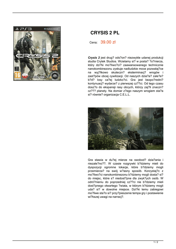 CRYSIS 2 PL Cena: 39.00 zł Crysis 2 jest drug? ods?on? niezwykle udanej produkcji studia Crytek Studios. Wcielamy si? w posta? ?o?nierza, który dzi?ki mo?liwo?ci? zaawansowanego technicznie nanokombinezonu zyskuje nadludzkie moce pozwalaj?ce na wyj?tkowo skuteczn? eksterminacj? wrogów i zast?pów obcej cywilizacji. Od naszych dzia?a? zale?e? b?d? losy ca?ej ludzko?ci. Gra jest bezpo?redni? kontynuacj? wydarze? z pierwszej cz??ci. Od tego czasu dosz?o do ekspansji rasy obcych, którzy zaj?li znaczn? cz??? planety. Na domiar z?ego naszym wrogiem sta?a si? równie? organizacja C.E.L.L. Gra stawia w du?ej mierze na swobod? dzia?ania i niezale?no??. W czasie rozgrywki b?dziemy mieli do dyspozycji ogromne lokacje, które b?dziemy mogli przemierza? na swój w?asny sposób. Korzystaj?c z mo?liwo?ci nanokombinezonu b?dziemy mogli dosta? si? do miejsc, które s? niedost?pne dla zwyk?ych osób. W odró?nieniu do poprzedniej cz??ci nie b?dziemy mieli dost?pnego otwartego ?wiata, w którym b?dziemy mogli uda? si? w dowolne miejsce. Dzi?ki temu zabiegowi mo?liwe sta?o si? przy?pieszenie tempa gry i postawienie wi?kszej uwagi na narracj?. 1/2 Najwi?kszym smaczkiem Crysis 2 jest nanokombinezon. W tej cz??ci uleg? on nieznacznej zmianie – do wyboru mamy dwa tryby, w których mo?e on dzia?a?. Pierwszy z nich jest w stanie ukry? nas przed wzrokiem przeciwnika, drugi zapewnia maksymalna obron?. Ponadto dzi?ki skafandrowi jeste?my w stanie zyska? ogromn? si??, szybko?? itd. W czasie rozgrywki gracz zyska mo?liwo?? ulepszania kombinezonu za pomoc? znalezionych katalizatorów. Zobacz wideo: Szczegóły wersja językowa POLSKA 2/2 Powered by TCPDF (www.tcpdf.org)