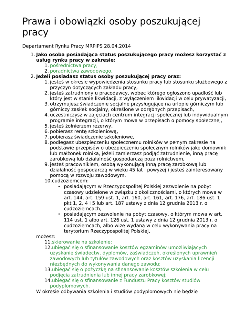 Prawa i obowiązki osoby poszukującej pracy Departament Rynku Pracy MRPiPS 28.04.2014 1. Jako osoba posiadająca status poszukującego pracy możesz korzystać z usług rynku pracy w zakresie: 1. pośrednictwa pracy, 2. poradnictwa zawodowego, 2. Jeżeli posiadasz status osoby poszukującej pracy oraz: 1. jesteś w okresie wypowiedzenia stosunku pracy lub stosunku służbowego z przyczyn dotyczących zakładu pracy, 2. jesteś zatrudniony u pracodawcy, wobec którego ogłoszono upadłość lub który jest w stanie likwidacji, z wyłączeniem likwidacji w celu prywatyzacji, 3. otrzymujesz świadczenie socjalne przysługujące na urlopie górniczym lub górniczy zasiłek socjalny, określone w odrębnych przepisach, 4. uczestniczysz w zajęciach centrum integracji społecznej lub indywidualnym programie integracji, o którym mowa w przepisach o pomocy społecznej, 5. jesteś żołnierzem rezerwy, 6. pobierasz rentę szkoleniową, 7. pobierasz świadczenie szkoleniowe, 8. podlegasz ubezpieczeniu społecznemu rolników w pełnym zakresie na podstawie przepisów o ubezpieczeniu społecznym rolników jako domownik lub małżonek rolnika, jeżeli zamierzasz podjąć zatrudnienie, inną pracę zarobkową lub działalność gospodarczą poza rolnictwem, 9. jesteś pracownikiem, osobą wykonującą inną pracę zarobkową lub działalność gospodarczą w wieku 45 lat i powyżej i jesteś zainteresowany pomocą w rozwoju zawodowym, 10.cudzoziemcem: • posiadającym w Rzeczypospolitej Polskiej zezwolenie na pobyt czasowy udzielone w związku z okolicznościami, o których mowa w art. 144, art. 159 ust. 1, art. 160, art. 161, art. 176, art. 186 ust. 1 pkt 1, 2, 4 i 5 lub art. 187 ustawy z dnia 12 grudnia 2013 r. o cudzoziemcach, • posiadającym zezwolenie na pobyt czasowy, o którym mowa w art. 114 ust. 1 albo art. 126 ust. 1 ustawy z dnia 12 grudnia 2013 r. o cudzoziemcach, albo wizę wydaną w celu wykonywania pracy na terytorium Rzeczypospolitej Polskiej, możesz: 11.skierowanie na szkolenie; 12.ubiegać się o sfinansowanie kosztów egzaminów umożliwiających uzyskanie świadectw, dyplomów, zaświadczeń, określonych uprawnień zawodowych lub tytułów zawodowych oraz kosztów uzyskania licencji niezbędnych do wykonywania danego zawodu; 13.ubiegać się o pożyczkę na sfinansowanie kosztów szkolenia w celu podjęcia zatrudnienia lub innej pracy zarobkowej; 14.ubiegać się o sfinansowanie z Funduszu Pracy kosztów studiów podyplomowych. W okresie odbywania szkolenia i studiów podyplomowych nie będzie przysługiwało Ci stypendium. Jako osoba poszukująca pracy możesz uzyskać zwrot kosztów przejazdu na badania lekarskie lub psychologiczne i powrotu do miejsca zamieszkania, jeżeli na badania te zostałeś skierowany przez Twój urząd pracy i dojeżdżasz do tych miejsc. 3. Jeżeli jesteś zarejestrowany jako poszukujący pracy w powiatowym urzędzie pracy, to do Twoich obowiązków należy: 1. zgłaszanie się w urzędzie pracy co najmniej raz na 90 dni w celu potwierdzenia zainteresowania pomocą określoną w ustawie; 2. zawiadamianie urzędu pracy w terminie 7 dni o wszelkich zmianach zawartych w karcie rejestracyjnej i oświadczeniach, 3. stawianie się w wyznaczonym terminie, ustalonym pomiędzy poszukującym pracy a urzędem pracy, a w razie niestawienia się w umówionym terminie powiadomienie urzędu pracy o przyczynie niestawiennictwa w ciągu 7 dni, 4. podjęcie przygotowania zawodowego dorosłych, jeżeli zostanie Ci zaproponowane, 5. podjęcie i udział w indywidualnym planie działania, [url=55479]szkoleniu[/url], studiach podyplomowych, jeżeli zostaną Ci zaproponowane, 6. uczestnictwo w programie specjalnym, jeżeli zostaną Ci zaproponowane, 7. przystąpienie do egzaminu umożliwiającego uzyskanie świadectw, dyplomów, zaświadczeń, określonych uprawnień zawodowych lub tytułów zawodowych oraz koszty uzyskania licencji niezbędnych do wykonywania danego zawodu, jeżeli zostaną Ci zaproponowane. Podstawa prawna • ustawa z dnia 20 kwietnia 2004 r. o promocji zatrudnienia i instytucjach rynku pracy (Dz. U. z 2016 r. poz. 645, z późn. zm.) – art. 33 ust. 4a, art. 43