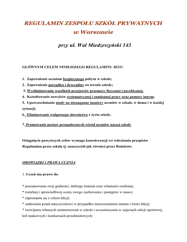 REGULAMIN ZESPOŁU SZKÓŁ PRYWATNYCH w Warszawie przy ul. Wał Miedzeszyński 143 GŁÓWNYM CELEM NINIEJSZEGO REGULAMINU JEST: 1. Zapewnienie uczniom bezpiecznego pobytu w szkole; 2. Zapewnienie porządku i dyscypliny na terenie szkoły; 3. Wyeliminowanie wszelkich przejawów przemocy fizycznej i psychicznej; 4. Kształtowanie nawyków systematycznej i sumiennej pracy oraz pomocy innym; 5. Upowszechnianie mody na nienaganne maniery uczniów w szkole, w domu i w każdej sytuacji; 6. Eliminowanie wulgarnego słownictwa z życia szkoły. 7. Promowanie postaw prospołecznych wśród uczniów naszej szkoły Osiągnięcie powyższych celów wymaga konsekwencji we wdrażaniu przepisów Regulaminu przez szkołę tj. nauczycieli jak również przez Rodziców. OBOWIĄZKI I PRAWA UCZNIA 1. Uczeń ma prawo do: * poszanowania swej godności, dobrego imienia oraz własności osobistej; * rzetelnej i sprawiedliwej oceny swego zachowania i postępów w nauce; * zapoznania się z celem lekcji; * zadawania pytań nauczycielowi w przypadku niezrozumienia tematu i treści lekcji; * rozwijania własnych zainteresowań w szkole i uczestniczenia w zajęciach sekcji sportowej, kół naukowych i konkursach przedmiotowych; * uzyskania informacji o kryteriach i zasadach oceniania stosowanych przez nauczycieli; * sprawiedliwości i jawności przy ocenianiu; * poprawienia oceny; * informacji o sprawdzianie przynajmniej z tygodniowym wyprzedzeniem; * wyłaniania w demokratycznych wyborach swojej reprezentacji w postaci Samorządu Uczniowskiego i samorządów klasowych; * wybierania spośród grona pedagogicznego opiekuna Samorządu; * okresowych badań lekarskich i szczepień ochronnych zgodnie z przepisami i wymogami szkolnej służby zdrowia; * równomiernego obciążenia zajęciami w poszczególne dni tygodnia; *podejmowania inicjatywy na rzecz klasy, szkoły i całego społeczeństwa. 2. Uczeń ma obowiązek: * starannie przygotowywać się do lekcji; * aktywnie uczestniczyć w lekcjach; * odrabiać zadane prace domowe; * dbać o mienie szkoły i estetykę sal lekcyjnych; * posiadać dzienniczek do dyspozycji nauczyciela i rodziców; * stosować formy grzecznościowe na terenie szkoły i poza nią, * odnosić się z szacunkiem do nauczycieli i innych pracowników szkoły, koleżanek i kolegów; * wspierać osoby słabsze fizycznie lub delikatniejsze psychicznie; * być skromnym zarówno w zachowaniu jak i wyglądzie; Skromny i schludny wygląd w rozumieniu tego regulaminu to: - strój, który nie kojarzy się z żadną subkulturą młodzieżową i jest odpowiedni do sytuacji zakryty brzuch, dekolt, spodnie i spódnice o nie budzącej kontrowersji długości - biżuteria - kolczyki jedynie w uszach, niewielkich rozmiarów, które nie stwarzają zagrożenia na zajęciach ruchowych, w-fie, - niedopuszczalne są ekstrawaganckie fryzury, farbowane włosy, kolorowe paznokcie i makijaż; * uprawiać sport i uczestniczyć w zabawach wyłącznie w miejscach do tego przeznaczonych (boiska szkolne, szkolny plac zabaw, sala gimnastyczna). 3. Uczniowi nie wolno: * stosować przemocy fizycznej i psychicznej; być sprawcą cyberprzemocy, czy też umyślnie zagrażać zdrowiu i życiu członków społeczności szkolnej; * działać na szkodę innych osób (niszczyć cudzą własność, kraść, kłamać); * spóźniać się na lekcje; * przeszkadzać innym uczniom podczas lekcji; * używać wulgarnego słownictwa; * wychodzić z sali podczas lekcji z wyjątkiem uzasadnionych przypadków, za zgodą nauczyciela; * wychodzić ze szkoły bez rodziców, bądź też bez zgody rodziców i wiedzy wychowawcy przebywać na terenie parkingów i poza terenem szkoły; * niszczyć mienia szkolnego; * zaśmiecać klasy i pozostałych pomieszczeń szkolnych; * przynosić do szkoły: - wszelkich przedmiotów mogących stanowić zagrożenie dla zdrowia i życia - większych sum pieniędzy, drogocennych przedmiotów ; * wprowadzać na teren szkoły osób postronnych bez zezwolenia dyrekcji; * palić papierosów, pić alkoholu, zażywać narkotyków i innych środków odurzających oraz rozprowadzać ich wśród uczniów; ŚRODKI WYCHOWAWCZE Środki wychowawcze stosowane przez szkołę maja na celu: 1. promowanie postaw prospołecznych poprzez: o stosowanie na bieżąco punktowego systemu oceny z zachowania. o pochwałę ustną w kontakcie indywidualnym z dzieckiem, o pochwałę przed klasą, o pochwałę na forum szkoły, o pochwałę pisemną w formie: dyplomu uznania, wpisu do dokumentacji szkolnej, listu pochwalnego do rodziców. 2. korygowanie postaw uczniów poprzez: o stosowanie na bieżąco punktowego systemu oceny z zachowania. o rozmowę indywidualną ( z wychowawca klasy, psychologiem, dyrekcją szkoły), o rozmowę przy współudziale rodziców, o zlecenie podjęcia działań na rzecz klasy/szkoły w celu naprawienia lub zrekompensowania wyrządzonych szkód. W przypadku braku współpracy z uczniem lub/i jego rodzicami, uczeń może ponieść następujące konsekwencje nieakceptowanego w szkole postępowania: a) upomnienia ustnego udzielonego przez nauczyciela; b) upomnienia pisemnego udzielonego przez nauczyciela; c) podpisanie przez ucznia i jego Rodziców kontraktu warunkującego pozostanie dziecka w szkole, d) wykonania pracy na rzecz Szkoły, e) napisania pracy literackiej lub innej określonej przez nauczyciela; f) nagany udzielonej przez Dyrektora; g) zawieszenia w prawach reprezentowania klasy, szkoły w konkursach lub zawodach oraz udziału w organizowanych przez szkołę imprezach, na czas ustalony przez Dyrektora; h) skreślenia z listy uczniów. SYSTEM KAR I NAGRÓD: * Głównym celem wymierzenia określonej kary jest wykształcenie nawyku przestrzegania przepisów niniejszego Regulaminu. Tak więc dolegliwość w postaci zastosowania kary ma głównie charakter wychowawczy. Stąd też rodzaj kary zależy od rodzaju i stopnia przewinienia. Decyzję o stopniu i rodzaju kary podejmuje nauczyciel w uzgodnieniu z wychowawcą a