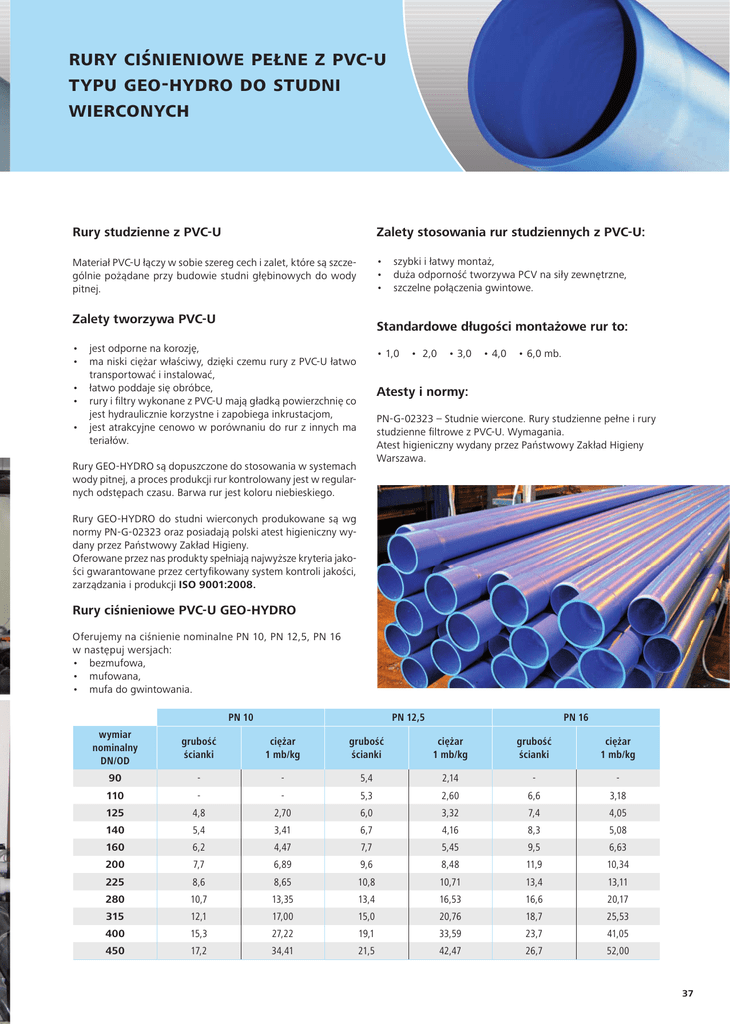 rury ciśnieniowe pełne z pvc-u typu geo-hydro do studni wierconych rury studzienne z pVc-U Zalety stosowania rur studziennych z pVc-U: Materiał PVC-U łączy w sobie szereg cech i zalet, które są szczególnie pożądane przy budowie studni głębinowych do wody pitnej. • szybki i łatwy montaż, • dużaodpornośćtworzywaPCVnasiłyzewnętrzne, • szczelnepołączeniagwintowe. Zalety tworzywa pVc-U standardowe długości montażowe rur to: • jest odporne na korozję, • maniskiciężarwłaściwy,dziękiczemururyzPVC-Ułatwo transportować i instalować, • łatwopoddajesięobróbce, • ruryifiltrywykonanezPVC-Umajągładkąpowierzchnięco jest hydraulicznie korzystne i zapobiega inkrustacjom, • jestatrakcyjnecenowowporównaniudorurzinnychma teriałów. •1,0•2,0•3,0•4,0•6,0mb. Atesty i normy: PN-G-02323 – Studnie wiercone. Rury studzienne pełne i rury studzienne filtrowe z PVC-U. Wymagania. Atest higieniczny wydany przez Państwowy Zakład Higieny Warszawa. Rury GEO-HYDRO są dopuszczone do stosowania w systemach wody pitnej, a proces produkcji rur kontrolowany jest w regularnych odstępach czasu. Barwa rur jest koloru niebieskiego. Rury GEO-HYDRO do studni wierconych produkowane są wg normy PN-G-02323 oraz posiadają polski atest higieniczny wydany przez Państwowy Zakład Higieny. Oferowane przez nas produkty spełniają najwyższe kryteria jakości gwarantowane przez certyfikowany system kontroli jakości, zarządzania i produkcji isO 9001:2008. rury ciśnieniowe pVc-U GeO-HYDrO Oferujemy na ciśnienie nominalne PN 10, PN 12,5, PN 16 w następuj wersjach: • bezmufowa, • mufowana, • mufadogwintowania. PN 10 PN 12,5 wymiar nominalny DN/OD grubość ścianki ciężar 1 mb/kg grubość ścianki PN 16 ciężar 1 mb/kg grubość ścianki ciężar 1 mb/kg 90 - - 5,4 2,14 - - 110 - - 5,3 2,60 6,6 3,18 125 4,8 2,70 6,0 3,32 7,4 4,05 140 5,4 3,41 6,7 4,16 8,3 5,08 160 6,2 4,47 7,7 5,45 9,5 6,63 200 7,7 6,89 9,6 8,48 11,9 10,34 225 8,6 8,65 10,8 10,71 13,4 13,11 280 10,7 13,35 13,4 16,53 16,6 20,17 315 12,1 17,00 15,0 20,76 18,7 25,53 400 15,3 27,22 19,1 33,59 23,7 41,05 450 17,2 34,41 21,5 42,47 26,7 52,00 37