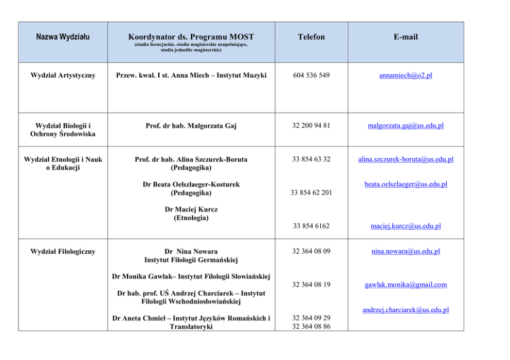 Nazwa Wydziału Koordynator ds. Programu MOST Telefon E-mail