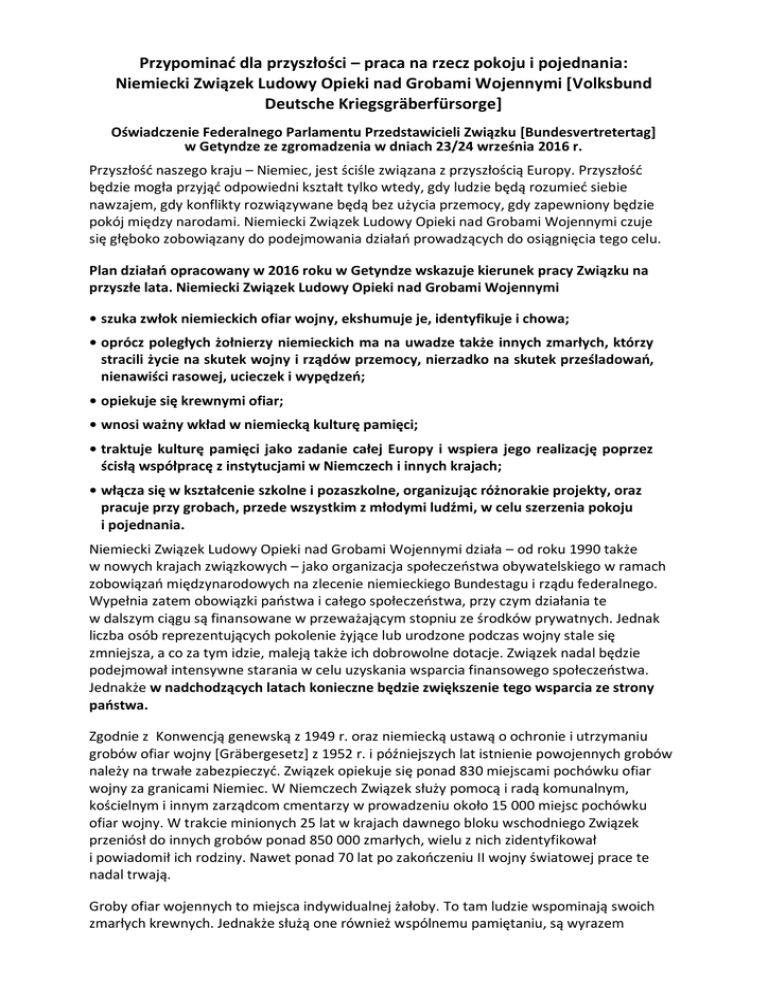 Przypominać dla przyszłości – praca na rzecz pokoju i pojednania: Niemiecki Związek Ludowy Opieki nad Grobami Wojennymi [Volksbund Deutsche Kriegsgräberfürsorge] Oświadczenie Federalnego Parlamentu Przedstawicieli Związku [Bundesvertretertag] w Getyndze ze zgromadzenia w dniach 23/24 września 2016 r. Przyszłość naszego kraju – Niemiec, jest ściśle związana z przyszłością Europy. Przyszłość będzie mogła przyjąć odpowiedni kształt tylko wtedy, gdy ludzie będą rozumieć siebie nawzajem, gdy konflikty rozwiązywane będą bez użycia przemocy, gdy zapewniony będzie pokój między narodami. Niemiecki Związek Ludowy Opieki nad Grobami Wojennymi czuje się głęboko zobowiązany do podejmowania działań prowadzących do osiągnięcia tego celu. Plan działań opracowany w 2016 roku w Getyndze wskazuje kierunek pracy Związku na przyszłe lata. Niemiecki Związek Ludowy Opieki nad Grobami Wojennymi • szuka zwłok niemieckich ofiar wojny, ekshumuje je, identyfikuje i chowa; • oprócz poległych żołnierzy niemieckich ma na uwadze także innych zmarłych, którzy stracili życie na skutek wojny i rządów przemocy, nierzadko na skutek prześladowań, nienawiści rasowej, ucieczek i wypędzeń; • opiekuje się krewnymi ofiar; • wnosi ważny wkład w niemiecką kulturę pamięci; • traktuje kulturę pamięci jako zadanie całej Europy i wspiera jego realizację poprzez ścisłą współpracę z instytucjami w Niemczech i innych krajach; • włącza się w kształcenie szkolne i pozaszkolne, organizując różnorakie projekty, oraz pracuje przy grobach, przede wszystkim z młodymi ludźmi, w celu szerzenia pokoju i pojednania. Niemiecki Związek Ludowy Opieki nad Grobami Wojennymi działa – od roku 1990 także w nowych krajach związkowych – jako organizacja społeczeństwa obywatelskiego w ramach zobowiązań międzynarodowych na zlecenie niemieckiego Bundestagu i rządu federalnego. Wypełnia zatem obowiązki państwa i całego społeczeństwa, przy czym działania te w dalszym ciągu są finansowane w przeważającym stopniu ze środków prywatnych. Jednak liczba osób reprezentujących pokolenie żyjące lub urodzone podczas wojny stale się zmniejsza, a co za tym idzie, maleją także ich dobrowolne dotacje. Związek nadal będzie podejmował intensywne starania w celu uzyskania wsparcia finansowego społeczeństwa. Jednakże w nadchodzących latach konieczne będzie zwiększenie tego wsparcia ze strony państwa. Zgodnie z Konwencją genewską z 1949 r. oraz niemiecką ustawą o ochronie i utrzymaniu grobów ofiar wojny [Gräbergesetz] z 1952 r. i późniejszych lat istnienie powojennych grobów należy na trwałe zabezpieczyć. Związek opiekuje się ponad 830 miejscami pochówku ofiar wojny za granicami Niemiec. W Niemczech Związek służy pomocą i radą komunalnym, kościelnym i innym zarządcom cmentarzy w prowadzeniu około 15 000 miejsc pochówku ofiar wojny. W trakcie minionych 25 lat w krajach dawnego bloku wschodniego Związek przeniósł do innych grobów ponad 850 000 zmarłych, wielu z nich zidentyfikował i powiadomił ich rodziny. Nawet ponad 70 lat po zakończeniu II wojny światowej prace te nadal trwają. Groby ofiar wojennych to miejsca indywidualnej żałoby. To tam ludzie wspominają swoich zmarłych krewnych. Jednakże służą one również wspólnemu pamiętaniu, są wyrazem 2 niemieckiej kultury pamięci. Ze względu na charakter II wojny światowej nigdy nie mogą być miejscem nacjonalistycznej czci bohaterów. Działania związane z grobami żołnierzy stanowią uzupełnienie pracy wielu innych organizacji i instytucji nad miejscami pamięci i pochówku ofiar, przy czym działania Związku obejmują całościową pamięć o zmarłych. Wynika to z faktu, że żołnierze mogli być ofiarami, sprawcami lub obiema stronami jednocześnie. Ze względu na I wojnę światową, za którą my, Niemcy, jesteśmy współodpowiedzialni, oraz na agresję a na wschodzie wojnę ludobójczą podczas II wojny światowej, za które winę ponoszą narodowosocjalistyczne Niemcy, miejsca pochówku oraz miejsca upamiętniające ofiary wojny są dla nas miejscami szczególnego zobowiązania do politycznej pamięci, czci i uświadamiania. Związek, zgodnie ze stanowiskiem niemieckiego Bundestagu, opowiada się przeciwko uogólnieniom przy obarczaniu winą. W swoich prezentacjach i działaniach edukacyjnych koncentruje się na badaniach historycznych i przyczynia się tym samym do poznania winy i odpowiedzialności wynikającej z uwarunkowań historycznych i politycznych. Działalność Związku nie jest skoncentrowana na przeszłości, lecz na umożliwianiu i wspieraniu nauczania dla przyszłości. Związek ściśle współpracuje z innymi instytucjami w Niemczech i za granicą, nie tylko w obszarze edukacji. Dlatego też w minionych latach, oprócz działań ukierunkowanych na powojenne groby, ofiary i ich bliskich, coraz większe znaczenie dla tożsamości i działalności Związku zyskuje praca związana z nauczaniem w szkole i poza szkołą oraz nauczaniem dorosłych. Ten obszar działalności jest w dalszym ciągu rozwijany. Od ponad 20 lat Związek wnosi swój czynny udział do dyskursu publicznego poprzez tematyczne publikacje, konferencje mające na celu szerzenie polityki pamięci, publiczne dyskusje, nowe formy Niemieckiego Dnia Żałoby Narodowej organizowanego wspólnie z młodzieżą, konferencje i fundacje, wspólnoty, związki edukacyjne, uniwersytety i inne organizacje. Związek prowadzi cztery ośrodki kształcenia i spotkań młodzieży – z czego jeden mieści się w Niemczech, a trzy w innych krajach europejskich. Związek ma na celu ciągłe rozwijanie tej aktywności, prowadzącej do zaznajomienia młodzieży z okrucieństwami wojny oraz koniecznością pokoju i wzajemnego zrozumienia. Aby sprostać tym zadaniom w sposób zaangażowany i kompetentny, Związek od lat poddaje się reformom i także w przyszłości będzi