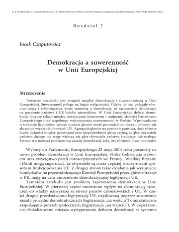 K.A. Wojtaszczyk, M. Mizerska-Wrotkowska, W. Jakubowski (red.), Polska w procesie integracji europejskiej: dekada doświadczeń (2004–2014), Warszawa 2014. Rozdział 7 Jacek Czaputowicz Demokracja a suwerenność w Unii Europejskiej Streszczenie Tematem rozdziału jest związek między demokracją i suwerennością w Unii Europejskiej. Suwerenność polega na logice wyłączności. Gdyby na niej polegały również więzy i zobowiązania, które stanowią o demokracji, to zachowanie demokracji na poziomie państwa i UE byłoby niemożliwe. W Unii Europejskiej deficyt demokracji dotyczy relacji między instytucjami krajowymi i unijnymi, słabości Parlamentu Europejskiego oraz wspólnego wykonywania suwerenności w Radzie. Wprowadzony w traktacie lizbońskim system liczenia głosów może prowadzić do decyzji, których nie akceptuje większość obywateli UE. Agregacja głosów na poziomie państwa, duże różnice liczby ludności między państwami oraz niepodzielność głosu czynią, że głos obywatela państwa dużego ma wagę większą niż głos obywatela państwa średniego lub małego. System ten narusza podstawową zasadę demokracji, jaką jest równość praw obywateli. Wybory do Parlamentu Europejskiego 25 maja 2014 roku postawiły na nowo problem demokracji w Unii Europejskiej. Niska frekwencja wyborcza oraz zwycięstwo partii eurosceptycznych we Francji, Wielkiej Brytanii i Danii mogą sugerować, że obywatele są coraz częściej rozczarowani sposobem funkcjonowania UE. Z drugiej strony takie działania jak wysunięcie kandydatów na przewodniczącego Komisji Europejskiej przez główne frakcje w PE, mają na celu umocnienie demokratycznej legitymacji UE. Tematem artykułu jest problem zapewnienia demokracji w Unii Europejskiej. W pierwszej części omówiono wpływ na demokrację roszczeń do władzy najwyższej ze strony państw członkowskich i UE. W części drugiej przedstawiono legitymację UE, uzyskiwaną poprzez stosowanie zasad i procedur demokratycznych (legitymacja „na wejściu”) oraz skuteczne zaspokajanie potrzeb społecznych (legitymacja „na wyjściu”). W części trzeciej zlokalizowano miejsca występowania deficytu demokracji w systemie 148 Jacek Czaputowicz unijnym, w relacjach między instytucjami (unijnymi i państw członkowskich), w Parlamencie Europejskim i w Radzie Unii Europejskiej. 1. Demokracja a nadwyżka suwerenności w Unii Europejskiej Demokracja to rządy ludu, sprawowane albo bezpośrednio, albo poprzez wybranych przedstawicieli. Zdaniem Roberta Dahla demokrację cechuje rzeczywiste uczestnictwo (wszyscy mają możliwość przedstawienia poglądu), równe prawa, niezbędne w procesie rządzenia (wszystkie głosy są traktowane tak samo), oświecone rozumienie (wszyscy mają możliwość poinformowania się o istniejących opcjach i konsekwencjach decyzji), nadzór nad zadaniami oraz włączenie wszystkich dorosłych1. Warunki demokracji to wolność organizowania się, polityczna konkurencja między programami i partiami politycznymi, wybór władzy ustawodawczej i wykonawczej na drodze powszechnych wyborów oraz istnienie wspólnoty politycznej (demos), która wyraża zgodę na podejmowanie wiążących decyzji w jej imieniu. Współcześnie parlament jest głównym depozytariuszem legitymacji demokratycznej, określa cele dla administracji i sprawuje nad nią kontrolę. Abraham Lincoln określił demokrację jako rządy ludu, przez lud i dla ludu. W Unii Europejskiej nie ma jednego ludu, który miałby wspólną tożsamość, nie ma też demokratycznych instytucji, poprzez które lud mógłby sprawować rządy, są natomiast sprawowane rządy dla ludu, ponieważ UE prowadzi politykę korzystną dla wszystkich2. Deficyt demokracji to sytuacja, w której obywatele nie mają wpływu na podejmowane decyzje. Jest on dzisiaj wynikiem uniezależnienia tworzenia polityk UE od instytucji i procesów demokratycznych w państwach członkowskich, a zarazem braku takich instytucji i procesów na poziomie europejskim3. Jean Monnet twierdził, że integracja europejska jest zadaniem dla 1 R. Dahl, O demokracji, Znak, Kraków 2000, s. 39-40, 60. R. Bellamy, The Inevitability of a Democratic Deficit, [w:] H. Zimmermann, A. Dür (red.), Key Controversies in European Integration, Palgrave Macmillan, London-New York 2012, s. 64. 3 Y. Papadopoulos, Accountability and Multi-Level Governance, „West European Politics” 2010, XXXIII (5), s. 1030-1049. Według definicji zamieszczonej na portalu Unii Europejskiej „Deficyt demokratyczny jest konceptem przywoływanym zasadniczo w argumencie, że Unię Europejską i jej różne ciała charakteryzuje brak demokracji i wydają się one niedostępne dla zwykłych obywateli z powodu skomplikowanej metody działania”; http://europa.eu/legislation_summaries/glossary/democratic_deficit_en.htm (dostęp 24.06.2014). 2 Demokracja a suwerenność w Unii Europejskiej 149 elit, a społeczeństwa nie powinny być w tej kwestii konsultowane, ponieważ nie mają doświadczenia4. Do czasu wystąpienia trudności z ratyfikacją traktatu z Maastricht (przyjętego w roku 1992), legitymacja Unii Europejskiej nie była kwestionowana. Postrzeganie deficytu demokracji zależy od tego, czy za aktorów uznamy państwa członkowskie czy obywateli Unii Europejskiej. W pierwszym przypadku legitymację zapewnia demokracja pośrednia, uzyskana za pomocą instytucji i procesów demokratycznych w państwach członkowskich. Jest ona jednak podważona przez większościowy system podejmowania decyzji, ponieważ państwo może zostać przegłosowane, jego zaś obywatele mogą danej decyzji nie uznać za prawomocną. Można wszelako dowodzić, że zawierając traktaty państwa przystały na taką ewentualność. W przypadku natomiast uznania, że podmiotami UE są jej obywatele, deficyt demokracji jest bardziej oczywisty: legitymacji UE może wówczas dostarczyć jedynie demokracja przedstawicielska5. Cześć badaczy twierdzi, że nie 