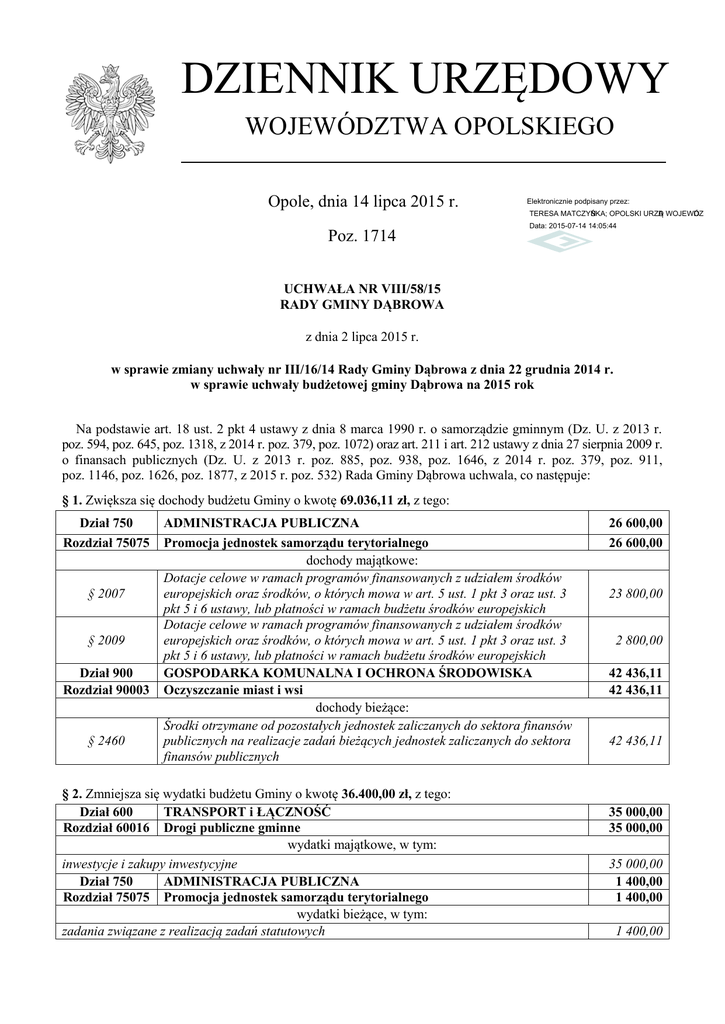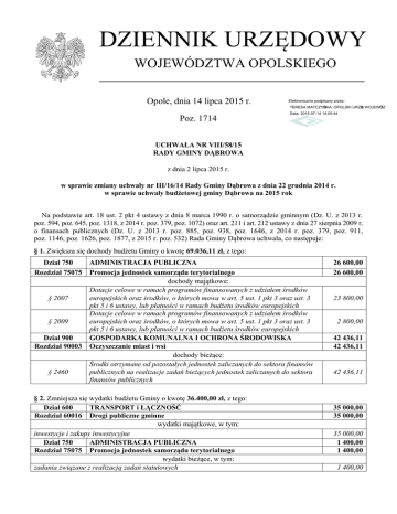 DZIENNIK URZĘDOWY WOJEWÓDZTWA OPOLSKIEGO Opole, dnia 14 lipca 2015 r. Elektronicznie podpisany przez: TERESA MATCZYŃSKA; OPOLSKI URZĄD WOJEWÓDZKI Poz. 1714 Data: 2015-07-14 14:05:44 UCHWAŁA NR VIII/58/15 RADY GMINY DĄBROWA z dnia 2 lipca 2015 r. w sprawie zmiany uchwały nr III/16/14 Rady Gminy Dąbrowa z dnia 22 grudnia 2014 r. w sprawie uchwały budżetowej gminy Dąbrowa na 2015 rok Na podstawie art. 18 ust. 2 pkt 4 ustawy z dnia 8 marca 1990 r. o samorządzie gminnym (Dz. U. z 2013 r. poz. 594, poz. 645, poz. 1318, z 2014 r. poz. 379, poz. 1072) oraz art. 211 i art. 212 ustawy z dnia 27 sierpnia 2009 r. o finansach publicznych (Dz. U. z 2013 r. poz. 885, poz. 938, poz. 1646, z 2014 r. poz. 379, poz. 911, poz. 1146, poz. 1626, poz. 1877, z 2015 r. poz. 532) Rada Gminy Dąbrowa uchwala, co następuje: § 1. Zwiększa się dochody budżetu Gminy o kwotę 69.036,11 zł, z tego: Dział 750 Rozdział 75075 § 2007 § 2009 Dział 900 Rozdział 90003 § 2460 ADMINISTRACJA PUBLICZNA Promocja jednostek samorządu terytorialnego dochody majątkowe: Dotacje celowe w ramach programów finansowanych z udziałem środków europejskich oraz środków, o których mowa w art. 5 ust. 1 pkt 3 oraz ust. 3 pkt 5 i 6 ustawy, lub płatności w ramach budżetu środków europejskich Dotacje celowe w ramach programów finansowanych z udziałem środków europejskich oraz środków, o których mowa w art. 5 ust. 1 pkt 3 oraz ust. 3 pkt 5 i 6 ustawy, lub płatności w ramach budżetu środków europejskich GOSPODARKA KOMUNALNA I OCHRONA ŚRODOWISKA Oczyszczanie miast i wsi dochody bieżące: Środki otrzymane od pozostałych jednostek zaliczanych do sektora finansów publicznych na realizacje zadań bieżących jednostek zaliczanych do sektora finansów publicznych § 2. Zmniejsza się wydatki budżetu Gminy o kwotę 36.400,00 zł, z tego: Dział 600 TRANSPORT i ŁĄCZNOŚĆ Rozdział 60016 Drogi publiczne gminne wydatki majątkowe, w tym: inwestycje i zakupy inwestycyjne Dział 750 ADMINISTRACJA PUBLICZNA Rozdział 75075 Promocja jednostek samorządu terytorialnego wydatki bieżące, w tym: zadania związane z realizacją zadań statutowych 26 600,00 26 600,00 23 800,00 2 800,00 42 436,11 42 436,11 42 436,11 35 000,00 35 000,00 35 000,00 1 400,00 1 400,00 1 400,00 Dziennik Urzędowy Województwa Opolskiego –2– Poz. 1714 § 3. Zwiększa się wydatki budżetu Gminy o kwotę 105.436,11 zł, z tego: Dział 600 TRANSPORT i ŁĄCZNOŚĆ Rozdział 60016 Drogi publiczne gminne wydatki bieżące, w tym: zadania związane z realizacją zadań statutowych Dział 710 DZIAŁALNOŚĆ USŁUGOWA Rozdział 71095 Pozostała działalność wydatki bieżące, w tym: zadania związane z realizacją zadań statutowych Dział 750 ADMINISTRACJA PUBLICZNA Rozdział 75023 Urzędy gmin wydatki majątkowe, w tym: inwestycje i zakupy inwestycyjne Rozdział 75075 Promocja jednostek samorządu terytorialnego wydatki bieżące, w tym: 9 000,00 9 000,00 9 000,00 13 500,00 13 500,00 13 500,00 32 500,00 4 500,00 4 500,00 28 000,00 wydatki na realizację zadań finansowanych z udziałem środków, o których mowa w art. 5 ust. 1 pkt 2 i 3, w części związanej z realizacją zadań jst 28 000,00 Dział 754 Rozdział 75412 BEZPIECZEŃSTWO PUBLICZNE I OCHRONA PRZECIWPOŻAROWA Ochotnicze straże pożarne wydatki majątkowe, w tym: inwestycje i zakupy inwestycyjne Dział 900 GOSPODARKA KOMUNALNA I OCHRONA ŚRODOWISKA Rozdział 90003 Oczyszczanie miast i wsi wydatki bieżące, w tym: zadania związane z realizacją zadań statutowych Rozdział 90004 Utrzymanie zieleni w miastach i gminach wydatki bieżące, w tym: zadania związane z realizacją zadań statutowych 3 000,00 3 000,00 3 000,00 47 436,11 42 436,11 42 436,11 5 000,00 5 000,00 § 4. Załącznik nr 6 do uchwały nr III/16/14 Rady Gminy Dąbrowa z dnia 22 grudnia 2014 r. otrzymuje brzmienie zgodnie z załącznikiem nr 1. § 5. Po wprowadzeniu zmian budżet gminy wynosi: Dochody 27 759 317,70 Przychody 1 328 524,02 RAZEM 29 087 841,72 Wydatki 25 600 905,45 Rozchody 3 486 936,27 RAZEM 29 087 841,72 § 6. Wykonanie uchwały powierza się Wójtowi Gminy Dąbrowa. § 7. Uchwała podlega ogłoszeniu w Dzienniku Urzędowym Województwa Opolskiego oraz w BIP Gminy Dąbrowa. § 8. Uchwała wchodzi w życie z dniem podjęcia. Przewodniczący Rady Gminy Piotr Wieczorek Dziennik Urzędowy Województwa Opolskiego –3– Poz. 1714 Załącznik do uchwały nr VIII/58/15 Rady Gminy Dąbrowa z dnia 2 lipca 2015 r. Plan wydatków majątkowych na 2015 r. Dział Rozdział Nazwa zadania 1 010 2 3 ROLNICTWO i ŁOWIECTWO Infrastruktura wodociągowa i sanitacyjna wsi Uzbrojenie terenów budowlanych Budowa kanalizacji sanitarnej w Żelaznej wraz z siecią tranzytową do przepompowni ścieków przy ul. Ceglanej w Sławicach TRANSPORT i ŁĄCZNOŚĆ Lokalny transport zbiorowy Wiata przystankowa w miejscowości Wrzoski Drogi publiczne powiatowe Opracowanie projektu przebudowy drogi powiatowej w m. Karczów ul. Dąbrowska na odcinku od DK do końca zabudowy (działki nr 578) Drogi publiczne gminne Przebudowa części ul. Szkolnej w Karczowie Drogi wewnętrzne Modernizacja (remont) ulic: Lipowej i Nowej w Dąbrowie - II etap GOSPODARKA MIESZKANIOWA Gospodarka gruntami i nieruchomościami Zakup nieruchomości gruntowych DZIAŁALNOŚĆ USŁUGOWA Pozostała działalność 01010 600 60004 60014 60016 60017 700 70005 710 71095 Zintegrowany rozwój Aglomeracji Opolskiej 750 75023 754 75412 801 80104 900 90004 90015 ADMINISTRACJA PUBLICZNA Urzędy gmin Zakup serwera wraz z systemem operacyjnym Zakup klimatyzatora do serwerowni BEZPIECZEŃSTWO PUBLICZNE I OCHRONA PRZECIWPOŻAROWA Ochotnicze straże pożarne Rozbudowa strażnicy OSP Żelazna Zakup wozu bojowego dla OSP Wrzoski Plan w zł 4 716 815,00 716 815,00 100 000,00 Gmina Dąbrowa 616 815,00 Gmina Dąbrowa + PROW 403 500,00 5 000,00 5 000,00 13 500,00 Gmina Dąbrowa 13 500,00 Gmina Dąbrowa 135 000,00 135 000,00 250 000,00 250 000,00 10 000,00 10 000,00 10 000,00