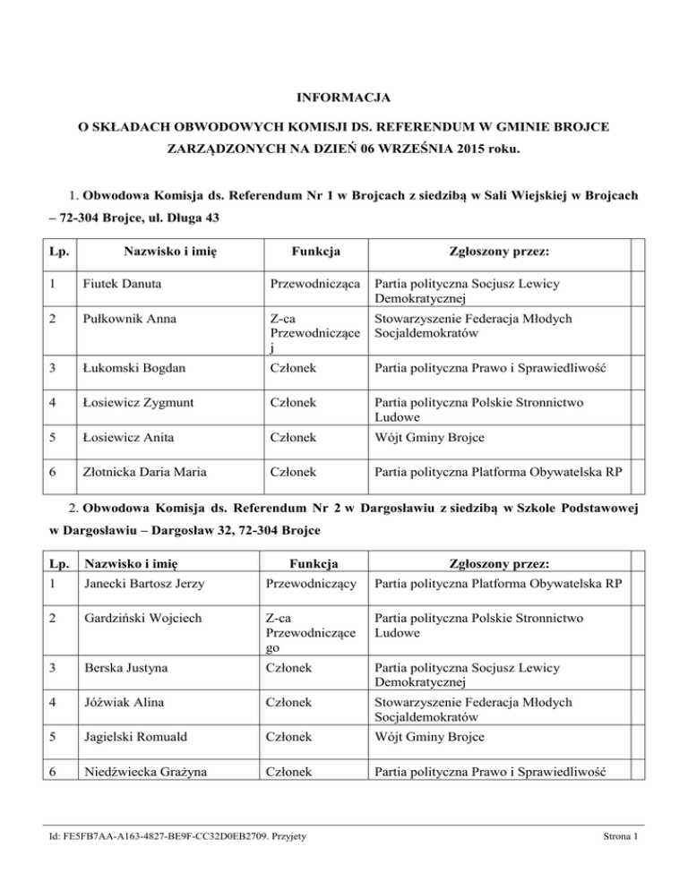 INFORMACJA O SKŁADACH OBWODOWYCH KOMISJI DS. REFERENDUM W GMINIE BROJCE ZARZĄDZONYCH NA DZIEŃ 06 WRZEŚNIA 2015 roku. 1. Obwodowa Komisja ds. Referendum Nr 1 w Brojcach z siedzibą w Sali Wiejskiej w Brojcach – 72-304 Brojce, ul. Długa 43 Lp. Nazwisko i imię Funkcja Zgłoszony przez: 1 Fiutek Danuta Przewodnicząca Partia polityczna Socjusz Lewicy Demokratycznej 2 Pułkownik Anna Z-ca Przewodniczące j Stowarzyszenie Federacja Młodych Socjaldemokratów 3 Łukomski Bogdan Członek Partia polityczna Prawo i Sprawiedliwość 4 Łosiewicz Zygmunt Członek Partia polityczna Polskie Stronnictwo Ludowe 5 Łosiewicz Anita Członek Wójt Gminy Brojce 6 Złotnicka Daria Maria Członek Partia polityczna Platforma Obywatelska RP 2. Obwodowa Komisja ds. Referendum Nr 2 w Dargosławiu z siedzibą w Szkole Podstawowej w Dargosławiu – Dargosław 32, 72-304 Brojce Lp. Nazwisko i imię Funkcja Zgłoszony przez: 1 Janecki Bartosz Jerzy Przewodniczący Partia polityczna Platforma Obywatelska RP 2 Gardziński Wojciech Z-ca Przewodniczące go Partia polityczna Polskie Stronnictwo Ludowe 3 Berska Justyna Członek Partia polityczna Socjusz Lewicy Demokratycznej 4 Jóźwiak Alina Członek Stowarzyszenie Federacja Młodych Socjaldemokratów 5 Jagielski Romuald Członek Wójt Gminy Brojce 6 Niedźwiecka Grażyna Członek Partia polityczna Prawo i Sprawiedliwość Id: FE5FB7AA-A163-4827-BE9F-CC32D0EB2709. Przyjety Strona 1 3. Obwodowa Komisja ds. Referendum Nr 3 w Przybiernowie z siedzibą w Świetlicy Wiejskiej w Przybiernowie – Przybiernowo ul. Wiejska 6a, 72-304 Brojce Lp. Nazwisko i imię Funkcja Zgłoszony przez: 1 Jakutajć Marek Przewodniczący 2 Ruszkiewicz Iwona Z-ca Wójt Gminy Brojce Przewodnicząceg o 3 Zinowik Teresa Członek Partia polityczna Socjusz Lewicy Demokratycznej 4 Ziółkowska Marta Członek Partia polityczna Polskie Stronnictwo Ludowe 5 Berski Wiesław Członek Stowarzyszenie Federacja Młodych Socjaldemokratów 6 Łukomska Karolina Członek Partia polityczna Prawo i Sprawiedliwość Partia polityczna Platforma Obywatelska RP W dniu referendum ogólnokrajowym zarządzonym na dzień 06 września 2015 roku lokale Obwodowych Komisji ds. Referendum czynne będą w godzinach od 600 do 2200. Natomiast komisje pracę rozpoczynają o godz. 500. Id: FE5FB7AA-A163-4827-BE9F-CC32D0EB2709. Przyjety Strona 2