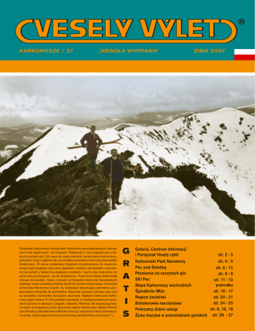 KARKONOSZE / 27 „WESOŁA WYPRAWA” Dzisiejsze Karkonosze oferują setki kilometrów uporządkowanych narciarskich tras zjazdowych i do biegania. Większość z nich znajduje się w niższych partiach gór. Od czasu do czasu jednakże opuszczamy dobrze przygotowane trasy i udajemy się na porządną wyprawę przez szczytowe partie Karkonoszy. W domu zostawiamy biegówki przystosowane do nowoczesnego stylu biegania oraz narty zjazdowe z butami narciarskimi i wyruszamy na nartach z klasycznie zagiętymi czubkami. I jest to bez znaczenia czy są to narty do biegania, czy do skialpinizmu. Przez Kozí hřbety żadna trasa zimowa nie wiedzie. Ojciec z synem na fotografii z końca lat dwudziestych zeszłego wieku prawdopodobnie doszli do punktu widokowego nieopodal schroniska Rennerova bouda, by podziwiać fascynującą panoramę gór i sporządzić fotografię do pamiętnika. Wówczas używano jednego typu nart na wszystkie narciarskie dyscypliny sportowe. Najlepsi mistrzowie karkonoscy (patrz strony 23-24) potrafili zwyciężać w międzynarodowych zawodach zarówno w skokach, biegach i slalomie. Również dla waszej wyprawy na trasie prowadzącej przez szczytowe partie Karkonoszy między Pecem pod Śnieżką a Špindlerowym Mlýnem tworzyć będą Kozí hřbety dramatyczne kulisy. (Opis wspomnianej powyżej trasy zamieściliśmy na stronie 7.) G R A T I S ZIMA 2007 Galeria, Centrum Informacji i Pensjonat Veselý výlet str. 2 - 3 str. 4 - 5 Karkonoski Park Narodowy Pec pod Śnieżką str. 6 - 13 Płomienie na szczytach gór str. 8 - 9 SKI Pec str. 11 - 13 pośrodku Mapa Karkonoszy wschodnich str. 16 - 17 Špindlerův Mlýn str. 20 - 21 Region žacléřski str. 24 - 25 Bohaterowie narciarstwa str. 6, 18, 19 Polecamy dobre usługi Żywa muzyka w schroniskach górskich str. 26 - 27 SPOTKANIE W GALERII 2 Alexander Czernin-Morzin z małżonką i córką podczas spotkania z pracownikami drogowymi Vladimír Aichelburg na Placu Bertholda Ludwig Piette stojący po lewej stronie przyjmuje uratowany portret dziadka Prospera Piette Hans Pohl pokazuje dokumenty i stemple ze Śnieżki Czasopismo sezonowe, centra informacyjne, galerie i pensjonat, które znane są pod wspólną nazwą Veselý výlet są również miejscem spotkań ludzi związanych z Karkonoszami. Dzieki pracy Vesołego výletu mieliśmy okazję poznać dziesiątki nestorów regionu karkonoskiego, których rodziny położyły niemałe zasługi dla rozwoju Karkonoszy. Z archiwum wybraliśmy fotografie z kilku spotkań w roku 2006. Jenny Schon czyta swoją książkę w kościele marszowskim VESELÝ VÝLET Przedstawiciel czeskiego rodu szlacheckiego historyk Vladimír Aichelburg po raz pierwszy przyjechał do nas z Wiednia po opublikowaniu artykułu o zameczku leśnym Aichelburg w Temnym Dole w siódmym numerze czasopisma Veselý výlet w 1995 roku. W latach następnych wspierał jego odbudowę oraz przyczynił się do zrekonstruowania ciekawej historii Aichelburgów nie tylko w Karkonoszach. Po raz ostatni zawitał do Marszowa Górnego po spotkaniu potomków sławnego rodu Przemyślidów. Pokazaliśmy mu wówczas tabliczkę z nazwą placu noszącego imię Bertholda, hrabiego z i na Aichelburgu. Alexander Czernin-Morzin podczas ostatniej wizyty z małżonką Christą i córką Jacquelin udał się do doliny strumienia Honzův potok, by przyjrzeć się z bliska pracownikom naprawiającym tradycyjną technologią chodniki górskie wybudowane przez Czernin-Morzinów przed przeszło stu laty. Doszliśmy do wniosku, że gdyby Czerninom nie zabrali majątku karkonoskiego naziści w roku 1942 a trzy lata później konfiskacja powojenna, byliby jako zarządcy majątku rodowego dobrymi inwestorami. Ludwig Piette przyjechał z małżonką Evą i innymi członkami sławnej rodziny przemyślidów karkonoskich na uroczystość inauguracji trasy spacerowej Via Piette. W galerii Veselý výlet czekał na nich również Max Pauer i współorganizator spotkania Antonín Missberger, by wręczyć mu fotografię jego dziadka Prospera Piette sporządzoną w 1896 roku w atelier Langhans w Pradze. Dobrze zachowany portret z papierni marszowskiej Max Pauer przechowywał przez wiele lat, by teraz jego wręczeniem wyrazić szacunek „Ojcu Karkonoszy“, który poza sukcesami na polu działalności gospodarczej przynoszącymi korzyści całemu regionowi i jego mieszkańcom był współzałożycielem Austriackiego Towarzystwa Karkonoskiego oraz Muzeum Karkonoskiego we Vrchlabi. Hans Pohl przywiózł w kwietniu poza ciekawymi dokumentami o działalności ojca, dziadka i pradziadka na szczycie Śnieżki dwa zabytkowe stemple. Nie na papierze, ale autentyczne, stalowe z wyszlifowanymi przez setki rąk rękojeściami. Tym starszym Friedrich Pohl jeszcze przed 1885 rokiem stemplował obrazek szczytu z kapliczką i schroniskami Pruską i Czeską boudą na kartkach korespondencyjnych, poprzedniczkach widokówek. (viz str. 20) Z dużą dozą nostalgii można było podstemplować współczesne pocztówki obrazkiem, który kiedyś z kartek korespondencyjnych uczynił zabytki pocztowe oceniane obecnie przez kolekcjonerów na setki EUR. Drugi stempel dwujęzyczny Śnieżka – Schneekoppe pochodzi z ostatniej przedwojennej placówki pocztowej w Czeskiej boudzie, którą prowadził Heinrich Pohl aż do września 1938 roku. Pieczęć podstemplowała tysiące pocztówek wysłanych ze Śnieżki. Obecnie, kiedy stempel nam Hans Pohl darował, zastanawiamy się nad jego dalszym wykorzystaniem. Pisarkę, pacyfistkę i rodaczkę z Trutnova Jenny Schon poznaliśmy kiedyś jako krewną rzeźbiarza Emila Schwantnera tworzącego w pierwszej połowie XX wieku w naszym regionie. Jesienią zasiedliśmy w ławach kościoła cmentarnego w Marszowie, gdzie byli chrzczeni i pochowywani ich wspólni przodkowie. W kulisach renesansowego zabytku Jenny czytała z tomu poezji Czeska Polka oraz z prozy Fosa / Rów przydrożny (Příkop), inspirowanej karkonoskimi przeżyciami autorki i Emila Schwantnera
