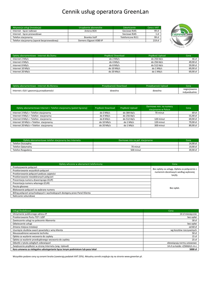 Cennik usług operatora GreenLan Aktywacja usługi (Instalacja) Internet - łącze radiowe Internet - łącze przewodowe Telefon stacjonarny Telefon stacjonarny (aparat bezprzewodowy) Urządzenie abonenckie Antena BOX Bramka VoIP Siemens Gigaset A580 IP Opłaty abonamentowe - Internet dla Domu Internet 2 Mb/s Internet 4 Mb/s Internet 8 Mb/s Internet 10 Mb/s Internet 20 Mb/s Opłaty abonamentowe - Internet dla Biznesu Prędkość Upload do 256 kb/s do 256 kb/s do 512 kb/s do 1 Mb/s do 1 Mb/s Przepływność Download Przepływność Upload dowolna dowolna Prędkość Download Prędkość Upload do 3 Mb/s do 4 Mb/s do 8 Mb/s do 10 Mb/s do 20 Mb/s do 384 kb/s do 256 kb/s do 512 kb/s do 1 Mb/s do 1 Mb/s Internet 3 Mb/s + Telefon stacjonarny Internet 4 Mb/s + Telefon stacjonarny Internet 8 Mb/s + Telefon stacjonarny Internet 10 Mb/s + Telefon stacjonarny Internet 20 Mb/s + Telefon stacjonarny Cena z VAT 99 zł 1 zł 99 zł 219 zł Prędkość Download do 2 Mb/s do 4 Mb/s do 8 Mb/s do 10 Mb/s do 20 Mb/s Internet z SLA i gwarancją przepływności Opłaty abonamentowe Internet + Telefon stacjonarny (pakiet łączony) Zakończenie Sieciowe RJ45 Sieciowe RJ45 Telefoniczne RJ11 - Opłaty abonamentowe telefon stacjonarny bez Internetu Telefon Oszczędny Telefon Optymalny Telefon Rozgadany Cena 46 zł 49,90 zł 59,90 zł 69,90 zł 69,90 zł Cena negocjowana indywidualnie Darmowe min. na numery stacjonarne w Polsce 70 minut 120 minut 120 minut 300 minut Darmowe min na poł. stacjonarne 70 minut 500 minut Opłaty wliczone w abonament telefoniczny Przekazywanie połączeń Przekierowanie wszystkich połączeń Przekierowanie połączeń podczas zajętości Przekierowanie nieodebranych połączeń Prezentacja numeru dzwoniącego (CLIP) Prezentacja numeru własnego (CLIR) Poczta głosowa Blokowanie połączeń na wybrane numery Billing połączeń przychodzących i wychodzących dostępny przez Panel Klienta Naliczanie sekundowe Usługi Dodatkowe Utrzymanie publicznego adresu IP Przekierowanie Portu TCP i UDP Zawieszenie usługi na polecenie Abonenta Odwieszenie usługi Zmiana miejsca instalacji Usunięcie skutków awarii powstałej z winy klienta Nieuzasadnione wezwanie technika Opłata za wysłanie wezwania do zapłaty Opłata za wysłanie przedsądowego wezwania do zapłaty Odsetki z tytułu zaległych zobowiązań Zwiększenie prędkości w stronę Internetu (ang. Upload) Kara umowna za nielegalne udostępnianie łącza innym podmiotom lub poza lokal Wszystkie podane ceny są cenami brutto (zawierają podatek VAT 23%). Aktualny cennik znajduje się na stronie www.greenlan.pl. Cena 69 zł 55,90 zł 69,90 zł 79,90 zł 89,90 zł Cena 14,90 zł 19,90 zł 39,90 zł Cena Bez opłaty za usługę. Opłata za połączenie z numerem docelowym według wybranej taryfy. Bez opłat. Cena 14 zł miesięcznie bez opłat 30 zł bez opłat od 60 zł wg kosztów rzeczywistych 50 zł 15 zł 25 zł obowiązują normy ustawowe 14 zł za każde +256kbit/s m-c 5000 zł Stawki za połączenia telefoniczne Połączenia wewnątrz sieci GreenLan Połączenia lokalne i między strefowe Połączenia do sieci komórkowych (za wyłączeniem sieci Play i Cyfrowy Polsat) Połączenia do sieci komórkowych (do sieci Play i Cyfrowy Polsat) Połączenia stacjonarne do Unii Europejskiej i USA Połączenia komórkowe Cały Świat Połączenia na nr 8xx 0 800 0 801 1 0 801 2 0 801 7 0 801 8 0 801 3 0 801 9 Cena 0,00 zł/min. 0,09 zł/min. 0,38 zł/min. 0,88 zł/min. od 0,11 zł/min. od 1,10 zł/min. Stawki za połączenia telefoniczne na nr specjalne Okres taryfikacyjny Sposób naliczania Ta, Tb bez opłat Cena Bez opłat Ta, Tb jednokrotnie 0,36zł Ta Tb T1 T2 T3,T4 za każde rozpoczęte 3 min połączenia za każde rozpoczęte 6 min połączenia 0,36zł 0,49zł 0,49zł 0,37zł 0,24zł Ta, Tb Za każdą rozpoczętą minutę połączenia 0 804 2 Ta Tb Ta, Tb 00800 Ta, Tb 118913 Ta, Tb za każde rozpoczęte 3 min połączenia za każde rozpoczęte 6 min połączenia za każdą rozpoczętą 1 minutę połączenia za każdą minutę połączenia, naliczanie sekundowe jednokrotnie 0 801 4 0 801 0 0 801 5 0 801 6 0 804 1 za minutę połączenia Okresy taryfikacyjne: T1 - w godzinach od 8:00 do 18:00 w dni robocze T2 - w godzinach od 8:00 do 18:00 w soboty, niedziele i dni świąteczne T3 - w godzinach od 18:00 do 8:00 w dni robocze T4 - w godzinach od 18:00 do 8:00 w soboty, niedziele i dni świąteczne Ta - w godzinach od 8:00 do 22:00 we wszystkie dni tygodnia Tb - w godzinach od 22:00 do 8:00 we wszystkie dni tygodnia Wszystkie podane ceny są cenami brutto (zawierają podatek VAT 23%). Aktualny cennik znajduje się na stronie www.greenlan.pl. 0,36zł 0,36zł 0,36zł 0,14zł 1,43zł
