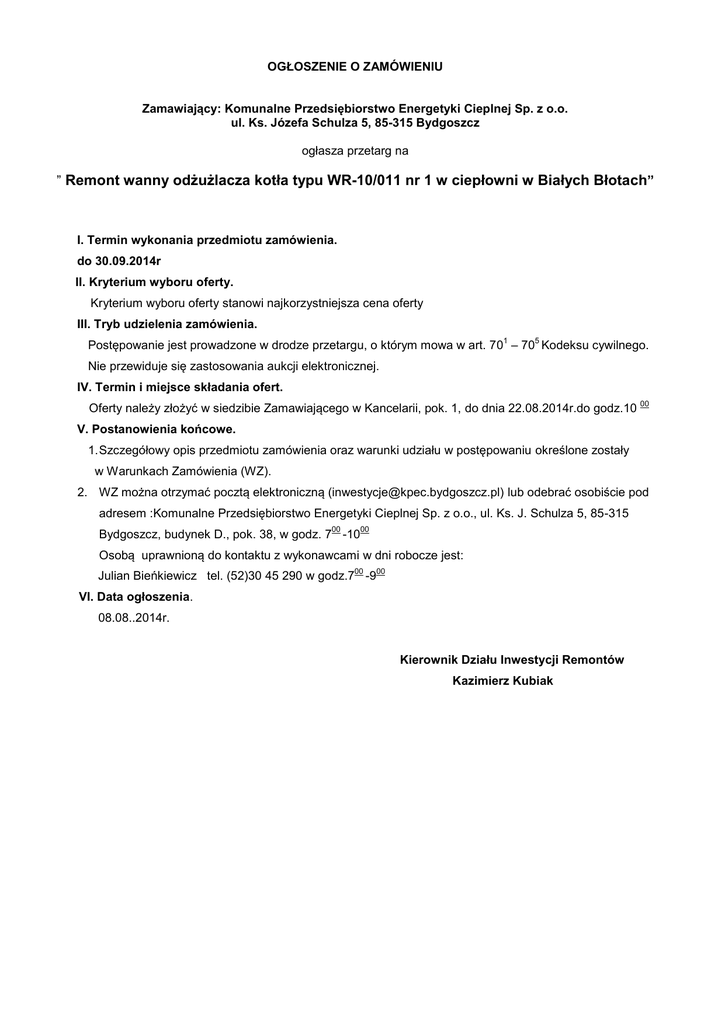 OGŁOSZENIE O ZAMÓWIENIU Zamawiający: Komunalne Przedsiębiorstwo Energetyki Cieplnej Sp. z o.o. ul. Ks. Józefa Schulza 5, 85-315 Bydgoszcz ogłasza przetarg na ” Remont wanny odżużlacza kotła typu WR-10/011 nr 1 w ciepłowni w Białych Błotach” I. Termin wykonania przedmiotu zamówienia. do 30.09.2014r II. Kryterium wyboru oferty. Kryterium wyboru oferty stanowi najkorzystniejsza cena oferty III. Tryb udzielenia zamówienia. 1 5 Postępowanie jest prowadzone w drodze przetargu, o którym mowa w art. 70 – 70 Kodeksu cywilnego. Nie przewiduje się zastosowania aukcji elektronicznej. IV. Termin i miejsce składania ofert. Oferty należy złożyć w siedzibie Zamawiającego w Kancelarii, pok. 1, do dnia 22.08.2014r.do godz.10 00 V. Postanowienia końcowe. 1. Szczegółowy opis przedmiotu zamówienia oraz warunki udziału w postępowaniu określone zostały w Warunkach Zamówienia (WZ). 2. WZ można otrzymać pocztą elektroniczną ([email protected]) lub odebrać osobiście pod adresem :Komunalne Przedsiębiorstwo Energetyki Cieplnej Sp. z o.o., ul. Ks. J. Schulza 5, 85-315 00 Bydgoszcz, budynek D., pok. 38, w godz. 7 -10 00 Osobą uprawnioną do kontaktu z wykonawcami w dni robocze jest: 00 Julian Bieńkiewicz tel. (52)30 45 290 w godz.7 -9 00 VI. Data ogłoszenia. 08.08..2014r. Kierownik Działu Inwestycji Remontów Kazimierz Kubiak