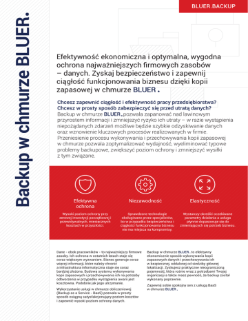 Backup w chmurze BLUER BLUER.BACKUP Efektywność ekonomiczna i optymalna, wygodna ochrona najważniejszych firmowych zasobów – danych. Zyskaj bezpieczeństwo i zapewnij ciągłość funkcjonowania biznesu dzięki kopii zapasowej w chmurze BLUER Chcesz zapewnić ciągłość i efektywność pracy przedsiębiorstwa? Chcesz w prosty sposób zabezpieczyć się przed utratą danych? Backup w chmurze BLUER pozwala zapanować nad lawinowym przyrostem informacji i zmniejszyć ryzyko ich utraty – w razie wystąpienia niepożądanych zdarzeń możliwe będzie szybkie odzyskiwanie danych oraz wznowienie kluczowych procesów realizowanych w firmie. Przeniesienie procesu wykonywania i przechowywania kopii zapasowej w chmurze pozwala zoptymalizować wydajność, wyeliminować typowe problemy backupowe, zwiększyć poziom ochrony i zmniejszyć wysiłki z tym związane. Efektywna ochrona Wysoki poziom ochrony przy zerowej inwestycji początkowej i przewidywalnych, miesięcznych kosztach w przyszłości. Niezawodność Sprawdzone technologie obsługiwane przez specjalistów, bo w przypadku bezpieczeństwa i ciągłości funkcjonowania biznesu nie ma miejsca na kompromisy. Dane - obok pracowników - to najważniejszy firmowe zasoby. Ich ochrona w ostatnich latach staje się coraz większym wyzwaniem. Biznes generuje coraz więcej informacji, które należy chronić a infrastruktura informatyczna staje się coraz bardziej złożona. Budowa systemu wykonywania kopii zapasowych i przechowywania ich na potrzeby odtworzenia w przypadku wystąpienia awarii jest kosztowna. Podobnie jak jego utrzymanie. Wykorzystanie usługi w chmurze obliczeniowej (Backup as a Service - BaaS) pozwala w prosty sposób osiągną satysfakcjonujący poziom kosztów i zapewnić wysoki poziom ochrony danych. Elastyczność Wystarczy określić oczekiwane parametry działania a usługa płynnie dopasowuje się do zmieniających się potrzeb biznesu. Backup w chmurze BLUER to efektywny ekonomicznie sposób wykonywania kopii zapasowych danych i przechowywania ich w bezpiecznej, oddalonej od siedziby głównej lokalizacji. Zyskujesz praktyczne nieograniczoną pojemność, która rośnie wraz z potrzebami Twojej organizacji a także masz pewność, że backup został wykonany poprawnie. Zapewnij sobie spokojny sen z usługą BaaS w chmurze BLUER Model cloud computing optymalnie odpowiada na potrzeby przedsiębiorstw w obszarze backupu danych. Przede wszystkim zapewnia niskie całkowite koszty utrzymania (TCO) – eliminujesz inwestycję początkową i zyskujesz przewidywalne, miesięczne koszty w przyszłości. Nie zaskoczą Cię koszty związane z dodatkowymi wydatkami wynikającymi z konieczności wprowadzania zmian w istniejącej infrastrukturze. Przy tym zaawansowane technologie pozwalają zredukować przestrzeń dyskową potrzebną na przechowywanie danych. działania płynnie zwiększają się lub zmniejszają - w zgodzie ze zmieniającymi się wymaganiami. Co zyskujesz? Jeśli chodzi o bezpieczeństwo i ciągłość funkcjonowania Twojej firmy, nie warto iść na jakiekolwiek kompromisy. Dlatego wykorzystujemy sprawdzone technologie najwyższej klasy oferowane przez firmę HPE. Rozwiązania są projektowane oraz obsługiwane przez doświadczony zespół inżynierów i administratorów. Usługa backupu w chmurze to gwarancja płynnego rozwoju wraz ze wzrostem firmy. Pojemność rozwiązania oraz parametry jego To wszystko oznacza mniejsze ryzyko przestojów czy zmniejszenia produktywności. Określ częstotliwość wykonywania kopii zapasowych (RPO) oraz maksymalny czas odtwarzania danych (RTO) zgodnie z potrzebami biznesowymi, a my zajmiemy się całą resztą – wszystko będzie działało poprawnie a postawione cele zostaną osiągnięte. To łatwiejsze niż myślisz! Jak chronić dane i zapewnić ciągłość funkcjonowania biznesu z chmurą BLUER ? To proste jak 1, 2, 3! 1 2 3 Użyj kalkulatora do wstępnego obliczenia kosztów usługi Prześlij do nas zapytanie Wybierz optymalną opcję a my uruchomimy usługę Teraz wykonanie kopii zapasowej danych przechowywane w bezpiecznej lokalizacji jest szybkie i proste. Wszystko, co jest do tego potrzebne dostarcza usługa w chmurze BLUER Wszystkie zadania techniczne związane z jej obsługą realizuje zespół specjalistów Betacom. Rozwijaj się dzięki chmurze BLUER - szybciej, taniej, wygodniej! O BLUER Operatorem chmury BLUER jest Betacom S.A. To notowany na Giełdzie Papierów Wartościowych w Warszawie integrator systemów IT specjalizujący się w projektowaniu, doradztwie oraz wdrażaniu innowacyjnych rozwiązań informatycznych. Istniejąca od 1995 roku firma koncentruje się na wspieraniu klientów w dostosowywaniu się do szybko zmieniającego się środowiska biznesowego. BLUER Cloud Partner Betacom S.A. ul. Połczyńska 31A 01-377 Warszawa Wykorzystując światowej klasy technologie, zgromadzoną wiedzę i wieloletnie doświadczenie dostarcza wymierne korzyści biznesowe wnosząc do działalności swoich klientów realną wartość dodaną. Wszystkie projekty traktujemy indywidualnie biorąc pod uwagę wymagania i potrzeby klientów – dlatego kończymy je sukcesem! +48 22 533 98 84 www.bluer.pl