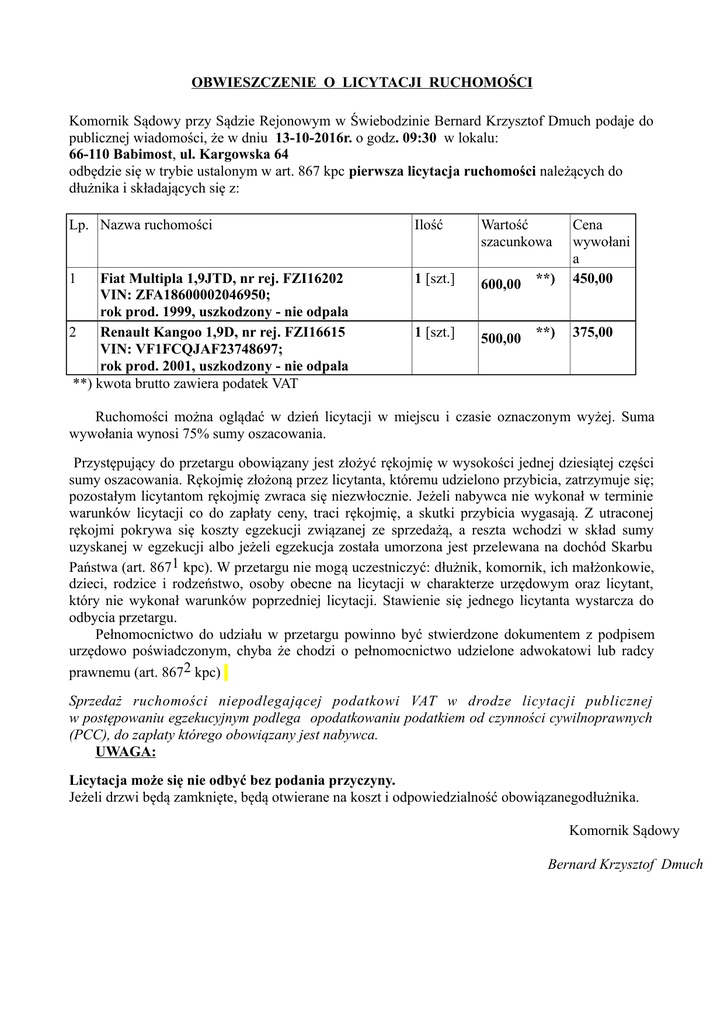 OBWIESZCZENIE O LICYTACJI RUCHOMOŚCI Komornik Sądowy przy Sądzie Rejonowym w Świebodzinie Bernard Krzysztof Dmuch podaje do publicznej wiadomości, że w dniu 13-10-2016r. o godz. 09:30 w lokalu: 66-110 Babimost, ul. Kargowska 64 odbędzie się w trybie ustalonym w art. 867 kpc pierwsza licytacja ruchomości należących do dłużnika i składających się z: Lp. Nazwa ruchomości Ilość Wartość szacunkowa 1 1 [szt.] 600,00 **) Cena wywołani a 450,00 1 [szt.] 500,00 **) 375,00 Fiat Multipla 1,9JTD, nr rej. FZI16202 VIN: ZFA18600002046950; rok prod. 1999, uszkodzony - nie odpala 2 Renault Kangoo 1,9D, nr rej. FZI16615 VIN: VF1FCQJAF23748697; rok prod. 2001, uszkodzony - nie odpala **) kwota brutto zawiera podatek VAT Ruchomości można oglądać w dzień licytacji w miejscu i czasie oznaczonym wyżej. Suma wywołania wynosi 75% sumy oszacowania. Przystępujący do przetargu obowiązany jest złożyć rękojmię w wysokości jednej dziesiątej części sumy oszacowania. Rękojmię złożoną przez licytanta, któremu udzielono przybicia, zatrzymuje się; pozostałym licytantom rękojmię zwraca się niezwłocznie. Jeżeli nabywca nie wykonał w terminie warunków licytacji co do zapłaty ceny, traci rękojmię, a skutki przybicia wygasają. Z utraconej rękojmi pokrywa się koszty egzekucji związanej ze sprzedażą, a reszta wchodzi w skład sumy uzyskanej w egzekucji albo jeżeli egzekucja została umorzona jest przelewana na dochód Skarbu Państwa (art. 8671 kpc). W przetargu nie mogą uczestniczyć: dłużnik, komornik, ich małżonkowie, dzieci, rodzice i rodzeństwo, osoby obecne na licytacji w charakterze urzędowym oraz licytant, który nie wykonał warunków poprzedniej licytacji. Stawienie się jednego licytanta wystarcza do odbycia przetargu. Pełnomocnictwo do udziału w przetargu powinno być stwierdzone dokumentem z podpisem urzędowo poświadczonym, chyba że chodzi o pełnomocnictwo udzielone adwokatowi lub radcy prawnemu (art. 8672 kpc) Sprzedaż ruchomości niepodlegającej podatkowi VAT w drodze licytacji publicznej w postępowaniu egzekucyjnym podlega opodatkowaniu podatkiem od czynności cywilnoprawnych (PCC), do zapłaty którego obowiązany jest nabywca. UWAGA: Licytacja może się nie odbyć bez podania przyczyny. Jeżeli drzwi będą zamknięte, będą otwierane na koszt i odpowiedzialność obowiązanegodłużnika. Komornik Sądowy Bernard Krzysztof Dmuch OBWIESZCZENIE O LICYTACJI RUCHOMOŚCI Komornik Sądowy przy Sądzie Rejonowym w Świebodzinie Bernard Krzysztof Dmuch podaje do publicznej wiadomości, że w dniu 13-10-2016r. o godz. 09:00 w lokalu: 66-110 Babimost, ul. Kargowska 64 odbędzie się w trybie ustalonym w art. 867 kpc druga licytacja ruchomości należących do dłużnika i składających się z: Lp. Nazwa ruchomości Ilość Wartość szacunkowa 1 1 [szt.] 25 000,00 **) Samochód osobowy Ford S-Max 2,0 diesel, rok prod.2007, FZI 36TF, srebrny, VIN WF0SXXGBWS7D42753 Cena wywołani a 12 500,00 **) kwota brutto zawiera podatek VAT Ruchomości można oglądać w dzień licytacji w miejscu i czasie oznaczonym wyżej. Suma wywołania wynosi 50% sumy oszacowania. Przystępujący do przetargu obowiązany jest złożyć rękojmię w wysokości jednej dziesiątej części sumy oszacowania. Rękojmię złożoną przez licytanta, któremu udzielono przybicia, zatrzymuje się; pozostałym licytantom rękojmię zwraca się niezwłocznie. Jeżeli nabywca nie wykonał w terminie warunków licytacji co do zapłaty ceny, traci rękojmię, a skutki przybicia wygasają. Z utraconej rękojmi pokrywa się koszty egzekucji związanej ze sprzedażą, a reszta wchodzi w skład sumy uzyskanej w egzekucji albo jeżeli egzekucja została umorzona jest przelewana na dochód Skarbu Państwa (art. 8671 kpc). W przetargu nie mogą uczestniczyć: dłużnik, komornik, ich małżonkowie, dzieci, rodzice i rodzeństwo, osoby obecne na licytacji w charakterze urzędowym oraz licytant, który nie wykonał warunków poprzedniej licytacji. Stawienie się jednego licytanta wystarcza do odbycia przetargu. Pełnomocnictwo do udziału w przetargu powinno być stwierdzone dokumentem z podpisem urzędowo poświadczonym, chyba że chodzi o pełnomocnictwo udzielone adwokatowi lub radcy prawnemu (art. 8672 kpc) Sprzedaż ruchomości niepodlegającej podatkowi VAT w drodze licytacji publicznej w postępowaniu egzekucyjnym podlega opodatkowaniu podatkiem od czynności cywilnoprawnych (PCC), do zapłaty którego obowiązany jest nabywca. UWAGA: Licytacja może się nie odbyć bez podania przyczyny. Jeżeli drzwi będą zamknięte, będą otwierane na koszt i odpowiedzialność obowiązanegodłużnika. z up. Komornika Sądowego Asesor Komorniczy z up. Komornika Sądowego Asesor Komorniczy Komornik Sądowy Marcin Szczepański Andrzej Rogoziński Bernard Krzysztof Dmuch
