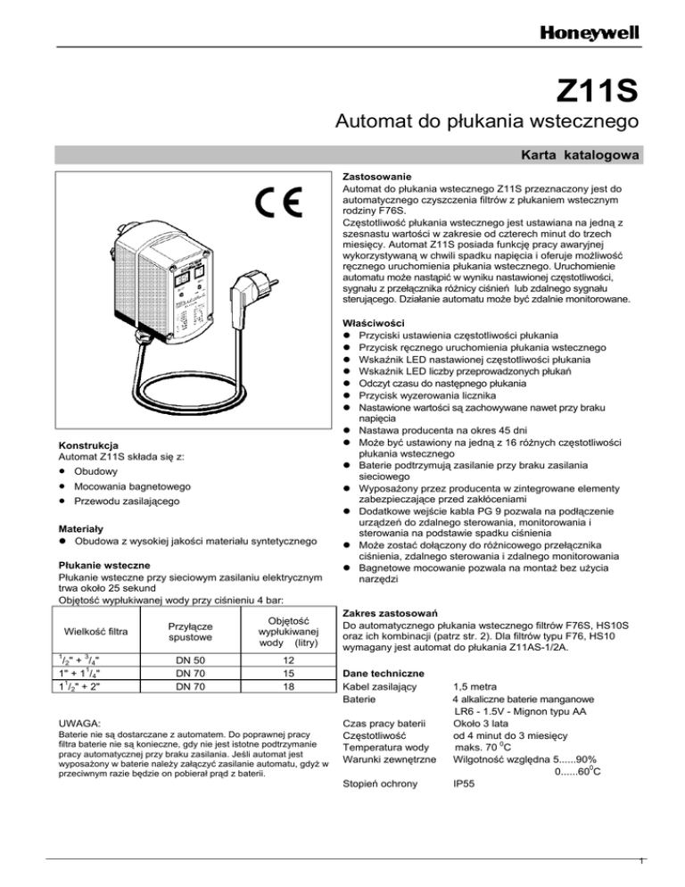 Z11S Automat do płukania wstecznego Karta katalogowa Zastosowanie Automat do płukania wstecznego Z11S przeznaczony jest do automatycznego czyszczenia filtrów z płukaniem wstecznym rodziny F76S. Częstotliwość płukania wstecznego jest ustawiana na jedną z szesnastu wartości w zakresie od czterech minut do trzech miesięcy. Automat Z11S posiada funkcję pracy awaryjnej wykorzystywaną w chwili spadku napięcia i oferuje możliwość ręcznego uruchomienia płukania wstecznego. Uruchomienie automatu może nastąpić w wyniku nastawionej częstotliwości, sygnału z przełącznika różnicy ciśnień lub zdalnego sygnału sterującego. Działanie automatu może być zdalnie monitorowane. Konstrukcja Automat Z11S składa się z: Obudowy Mocowania bagnetowego Przewodu zasilającego Materiały Obudowa z wysokiej jakości materiału syntetycznego Płukanie wsteczne Płukanie wsteczne przy sieciowym zasilaniu elektrycznym trwa około 25 sekund Objętość wypłukiwanej wody przy ciśnieniu 4 bar: Wielkość filtra 1 /2 " + 3 /4 " 1" + 11/4" 11/2" + 2" Przyłącze spustowe Objętość wypłukiwanej wody (litry) DN 50 DN 70 DN 70 12 15 18 UWAGA: Baterie nie są dostarczane z automatem. Do poprawnej pracy filtra baterie nie są konieczne, gdy nie jest istotne podtrzymanie pracy automatycznej przy braku zasilania. Jeśli automat jest wyposażony w baterie należy załączyć zasilanie automatu, gdyż w przeciwnym razie będzie on pobierał prąd z baterii. Właściwości Przyciski ustawienia częstotliwości płukania Przycisk ręcznego uruchomienia płukania wstecznego Wskaźnik LED nastawionej częstotliwości płukania Wskaźnik LED liczby przeprowadzonych płukań Odczyt czasu do następnego płukania Przycisk wyzerowania licznika Nastawione wartości są zachowywane nawet przy braku napięcia Nastawa producenta na okres 45 dni Może być ustawiony na jedną z 16 różnych częstotliwości płukania wstecznego Baterie podtrzymują zasilanie przy braku zasilania sieciowego Wyposażony przez producenta w zintegrowane elementy zabezpieczające przed zakłóceniami Dodatkowe wejście kabla PG 9 pozwala na podłączenie urządzeń do zdalnego sterowania, monitorowania i sterowania na podstawie spadku ciśnienia Może zostać dołączony do różnicowego przełącznika ciśnienia, zdalnego sterowania i zdalnego monitorowania Bagnetowe mocowanie pozwala na montaż bez użycia narzędzi Zakres zastosowań Do automatycznego płukania wstecznego filtrów F76S, HS10S oraz ich kombinacji (patrz str. 2). Dla filtrów typu F76, HS10 wymagany jest automat do płukania Z11AS-1/2A. Dane techniczne Kabel zasilający Baterie Czas pracy baterii Częstotliwość Temperatura wody Warunki zewnętrzne Stopień ochrony 1,5 metra 4 alkaliczne baterie manganowe LR6 - 1.5V - Mignon typu AA Około 3 lata od 4 minut do 3 miesięcy 0 maks. 70 C Wilgotność względna 5......90% 0 0......60 C IP55 1 Zasada działania Automat Z11S zamyka i otwiera zawór kulowy wg nastawionej częstotliwości. Otwarcie zaworu powoduje powstanie w filtrze różnicy ciśnienia, która uaktywnia funkcję płukania wstecznego. Po zakończeniu płukania wstecznego zawór kulowy zamyka się. Cztery baterie (nie dołączone do urządzenia) powodują zamknięcie zaworu kulowego, jeśli podczas płukania wstecznego wyłączone zostanie zasilanie sieciowe - zabezpiecza to przed niekontrolowanym zrzutem wody. Opcje Dla filtrów produkowanych po 1997 roku automat czasowy współpracuje z filtrami i kombinacjami(filtr z regulatorem ciśnienia) jak niżej: HS10S, F76S, F76CS, FK76CS, FKN76CS, FN76CS, FK74C, F74C, FKN74C, FN74C i FN09S. Oznaczenia katalogowe Z11S - A = Przewód długości 1.5 metra Z11S - B = 230 V, 50/60Hz, 10W z wtyczką elektryczną 24 V, 50/60Hz, 10W bez wtyczki elektrycznej Dodatkowe możliwości podłączenia Zdalne sterowanie Różnicowy przełącznik ciśnienia Zdalne monitorowanie Funkcja płukania wstecznego może być uruchamiana jeśli jest to konieczne za pomocą różnicowego przełącznika ciśnienia DDS76 ze styku beznapięciowego. Zalecane jest ustawienie różnicy ciśnienia na 1,0 bar. Różnicowy przełącznik ciśnienia DDS76 w połączeniu z Z11S może być wykorzystywany tylko dla filtrów F76S. Do zdalnego monitorowania położenia ”otwarty”, “zamknięty” zaworu kulowego wykorzystywany jest sygnał ciągły 0 - 10V. Wartość maksymalnego, dopuszczalnego prądu wynosi 10mA. Sygnał o napięciu pomiędzy 5 a 6V wskazuje na obecność napięcia sieciowego oraz sygnalizuje, że zawór spustowy jest zamknięty, sygnał o napięciu 0,5V wskazuje na otwarcie zaworu. analogowe cyfrowe Z11S może być sterowany zdalnie przy pomocy beznapięciowego styku przekaźnikowego (np. Honeywell Centra typu REL 2). Minimalny czas trwania impulsu dla przesterowania automatu wynosi jedną sekundę. Honeywell Sp. z o. o. ul. Domaniewska 39B, 02-672 WARSZAWA Tel.:22 606 09 00; Faks: 22 606 09 83 http://www.honeywell.com.pl/automatyka_domow 2 Z11s-k-pl01r1113