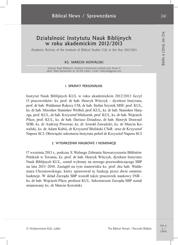 Działalność Instytutu Nauk Biblijnych w roku akademickim 2012/2013 Academic Activity of the Institute of Biblical Studies CUL in the Year 2012/2013 KS. MARCIN KOWALSKI 241 BibAn 4 (2014) 241-254 Biblical News / Sprawozdania Instytut Nauk Biblijnych, Katolicki Uniwersytet Lubelski Jana Pawła II adres: Aleje Racławickie 14, 20-950 Lublin, e-mail: [email protected] 1. SPRAWY PERSONALNE: Instytut Nauk Biblijnych KUL w roku akademickim 2012/2013 liczył 15 pracowników: ks. prof. dr hab. Henryk Witczyk – dyrektor Instytutu, prof. dr hab. Waldemar Rakocy CM, dr hab. Stefan Szymik MSF, prof. KUL, ks. dr hab. Mirosław Stanisław Wróbel, prof. KUL, ks. dr hab. Stanisław Haręzga, prof. KUL, dr hab. Krzysztof Mielcarek, prof. KUL, ks. dr hab. Wojciech Pikor, prof. KUL, ks. dr hab. Dariusz Dziadosz, dr hab. Henryk Drawnel SDB, ks. dr Andrzej Piwowar, ks. dr Arnold Zawadzki, ks. dr Marcin Kowalski, ks. dr Adam Kubiś, dr Krzysztof Bieliński CSsR oraz dr Krzysztof Napora SCJ. Obowiązki sekretarza Instytutu pełnił dr Krzysztof Napora SCJ. 2. WYDARZENIA NAUKOWE I NOMINACJE 17 września 2013 r., podczas X Walnego Zebrania Stowarzyszenia Biblistów Polskich w Toruniu, ks. prof. dr hab. Henryk Witczyk, dyrektor Instytutu Nauk Biblijnych KUL, został wybrany na nowego przewodniczącego SBP na lata 2013–2018. Zastąpił na tym stanowisku ks. prof. dra hab. Waldemara Chrostowskiego, który sprawował tę funkcję przez dwie ostatnie kadencje. W skład Zarządu SBP wszedł także pracownik naukowy INB – ks. dr hab. Wojciech Pikor, profesor KUL. Sekretarzem Zarządu SBP został mianowany ks. dr Marcin Kowalski. © Wydawnictwo KUL , Lublin The Biblical Annals / Roczniki Biblijne Tom 4, z. 1 (2014) 242 Ks. Marcin Kowalski 3. SYMPOZJA NAUKOWE ORGANIZOWANE W INSTYTUCIE NAUK BIBLIJNYCH KUL Biblical News 3.1. VIII Międzynarodowe Jesienne Dni Biblijne „Od wiary Abrahama do wiary Kościoła”, KUL, 18–19 października 2012 VIII Międzynarodowe Jesienne Dni Biblijne organizowane przez Instytut Nauk Biblijnych KUL tematyką wpisywały się w zaproponowaną Kościołowi powszechnemu przez Benedykta XVI refleksję nad aktem wiary. Celem dwudniowej konferencji było zwrócenie się ku biblijnym korzeniom wiary w jej następujących aspektach: język, jakim Stary i Nowy Testament wyraża postawę wierzącego, wielkie postacie historii zbawienia przecierające szlaki wiary (Abraham, Noe, św. Piotr, św. Paweł), wiara Jezusa, rozwój depozytu wiary, wiara i poznanie, wiara i pamięć, wspólnotowy wymiar wiary, wiara wobec niewiary, wzrost wiary i zagrożenia, jakim musi ona stawić czoła. Gościem specjalnym konferencji był znany i ceniony na całym świecie biblista, profesor Papieskiego Instytutu Biblijnego, o. Jean-Louis Ska SJ. Jako prelegent wystąpił także biblista i lingwista J.E. dr János Székely, biskup pomocniczy diecezji Esztergom-Budapeszt. Swoje referaty przedstawili naukowcy i wykładowcy z Włoch, Węgier, Słowacji oraz z rodzimych ośrodków teologicznych (Lublin, Wrocław, Katowice, Kraków). Program Jesiennych Dni Biblijnych obejmował dwa dni, w trakcie których wygłoszono 16 referatów. Podczas trzech sesji naukowych 18 października 2012 r. miały miejsce następujące wystąpienia: Sesja I, przewodniczył ks. dr hab. Henryk Drawnel SDB, KUL: –– J.E. dr János Székely, biskup pomocniczy diecezji Esztergom-Budapeszt, Węgry, „Il vocabolario biblico sulla fede (’aman; batach; pisteuo etc.). Un confronto con il linguaggio ellenistico, e con il linguaggio del giudaismo intertestamentario”. –– Ks. prof. dr hab. Henryk Witczyk, KUL, „Myśmy uwierzyli i poznali…” (J 6,69). Rola poznania i wiary w kreowaniu komunii z Jezusem – Panem. –– Dr Krzysztof Napora SCJ, KUL, „Ojciec naszej wiary: Abraham? a może Noe?”. Sesja II, przewodniczył ks. dr hab. Wojciech Pikor, KUL: –– Ks. dr hab. Henryk Drawnel SDB, KUL, „Przyczyny rozwoju wiary w grzeszne anioły w judaizmie okresu Drugiej Świątyni”. –– Ks. dr Wojciech Węgrzyniak, UPJPII Kraków, „Głupota niewiary”. Vol. 4, no. 1 (2014) The Biblical Annals / Roczniki Biblijne 243 Działalność Instytutu Nauk Biblijnych w roku akademickim 2012/2013 W piątek, 19 października 2012 r., wygłoszono następujące referaty: Sesja IV, przewodniczył p. dr hab. Krzysztof Mielcarek, prof. KUL: –– Dr Mykhaylyna Kľusková, Ružomberok, „Funkcja wyznań nieporównywalności Boga w Ps 71, 77 i 86”. –– Ks. dr hab. Jan Klinkowski, prof. PWT Wrocław, „Wyznanie wiary Piotra (Mt 16,13-20) w kompozycji Ewangelii”. –– Dr Branislav Kľuska, Ružomberok, „Pamięć prowadząca do pełni wiary według czwartej Ewangelii”. Sesja V, przewodniczył ks. dr hab. Stefan Szymik MSF, prof. KUL: –– Dr hab. Krzysztof Mielcarek, prof. KUL, „Wiara pogan w trzeciej Ewangelii (Łk 7,1-10)”. –– Dr Piotr Nyk OCD, „Aktualizująca metoda interpretacji Starego Testamentu w Dz 4,23-31 jako wyraz wiary i przyczynek do jej wzrostu”. Sesja VI, przewodniczył ks. dr Marcin Kowalski, KUL: –– Prof. dr hab. Ewa J. Jezierska OSU, PWT Wrocław, „W Chrystusie Jezusie ani obrzezanie, ani jego brak nie mają żadnego znaczenia, tylko wiara” (Ga 5,6). –– Ks. dr Adam Kubiś, KUL, „Uwierzyliśmy miłości (1 J 4,16). Rozumienie terminów «wiara» i «wierzyć» w 1 Liście św. Jana”. –– Ks. dr Tomasz Siemieniec, KUL, „Zagrożenia wiary i sposoby ich przezwyciężania w świetle Listów do Kościołów (Ap 2–3)”. Sprawozdani a Sesja III, przewodniczył ks. prof. dr hab. Henryk Witczyk, KUL: –– Ks. mgr lic. Mariusz Górny SSP, PIB Rzym, „Wiara Abrahama w Ps 47 i 105”. –– Ks. dr hab. Artur Malina, prof. UŚ Katowice, „Jezus jako wierzący (Mk 9,23)?”. –– O. prof. Jean-Louis Ska SJ, PIB Rzym, „Abramo e Ulisse: la fede e il viaggio senza ritorno”. 3.2. Wiosenne Dni Biblijne, „Świadkowie wiary – Rok Wiary w Kościele”, KUL, 13 marca 2013 r. Program Wiose
