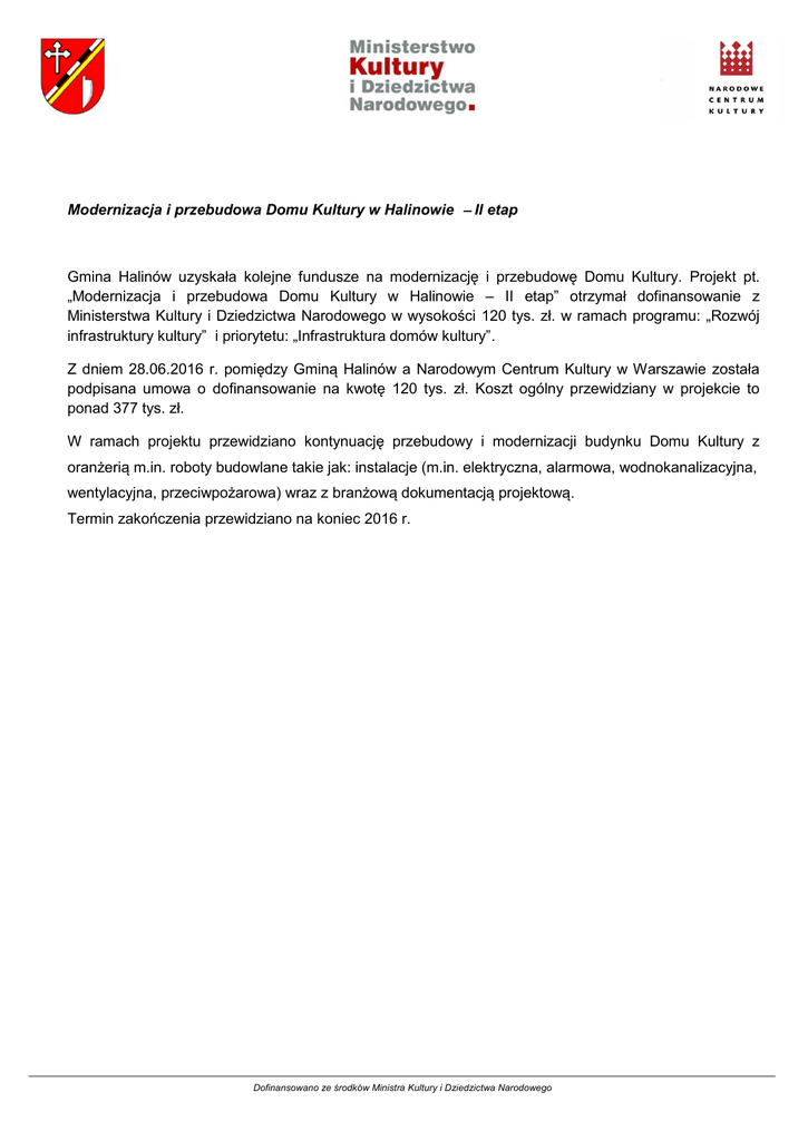 Modernizacja i przebudowa Domu Kultury w Halinowie II etap Gmina Halinów uzyskała kolejne fundusze na modernizację i przebudowę Domu Kultury. Projekt pt. „Modernizacja i przebudowa Domu Kultury w Halinowie – II etap” otrzymał dofinansowanie z Ministerstwa Kultury i Dziedzictwa Narodowego w wysokości 120 tys. zł. w ramach programu: „Rozwój infrastruktury kultury” i priorytetu: „Infrastruktura domów kultury”. Z dniem 28.06.2016 r. pomiędzy Gminą Halinów a Narodowym Centrum Kultury w Warszawie została podpisana umowa o dofinansowanie na kwotę 120 tys. zł. Koszt ogólny przewidziany w projekcie to ponad 377 tys. zł. W ramach projektu przewidziano kontynuację przebudowy i modernizacji budynku Domu Kultury z oranżerią m.in. roboty budowlane takie jak: instalacje (m.in. elektryczna, alarmowa, wodnokanalizacyjna, wentylacyjna, przeciwpożarowa) wraz z branżową dokumentacją projektową. Termin zakończenia przewidziano na koniec 2016 r. Dofinansowano ze środków Ministra Kultury i Dziedzictwa Narodowego