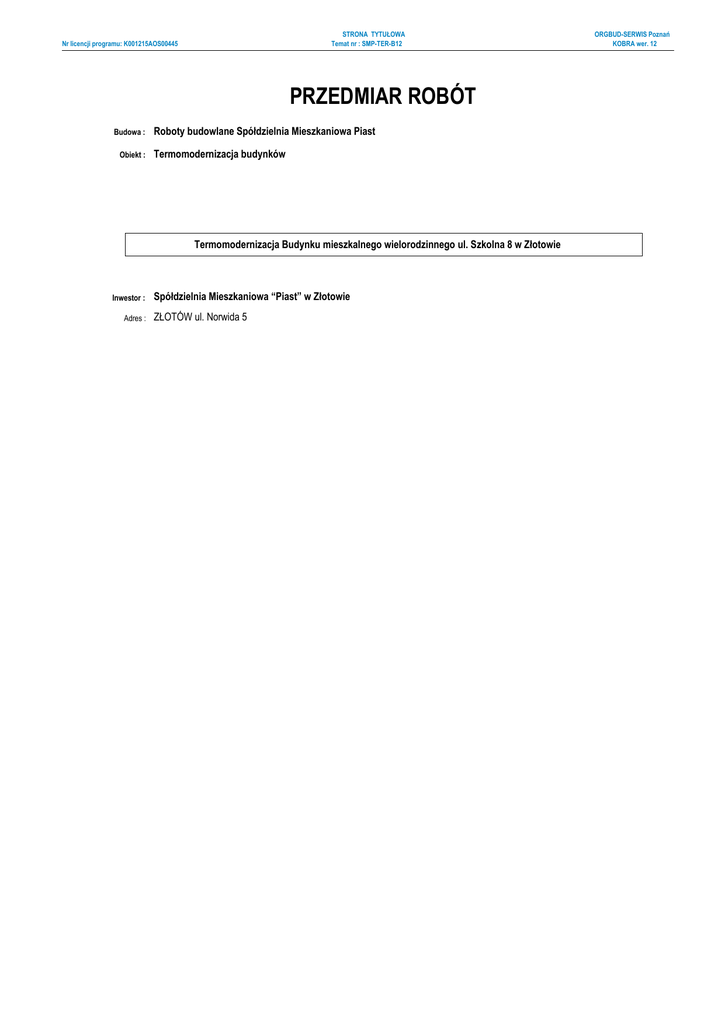 STRONA TYTUŁOWA Temat nr : SMP-TER-B12 Nr licencji programu: K001215AOS00445 PRZEDMIAR ROBÓT Budowa : Obiekt : Roboty budowlane Spółdzielnia Mieszkaniowa Piast Termomodernizacja budynków Termomodernizacja Budynku mieszkalnego wielorodzinnego ul. Szkolna 8 w Złotowie Inwestor : Adres : Spółdzielnia Mieszkaniowa “Piast” w Złotowie ZŁOTÓW ul. Norwida 5 ORGBUD-SERWIS Poznań KOBRA wer. 12 PRZEDMIAR ROBÓT Temat nr : SMP-TER-B12 Nr licencji programu: K001215AOS00445 ORGBUD-SERWIS Poznań KOBRA wer. 12 Termomodernizacja Budynku mieszkalnego wielorodzinnego ul. Szkolna 8 w Złotowie Roboty budowlane Spółdzielnia Mieszkaniowa Piast Obiekt : Termomodernizacja budynków Budowa : Data: 2016-03-09 Lp. Str. 1 Podstawa kalkulacji / opis pozycji Ilość Jedn. miary 1 ROBOTY PRZYGOTOWAWCZE 1.1 Roboty przygotowawcze 1 Odbicie tynków wewnętrznych o powierzchni ponad 5,0 m2 na ścianach, filarach i pilastrach bez względu na rodzaj podłoża,z ewentualnym usunięciem osiatkowania lub dranic - tynki z zaprawy: cementowo-wapiennej 120,000 m2 2 Uzupełnienie tynków zwykłych wewn.kat.III z zaprawy cem.,na ścianach płaskich i słupach prostokąt. (na podłożu z betonów żwirowych, płyt wiór.-cem.), przy pow.otynkowania w jednym miejscu: ponad 2,0 do 5,0 m2 120,000 m2 3 ODBICIE TYNKÓW OSCIEŻY -LUŹNYCH ORAZ KOLIDUJACYCH Z SZEROKOŚCIĄ RAMY OKIENNĄ 1,000 kpl 4 SPRAWDZENIE NOSNOSCI I PRZYCZEPNOŚCI IZOLACJI Z PŁYT SUPREMY (istnieje mozliwość demontażu z wywozem i utylizacja płyt wiórowo cementowych w przypadku stwierdzenia takiej konieczności na dodatkowe zlecenie) 1,000 kpl 2 TERMOMODERNIZACJA- DOCIEPLENIE ŚCIAN 2.2 ELEWACJE ŚCIANY 5 Docieplenie ścian zewnętrznych budynków płytami styropianowymi gr.14 cm, z przyklejeniem jednej warstwy siatki, dyblowaniem 6szt./m2 i wykonaniem wyprawy elewcyjnej na pow.pełnych i z otworami: betonowych, otynkowanych, MASA STRUKTURALNA SILIKONOWA 6 Docieplenie ościeży zewnętrznych gr. min. 2 cm, poprzez przyklejenie styropianu i jednej warstwy siatki oraz wykonanie wyprawy elewacyjnej 1 339,301 m2 158,576 m2 2.3 LOGGIE 7 LOGGIE (ściany boczne i sufit). Docieplenie ścian zewnętrznych budynków płytami styropianowymi gr.11cm- grafit, ", z przyklejeniem jednej warstwy siatki, dyblowaniem 6szt./m2 i wykonaniem wyprawy elewcyjnej na pow.pełnych i z otworami: betonowych, otynkowanych, MASA STRUKTURALNAMINERALNA 256,932 m2 8 ROZBIÓRKA BALUSTRAD 78,650 9 Rozebranie - ręczne rozbicie elementów konstrukcji betonowych: niezbrojonych o grub. do 15 cm 5,710 m3 10 Rozbiórka pokrycia z papy na dachach drewnianych: pierwsza warstwa 95,160 m2 11 Rozebranie obróbek blacharskich murów ogniowych, okapów, kołnierzy, gzymsów itp. z blachy: nie nadającej się do ponownego użytku 49,010 m2 12 Izolacje przeciwwilgociowe powłokowe , poziome, wykonane na zimno -analogia IZOLACJA SYSTEMOWA TARASOWA 101,400 m2 13 Obróbki z blachy ocynkowanej grub. 0,55 mm, o szerokości w rozwinięciu: do 35 cm 49,010 m2 14 Warstwy wyrównawcze pod posadzki, z zaprawy cementowej, grubości 20 mm, zatarte: na gładko 95,160 m2 15 Dodatek lub potrącenie do warstwy wyrównawczej za zmianę grubości o 10 mm 95,160 m2 16 Posadzki jedno- i dwubarwne z płytek z kamieni sztucznych, na zaprawie klejowej, układane metodą regularną z płytek podłogowych o wymiarach: 30x30cm, za pomocą kleju o najwyższej obciążal. 81,619 m2 17 Balustrady z pochwytem stalowym balkonowe proste- WG PROJEKTU Z MONTAZEM 78,650 m 2.4 RUSZTOWANIA 18 Montaż i demontaż rusztowań zewnętrznych rurowych o wysokości: do 20 m 19 Koszty pracy rusztowań 14,000 100 m2 1,000 kpl 2.5 ROBOTY UZUPEŁNIAJĄCE 20 Obróbki blacharskie z blachy stalowej ocynkowanej, o szerokości w rozwinięciu ponad 25 cm-OBRÓBKI i OGNIOMURY 21 Rury spustowe okrągłe z blachy ocynkowanej grubości 0,55 mm, o średnicy: 15 cm 22 Licowanie ościeży płytkami klinkierowymi o wymiarach: 35 x 15 cm-PARAPETY 23 MONTAZ RUR SPUSTOWYCH W ISTNIEJĄCYCH WPUSTACH ŻELIWNYCH KANALIZACJI DESZZCOWEJ / DODATEK ZA "PRZEKŁADKĘ" Z UWAGI NA MONTAZ DOCIEPLENIA 23,856 m2 86,200 m 52,273 m2 1,000 KPL PRZEDMIAR ROBÓT Temat nr : SMP-TER-B12 Nr licencji programu: K001215AOS00445 ORGBUD-SERWIS Poznań KOBRA wer. 12 Termomodernizacja Budynku mieszkalnego wielorodzinnego ul. Szkolna 8 w Złotowie 2. TERMOMODERNIZACJA- DOCIEPLENIE ŚCIAN 2.5. ROBOTY UZUPEŁNIAJĄCE Data: 2016-03-09 Lp. Str. 2 Podstawa kalkulacji / opis pozycji Ilość Jedn. miary 24 MONTAZ DOMKÓW LĘGOWYCH- ZALECENIA OPINII ORNITOLOGICZNEJ -wróble- 4 szt. -jerzyki-24 szt. -kawki-1 szt. 29,000 szt. 25 Wykonanie otworów wentylujących stropodach w ścianach z montażem kratek wentylacyjnych 30,000 szt 26 WYWÓZ I UTYLIZACJA SMIECI I GRUZU 1,000 KPL 2.6 INSTALACJA ODGROMOWA 27 ODTWORZENIE WSZYSTKICH ZWODÓW PIONOWYCH -MONTAZ W RURKACH ZE SKRZYNKAMI REWIZYJNYMI Z DOKONANIEM NIEZBĘDNYCH POMIARÓW --- Koniec wydruku --- 1,000 kpl STRONA TYTUŁOWA Temat nr : SMP-TER-RD8 Nr licencji programu: K001215AOS00445 PRZEDMIAR ROBÓT Budowa : Obiekt : Roboty budowlane Spółdzielnia Mieszkaniowa Piast Termomodernizacja budynków Termomodernizacja budynku wielorodzinnego ul. Szkolna 8 - ROBOTY TOWARZYSZĄCE Inwestor : Adres : Spółdzielnia Mieszkaniowa “Piast” w Złotowie 77-400 Złotów ul. Norwida 5 ORGBUD-SERWIS Poznań KOBRA wer. 12 PRZEDMIAR ROBÓT Temat nr : SMP-TER-RD8 Nr licencji programu: K001215AOS00445 ORGBUD-SERWIS Poznań KOBRA wer. 12 Termomodernizacja budynku wielorodzinnego ul. Szkolna 8 - ROBOTY TOWARZYSZĄCE Roboty budowlane Spółdzielnia Mieszkaniowa Piast Obiekt : Termomodernizacja budynków Budowa : Data: 2016-03-09 Lp. Str. 1 Podstawa kalkulacji / opis pozycji Ilość Jedn. miary 1 Roboty towarzyszące 1.1 Remont cokołu budynku 1 NNRKB 007-2608-01-00 BEiDOEPB ORGBUD W-wa [ Wyd.BEiDOEPB ORGBUD W-wa 1999 r. ] 81,712 m2 Docieplenie ścian zewnętrznych budynków płytami styropianowymi gr.3 cm, z przyklejeniem jednej warstwy siatki i wykonaniem wyprawy elewcy
