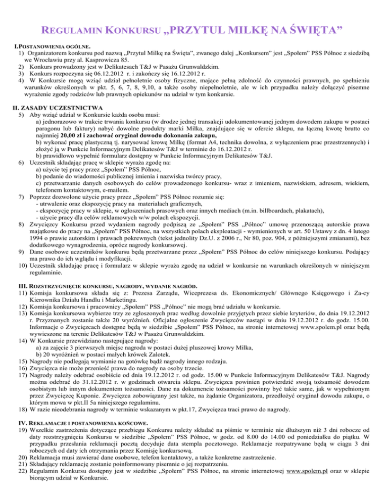 REGULAMIN KONKURSU „PRZYTUL MILKĘ NA ŚWIĘTA” I.POSTANOWIENIA OGÓLNE. 1) Organizatorem konkursu pod nazwą „Przytul Milkę na Święta”, zwanego dalej „Konkursem” jest „Społem” PSS Północ z siedzibą we Wrocławiu przy al. Kasprowicza 85. 2) Konkurs prowadzony jest w Delikatesach T&J w Pasażu Grunwaldzkim. 3) Konkurs rozpoczyna się 06.12.2012 r. i zakończy się 16.12.2012 r. 4) W Konkursie mogą wziąć udział pełnoletnie osoby fizyczne, mające pełną zdolność do czynności prawnych, po spełnieniu warunków określonych w pkt. 5, 6, 7, 8, 9,10, a także osoby niepełnoletnie, ale w ich przypadku należy dołączyć pisemne wyrażenie zgody rodziców lub prawnych opiekunów na udział w tym konkursie. II. ZASADY UCZESTNICTWA 5) Aby wziąć udział w Konkursie każda osoba musi: a) jednorazowo w trakcie trwania konkursu (w drodze jednej transakcji udokumentowanej jednym dowodem zakupu w postaci paragonu lub faktury) nabyć dowolne produkty marki Milka, znajdujące się w ofercie sklepu, na łączną kwotę brutto co najmniej 20,00 zł i zachować oryginał dowodu dokonania zakupu, b) wykonać pracę plastyczną tj. narysować krowę Milkę (format A4, technika dowolna, z wyłączeniem prac przestrzennych) i złożyć ją w Punkcie Informacyjnym Delikatesów T&J w terminie do 16.12.2012 r. b) prawidłowo wypełnić formularz dostępny w Punkcie Informacyjnym Delikatesów T&J. 6) Uczestnik składając pracę w sklepie wyraża zgodę na: a) użycie tej pracy przez „Społem” PSS Północ, b) podanie do wiadomości publicznej imienia i nazwiska twórcy pracy, c) przetwarzanie danych osobowych do celów prowadzonego konkursu- wraz z imieniem, nazwiskiem, adresem, wiekiem, telefonem kontaktowym, e-mailem. 7) Poprzez dozwolone użycie pracy przez „Społem” PSS Północ rozumie się: - utrwalenie oraz ekspozycję pracy na materiałach graficznych, - ekspozycję pracy w sklepie, w ogłoszeniach prasowych oraz innych mediach (m.in. billboardach, plakatach), - użycie pracy dla celów reklamowych w/w polach ekspozycji. 8) Zwycięzcy Konkursu przed wydaniem nagrody podpiszą ze „Społem” PSS „Północ” umowę przenoszącą autorskie prawa majątkowe do pracy na „Społem” PSS Północ, na wszystkich polach eksploatacji - wymienionych w art. 50 Ustawy z dn. 4 lutego 1994 o prawie autorskim i prawach pokrewnych (tekst jednolity Dz.U. z 2006 r., Nr 80, poz. 904, z późniejszymi zmianami), bez dodatkowego wynagrodzenia, oprócz nagrody konkursowej. 9) Dane osobowe uczestników konkursu będą przetwarzane przez „Społem” PSS Północ do celów niniejszego konkursu. Podający ma prawo do ich wglądu i modyfikacji. 10) Uczestnik składając pracę i formularz w sklepie wyraża zgodę na udział w konkursie na warunkach określonych w niniejszym regulaminie. III. ROZSTRZYGNIĘCIE KONKURSU, NAGRODY, WYDANIE NAGRÓD. 11) Komisja konkursowa składa się z: Prezesa Zarządu, Wiceprezesa ds. Ekonomicznych/ Głównego Księgowego i Za-cy Kierownika Działu Handlu i Marketingu. 12) Komisja konkursowa i pracownicy „Społem” PSS „Północ” nie mogą brać udziału w konkursie. 13) Komisja konkursowa wybierze trzy ze zgłoszonych prac według dowolnie przyjętych przez siebie kryteriów, do dnia 19.12.2012 r. Przyznanych zostanie także 20 wyróżnień. Oficjalne ogłoszenie Zwycięzców nastąpi w dniu 19.12.2012 r. do godz. 15.00. Informacje o Zwycięzcach dostępne będą w siedzibie „Społem” PSS Północ, na stronie internetowej www.spolem.pl oraz będą wywieszone na terenie Delikatesów T&J w Pasażu Grunwaldzkim. 14) W Konkursie przewidziano następujące nagrody: a) za zajęcie 3 pierwszych miejsc nagroda w postaci dużej pluszowej krowy Milka, b) 20 wyróżnień w postaci małych krówek Zalotek. 15) Nagrody nie podlegają wymianie na gotówkę bądź nagrody innego rodzaju. 16) Zwycięzca nie może przenieść prawa do nagrody na osoby trzecie. 17) Nagrody należy odebrać osobiście od dnia 19.12.2012 r. od godz. 15.00 w Punkcie Informacyjnym Delikatesów T&J. Nagrody można odebrać do 31.12.2012 r. w godzinach otwarcia sklepu. Zwycięzca powinien potwierdzić swoją tożsamość dowodem osobistym lub innym dokumentem tożsamości. Dane na dokumencie tożsamości powinny być takie same, jak w wypełnionym przez Zwycięzcę Kuponie. Zwycięzca zobowiązany jest także, na żądanie Organizatora, przedłożyć oryginał dowodu zakupu, o którym mowa w pkt.II 5a niniejszego regulaminu. 18) W razie nieodebrania nagrody w terminie wskazanym w pkt.17, Zwycięzca traci prawo do nagrody. IV. REKLAMACJE I POSTANOWIENIA KOŃCOWE. 19) Wszelkie zastrzeżenia dotyczące przebiegu Konkursu należy składać na piśmie w terminie nie dłuższym niż 3 dni robocze od daty rozstrzygnięcia Konkursu w siedzibie „Społem” PSS Północ, w godz. od 8.00 do 14.00 od poniedziałku do piątku. W przypadku przesłania reklamacji pocztą decyduje data stempla pocztowego. Reklamacje rozpatrywane będą w ciągu 3 dni roboczych od daty ich otrzymania przez Komisję konkursową. 20) Reklamacja musi zawierać dane osobowe, telefon kontaktowy, a także konkretne zastrzeżenie. 21) Składający reklamację zostanie poinformowany pisemnie o jej rozpatrzeniu. 22) Regulamin Konkursu dostępny jest w siedzibie „Społem” PSS Północ, na stronie internetowej www.spolem.pl oraz w sklepie biorącym udział w Konkursie.