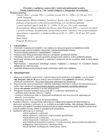 Procedury współpracy nauczycieli z rodzicami/opiekunami uczniów Szkoły Podstawowej nr 7 im. Astrid Lindgren w Stargardzie Szczecińskim Podstawa prawna: · Ustawa z dnia 7 września 1991 r. o systemie oświaty (Dz. U. z 2004 r. Nr 256, poz. 2572, z późn. zmianami) · Rozporządzenie Ministra Edukacji Narodowej i Sportu z dnia 26 lutego 2002r. w sprawie podstawy programowej wychowania przedszkolnego oraz kształcenia ogólnego w poszczególnych typach szkół. (Dz. U. z 2002r. Nr 51, poz. 458 z późn. zmianami) · Rozporządzenie Ministra Edukacji Narodowej z dnia 30 kwietnia 2007 r. w sprawie warunków i sposobu oceniania, klasyfikowania i promowania uczniów i słuchaczy oraz przeprowadzania sprawdzianów i egzaminów w szkołach publicznych (Dz. U. z 2007 r. Nr 83, poz. 562 z późn. zmianami) · Statut Szkoły · Program Wychowawczy I. 1. 2. 3. 4. 5. 6. 7. 8. Cele procedury: Ułatwianie wzajemnych kontaktów oraz nadanie im statusu programowej działalności szkoły. Sprecyzowanie systemu kontaktów nauczycieli z rodzicami/opiekunami uczniów. Tworzenie klimatu partnerstwa i współdziałania z rodzicami. Przekazywanie bieżącej informacji rodzicom o postępach i problemach dziecka.. Udzielanie wskazówek w zakresie sposobów postępowania rodziców wobec problemów dziecka. Inicjowanie nawiązywania kontaktów z rodzicami i zachęcenie ich do wyrażania opinii na temat jakości pracy szkoły. Wprowadzenie i realizowanie jednolitego systemu współpracy z rodzicami we wszystkich klasach, nadającego jej właściwą rangę. Ułatwianie monitorowania przyjętych zasad wychowania i opieki oraz współpracy. II. Opis postępowania: 1. 2. 3. 4. 5. 6. Miejscem kontaktów nauczycieli i rodziców/prawnych opiekunów jest szkoła, a na jej terenie sale lekcyjne, sala nr 3b (przy pokoju nauczycielskim) oraz gabinety (dyrektora, pedagoga, szkolnych specjalistów). Poza tymi miejscami informacji nie udziela się. Nauczyciel nie może przyjmować i udzielać informacji rodzicom w trakcie prowadzonych przez siebie zajęć szkolnych (w tym również dyżurów na korytarzach i na boisku szkolnym). Szkoła nie udziela informacji o uczniu telefonicznie. Przyjętymi formami kontaktu nauczycieli SP 7 z rodzicami/opiekunami są: - spotkania indywidualne, klasowe i ogólne, - rozmowy telefoniczne tylko w sytuacjach niezbędnych oraz kryzysowych zagrażających zdrowiu, życiu dziecka , - informacje zawarte w zeszycie do korespondencji. Kontakty rodziców z nauczycielami odbywają się według harmonogramu przedstawionego na pierwszym spotkaniu z rodzicami, tj. we wrześniu na początku każdego roku szkolnego. Harmonogram obowiązkowych spotkań i konsultacji zamieszczony jest na stronie internetowej szkoły. Dyrektor szkoły może zmienić ustalone terminy zebrań w uzasadnionych przypadkach. Spotkania odbywają się w formach: · zebrań ogólnych z rodzicami, · zebrań ogólnych z rodzicami i zaproszonymi specjalistami, · zebrań klasowych z rodzicami, · zebrań klasowych z rodzicami w obecności uczniów, · indywidualnych konsultacji rodziców z wychowawcami, nauczycielami przedmiotów, pedagogiem, kierownictwem i dyrekcją szkoły, · innych spotkań wynikających z planu pracy szkoły. 1 O obowiązkowym spotkaniu z rodzicami wychowawca jest zobowiązany przypomnieć uczniom i rodzicom, z co najmniej 5-dniowym wyprzedzeniem, podając datę, miejsce, godzinę spotkania. Uczniowie wpisują komunikat do zeszytu korespondencji. Rodzice potwierdzają przyjęcie informacji do wiadomości przez podpisanie notatki. 8. Raz w miesiącu (1. środa miesiąca) w godz. 17.00 – 18.00 każdy nauczyciel jest do dyspozycji rodziców / prawnych opiekunów na tzw. konsultacje - zgodnie z terminarzem podanym w harmonogramie spotkań. 9. Obecność rodzica na zebraniach jest obowiązkowa. Obecność rodziców/opiekunów na zebraniach ogólnych potwierdzana jest ich podpisem w dzienniku lekcyjnym lub liście obecności na zebraniu. 10. W razie nieobecności rodziców/prawnych opiekunów na zebraniu ogólnym, rodzic zobowiązany jest do kontaktu indywidualnego z wychowawcą klasy po obustronnym uzgodnieniu terminu takiego spotkania. 11. W sytuacjach uzasadnionych wychowawczo, szkoła wzywa rodziców poza ustalonymi terminami. 12. Rodzice uczniów szkoły mają możliwość dodatkowego kontaktu z nauczycielami w przypadkach uzasadnionych losowo, jednak po uprzednim uzgodnieniu takiego spotkania z nauczycielem (poprzez wpis do zeszytu korespondencji ucznia). 13. Wychowawca w nagłych sytuacjach kryzysowych może skontaktować się z rodzicami telefonicznie lub pisemnie w zeszycie do korespondencji, a w sytuacjach braku możliwości w/w kontaktów w formie pisemnej za pośrednictwem sekretariatu szkoły. 14. Nieobecność ucznia w szkole powyżej 2 dni rodzice (prawni opiekunowie) zgłaszają telefonicznie lub emailem wychowawcy klasy w pierwszym dniu nieobecności. 15. Wychowawca klasy w 3. dniu nieobecności ucznia w szkole i w razie braku informacji od rodziców/prawnych opiekunów, powiadamia telefonicznie o tym fakcie rodziców (prawnych opiekunów). 16. Nieobecność ucznia w szkole rodzice / prawni opiekunowie usprawiedliwiają pisemnie w zeszycie do korespondencji w ciągu tygodnia od momentu powrotu ucznia do szkoły. 17. Zwolnienie ucznia z zajęć następuje tylko na pisemną prośbę rodziców/opiekunów prawnych, przedstawioną najpóźniej wychowawcy w dniu zwolnienia z podaniem istotnej przyczyny. W sytuacjach wyjątkowych (nieobecność wychowawcy) decyzje o zwolnieniu ucznia z zajęć podejmuje dyrektor lub wicedyrektor szkoły. 18. Rodzice / prawni opiekunowie pozostawiają wychowawcy kontaktowy numer, który jest wpisany do dziennika lekcyjnego. Rodzice w przypadku zmiany numeru telefonu zobowiązani są do poinformowania o tym fakcie wychowawcę i podania nowego numeru. 19. Wychowawca klasy utrzymuje kontakt z rodzicami w formach: · zebrań z rodzicami, · pisemnych informacji w zeszycie do ko
