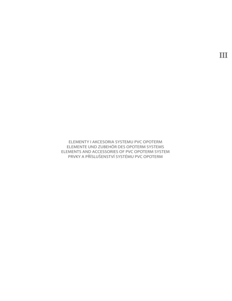 III ELEMENTY I AKCESORIA SYSTEMU PVC OPOTERM ELEMENTE UND ZUBEHÖR DES OPOTERM SYSTEMS ELEMENTS AND ACCESSORIES OF PVC OPOTERM SYSTEM PRVKY A PŘÍSLUŠENSTVÍ SYSTÉMU PVC OPOTERM KODY KOLORÓW DIE FARBCODES COLOR CODES KÓDY BAREV x 00 02 03 08 09 20 23 25 26 28 30 31 32 33 50 52 53 54 55 57 58 66 67 Kolor | Farbe | Colour | Barva nielakierowany | unlackiert | mill finish | nelakovaná biały | weiß | white | bílá szary | grau | grey | šedá ciemnobrązowy | dunkelbraun | dark brown | tmavě hnědá brązowy | braun | brown | hnědá czarny | schwarz | black | černá szary antracyt | anthrazitgrau | anthracite grey | antracitová šedá szary antracyt gładki | anthrazitgrau glatt | smooth anthracite grey | antracitová šedá hladká mahoń | mahagoni | mahogany | mahagon orzech | nuss | nut | ořech złoty dąb | goldeiche | golden oak | zlatý dub jasny szary | hellgrau | light grey | světle šedá karmel | karamel | caramel | karamel bazaltowy szary | basaltgrau | basalt grey | bazaltová šedá oregon | Oregon | oregon | oregon winchester | Winchester | winchester | winchester dąb ciemny | dunkel Eiche | dark oak | tmavý dub palisander | Palisander | palisander | palisandr czekoladowy brąz | schokoladenbraun | chocolate brown | čokoládově hnědá szary | grau | grey | šedá dąb bagienny | sumpfeiche | swamp oak | bahenní dub kremowy biały | cremeweiß | white cream | krémově bílá ciemny zielony | tannengrün | fir green | tmavě zelená RAL* 7038 8019 9005 7016 * - kody kolorów RAL oznaczają kolory najbardziej zbliżone do kolorów rzeczywistych | die Code von RAL Farben bedueten die Farben, die am besten die wirklichen Farben darstellen | RAL colour codes mean the colours, which are most similar to the real colours | Kódy barev RAL označují barvy, které se nejvíce přibližují barvám skutečným Zastrzegamy sobie prawo do zmian technicznych. Stan na dzień 2016.09.01 Technische Änderungen vorbehalten. Stand 2016.09.01 We reserve the right to any technical change. Valid on 2016.09.01 Právo na technické změny vyhrazeno. Stav ke dni 2016.09.01 III/1 KODY ELEMENTÓW CODES DER ELEMENTEN CODES OF ELEMENTS KÓDY PRVKŮ Elementy i akcesoria systemu PVC OPOTERM | Elemente und Zubehör des Systems PVC OPOTERM | Elements and accessories of PVC OPOTERM system | Prvky a příslušenství systému PVC Opoterm 00 02 03 08 09 20 23 25 26 28 30 31 32 33 50 52 53 54 55 57 58 66 67 PB PBM NPB NOPB PBW PBMW SP SPM PSB PSBO PSBA PSG PSRD PSD PSDW PSPD PSA PSAW PSZ PP 60/12 PP 60/17 PPM 60/12 PPM 60/17 PPA 35/12 PPA 35/17 PPAM 35/12 PPAM 35/17 PPD 60/12 PPD 60/17 PPDM 60/12 PPDM 60/17 PPD-P 60/12 PPD-P 60/17 PPDM-P 60/12 PPDM-P 60/17 PPDA 60/12 PPDA 60/17 PPDA-P 60/12 PPDA-P 60/17 SLMI SLMA PP NT ZPPD ZPPDM ZPPA ZPPAM U/PSD U/PSB/R U/PSB/M EAH SET × × × × × × × × × × × × × × × × R RS R R R RS RS RS R R RS RS × × × × × × × R R R R R R R R R R R R R R R R R R R R × × × × × × × × × × × × × × × × × × × × R R R R R R R R R R R R R R R R R R R R R R × × × × × × × × × × × × × × × × × × × × × × × × × × × × × × × × × × × × × R R R R R R R R R R R R R R R R R R R R R R R R R R R R R R R R R R R R R R R R R R R R R R R R R R R R R R R R R R R R R R R R R R R R R R R R R R R R R R × × × × × × × × × × × × × × × × × × × × R × × × × × × × × R - Oklejane folią dekoracyjną | mit Dekorfolie furniert | Decorative foil | Polep dekorativní folií S - Kolor specjalny na zamówienie | spezielle Farbe – auf Kundenwunsch | Special colour on request | Speciální barva na objednávku III/2 Zastrzegamy sobie prawo do zmian technicznych. Stan na dzień 2016.09.01 Technische Änderungen vorbehalten. Stand 2016.09.01 We reserve the right to any technical change. Valid on 2016.09.01 Právo na technické změny vyhrazeno. Stav ke dni 2016.09.01 Kolory oklein | Dekorfolie | Decorative foils colours | Barvy dýh Grupa 1 – kolory będące w stałej ofercie | Gruppe 1 – Standardfarben | 1st group – colours available in our standard offer | Třída 1 - barvy stálé nabídky Kode Kolor: Farbe: Colour: Barva: x = 23R szary antracyt anthrazitgrau anthracite grey antracitová šedá x = 26R mahoń mahagoni mahogany mahagon x = 28R orzech nuss walnut ořech x = 30R złoty dąb goldeiche golden oak zlatý dub x = 52R winchester winchester winchester winchester x = 53R dąb ciemny eiche dunkel dark oak tmavý dub Grupa 2 – kolory na zamówienie - czas oczekiwania 2 tygodnie | Gruppe 2 – Sonderfarben auf Bestellung- Wartezeit beträgt 2 Wochen | 2nd group – colours for extra order – lead time around 2 weeks | Třída 2 - barvy na objednávku - doba čekání 2 týdny Kode Kolor: Farbe: Colour: Barva: x = 25R szary antracyt - gładki anthrazitgrau - glatt anthracite grey - smooth antracitová šedá hladká x = 33R bazaltowy szary basaltgrau basalt grey čedičová šedá x = 50RB oregon oregon oregon pine 4 oregon x = 54RB palisander schwarzbraun black brown palisandr x = 55RB czekoladowy brąz schokobraun chocolate brown čokoládově hnědá x = 56RB dąb ST-G eiche ST-G oak ST-G dub ST-G x = 57RB szary grau grey šedá x = 58RB dąb bagienny mooreiche swamp oak bahenní dub x = 59RB dąb naturalny eiche natur natural oak přírodní dub Grupa 3 – kolory na zamówienie - czas oczekiwania 3 tygodnie - cena wyższa o 15% | Gruppe 3 – Sonderfarben auf Bestellung- Wartezeit beträgt 3 Wochen - Zuschlag 15% | 3rd group – colours for extra order – lead time around 3 weeks – prices higher additionally 15% | Třída 3 - barvy na objednávku - doba čekání 3 týdny - cena o 15% vyšší Kode Kolor: Farbe: Colour: Barva: x = 13RC zielony grün green zelená x = 31RC jasny szary hellgrau light grey světle šedá x = 61RC siena rosso siena PR siena PR siena rosso x = 62RC siena noce siena PN siena PN siena noce x = 63RC daglezja streifen-douglasie stripe douglas douglaska x = 64RC sos